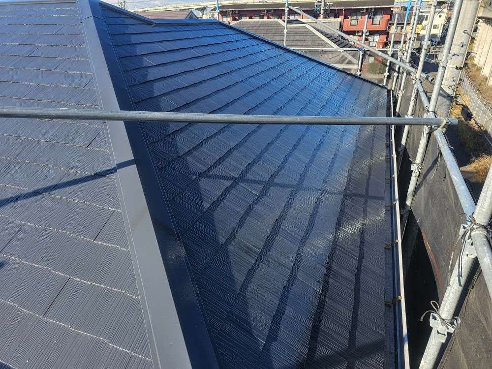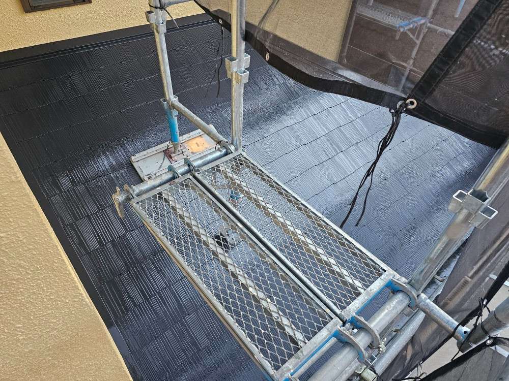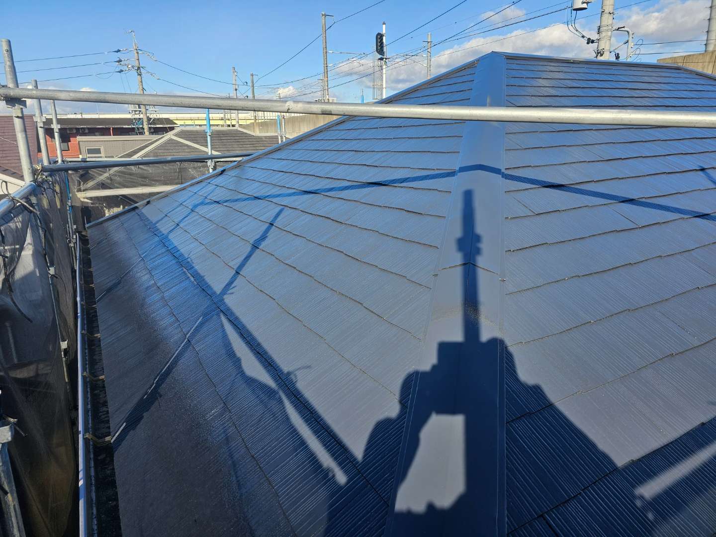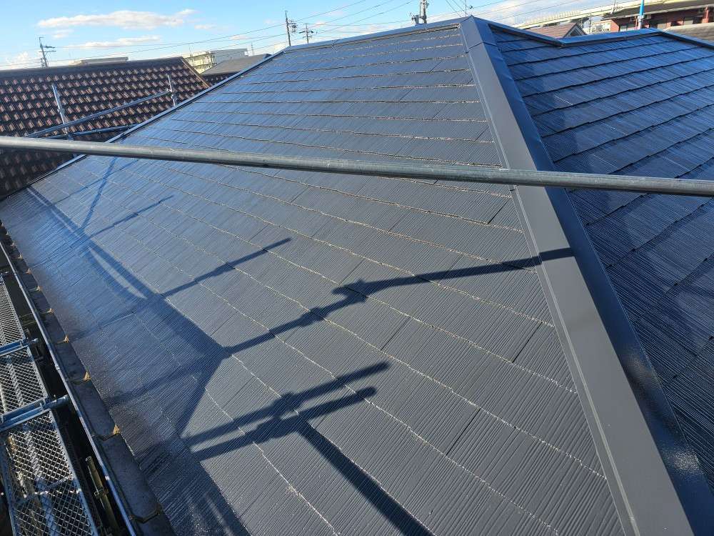 春日井市のI様邸の昨日の作業内容は、屋根の上塗り塗装・軒天の2回目塗装作業を
