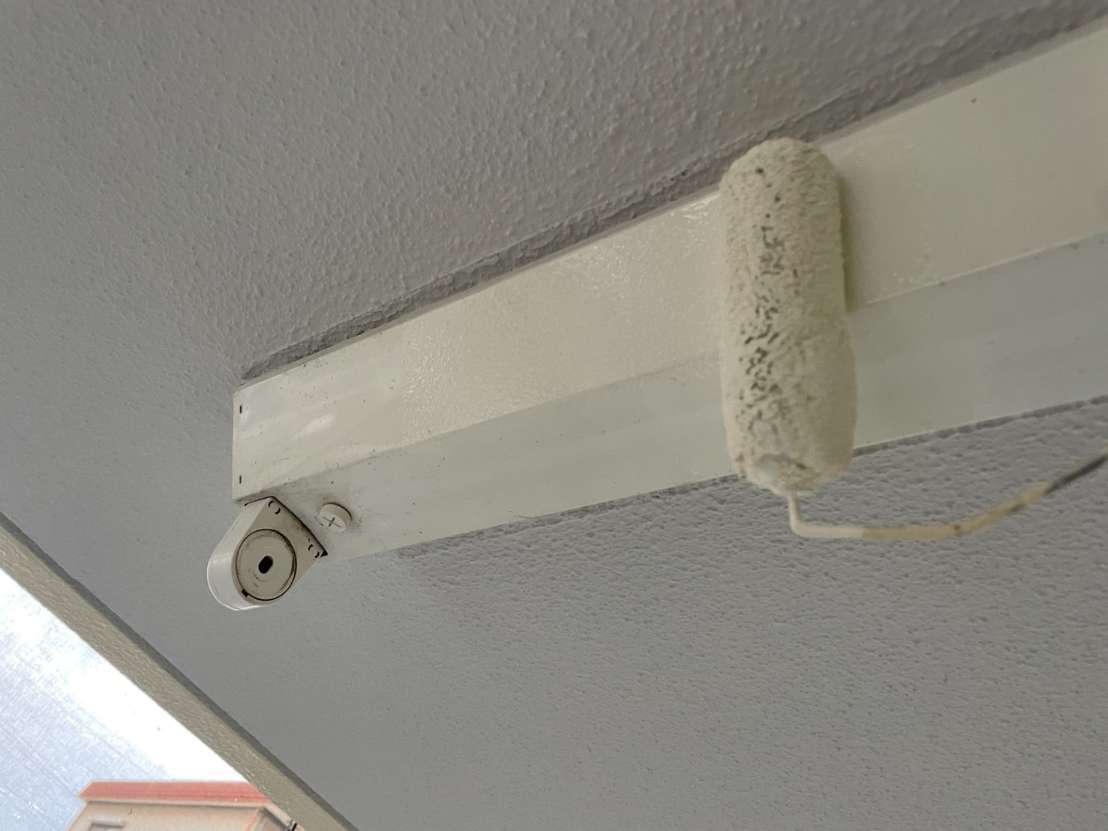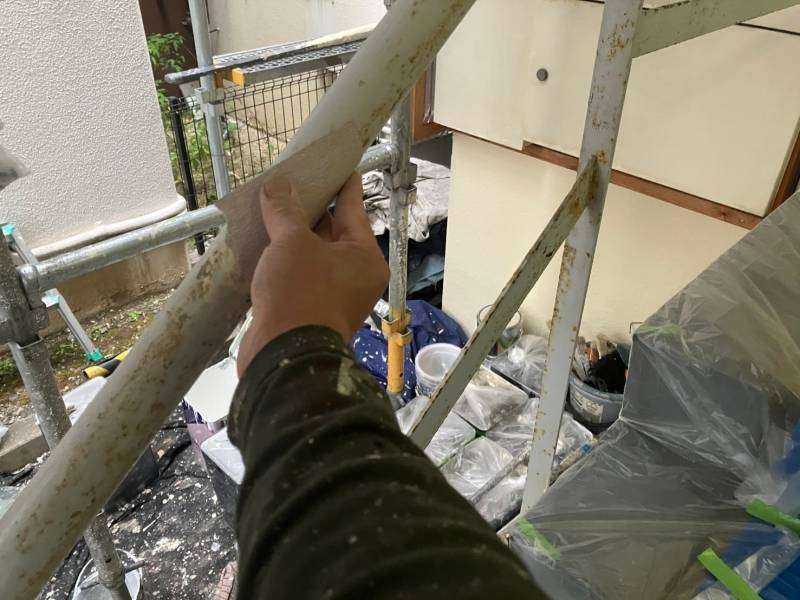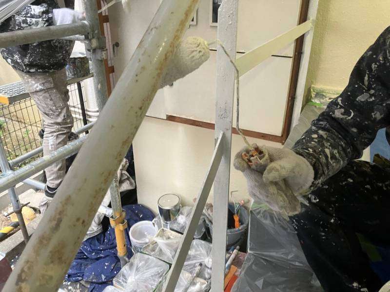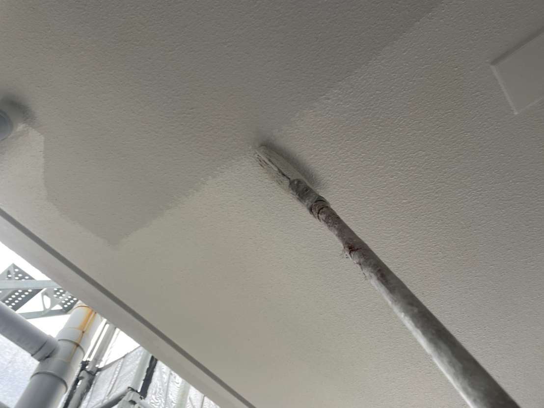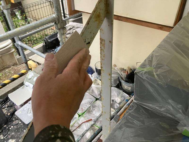 軒天の2回目塗装・外壁の中塗り塗装・付帯部の鉄部塗装作業で、ケレン、錆止め塗装錆止め塗装を行っていました。
