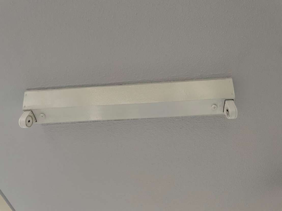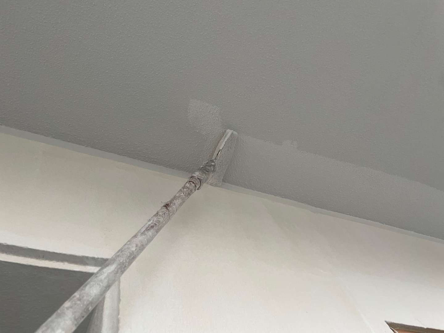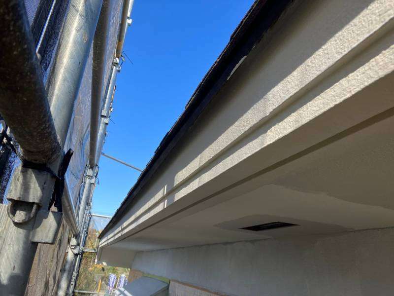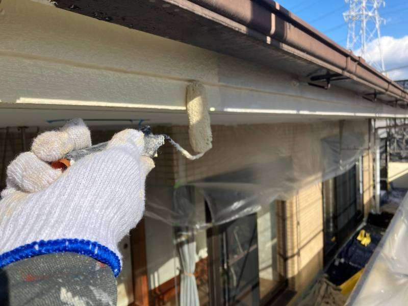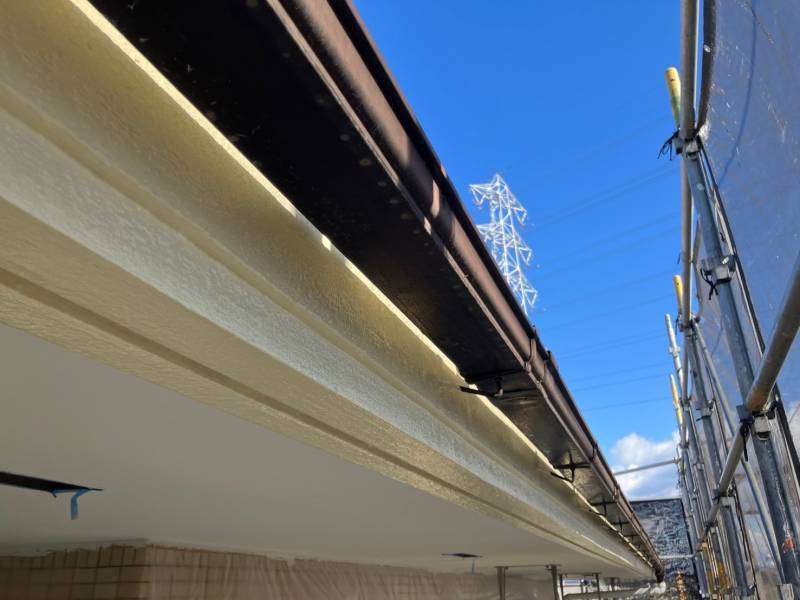 軒天の2回目塗装・外壁の中塗り塗装・付帯部の鉄部塗装作業で、ケレン、錆止め塗装錆止め塗装を行っていました。