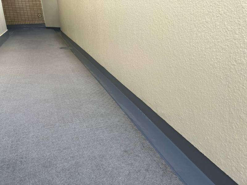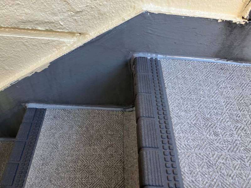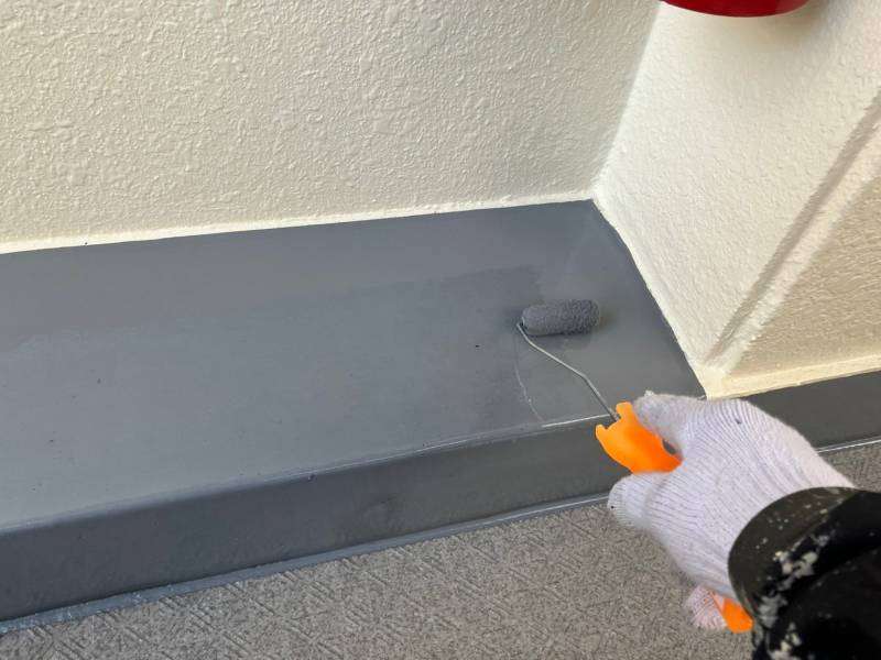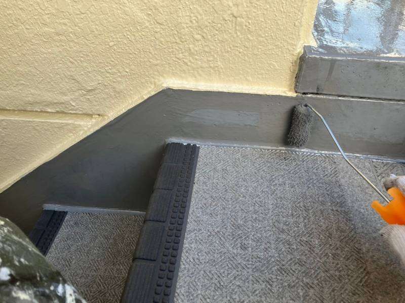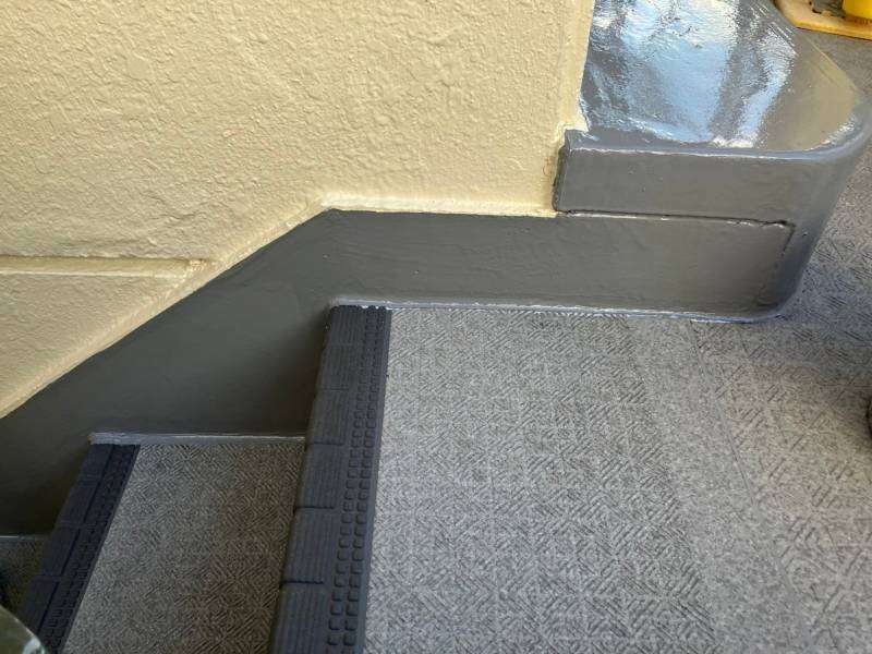 通路階段部の立上り・側溝部のトップコート塗装作業を行っていました。