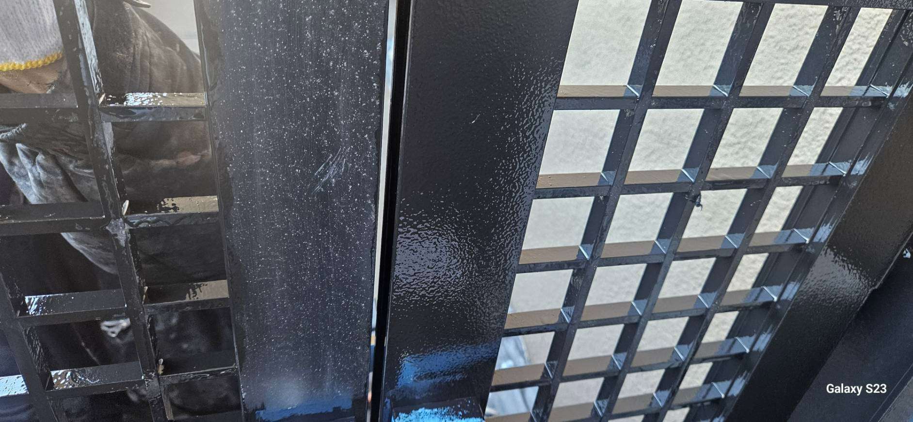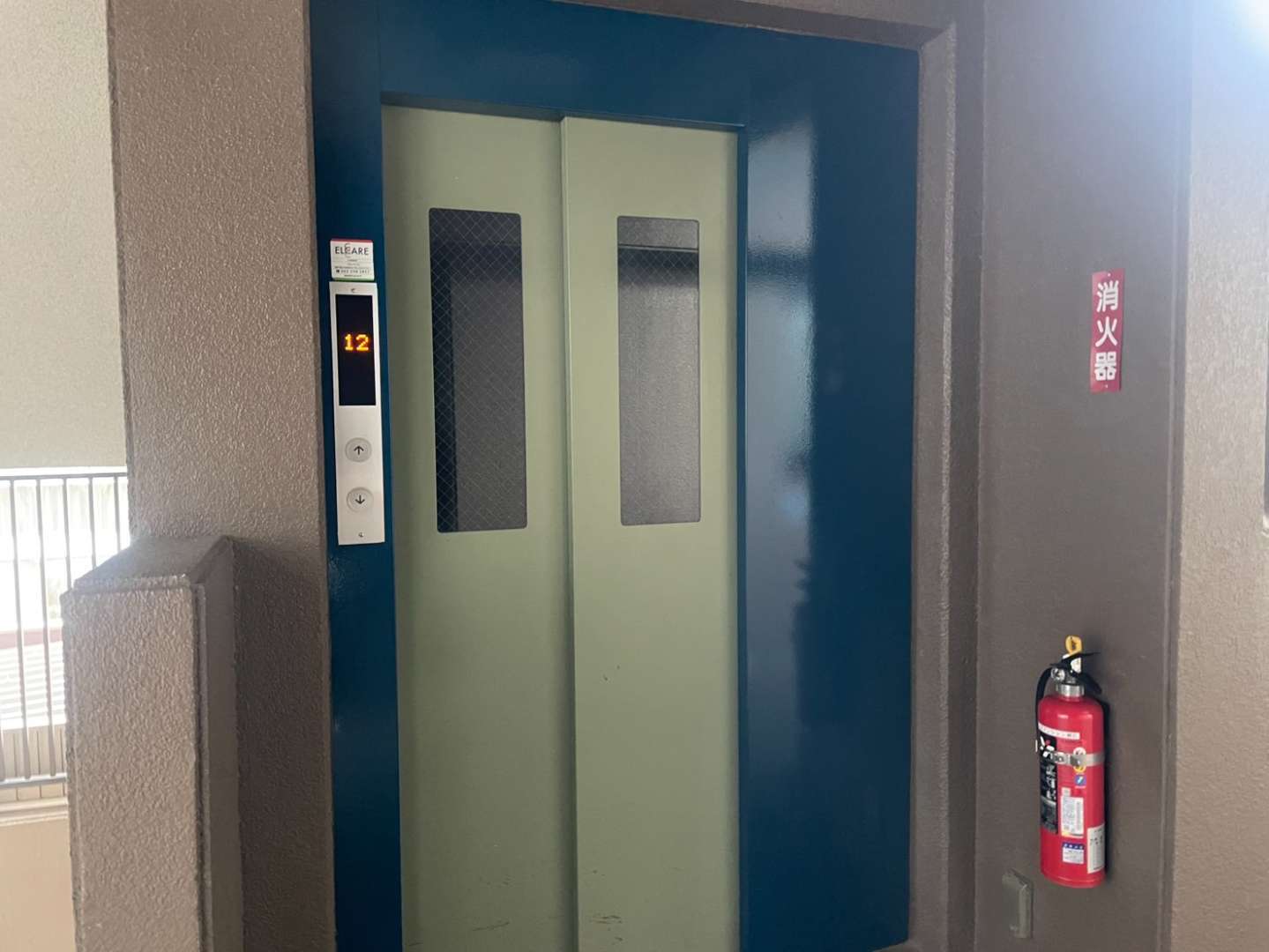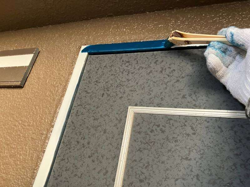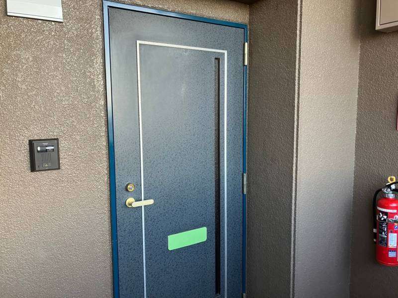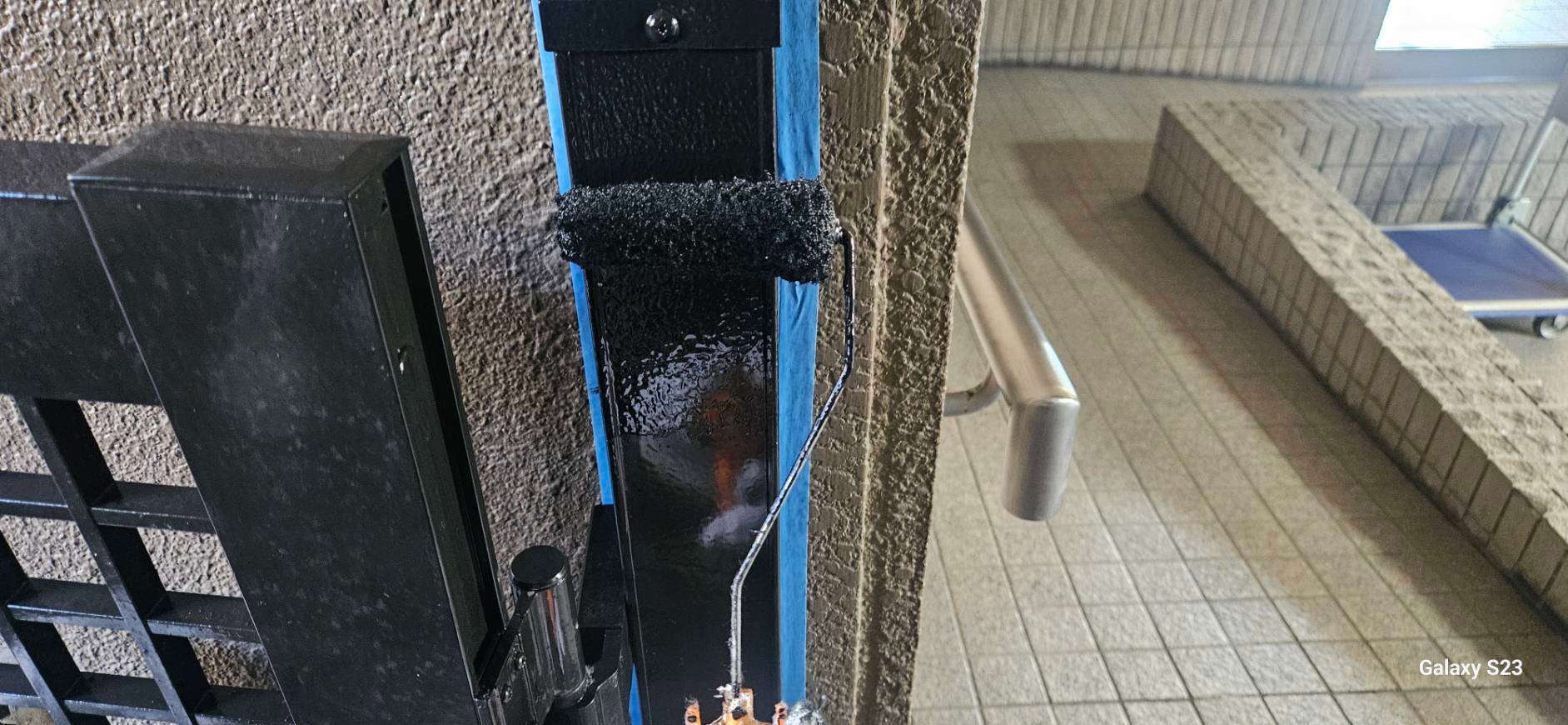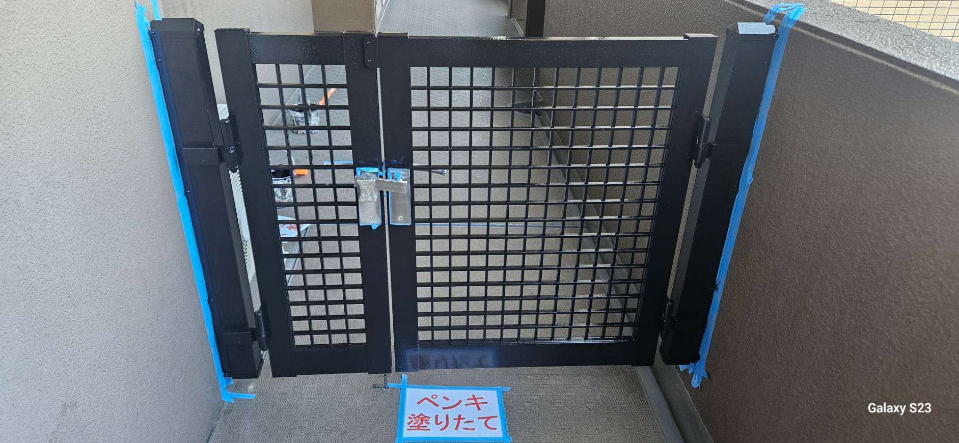 守山区のRマンション様の昨日の作業内容は、1F~4Fの鉄部(玄関ドア枠・エレベーター枠・門扉)の中塗り・上塗り塗装と5Fの鉄部のケレン作業を行いました。