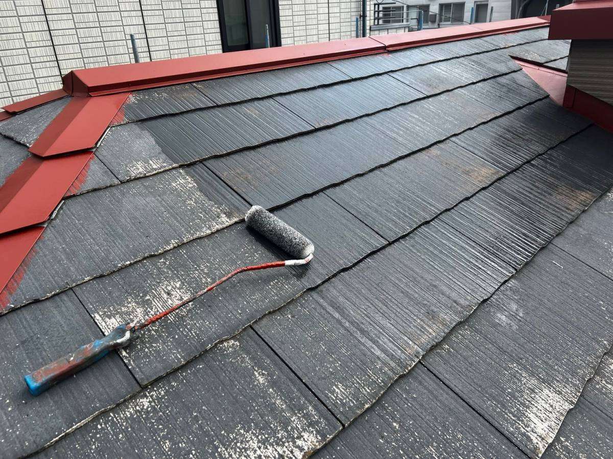 屋根の下塗り塗装・棟板金サビ止め塗装・雨樋の1回目塗装作業を