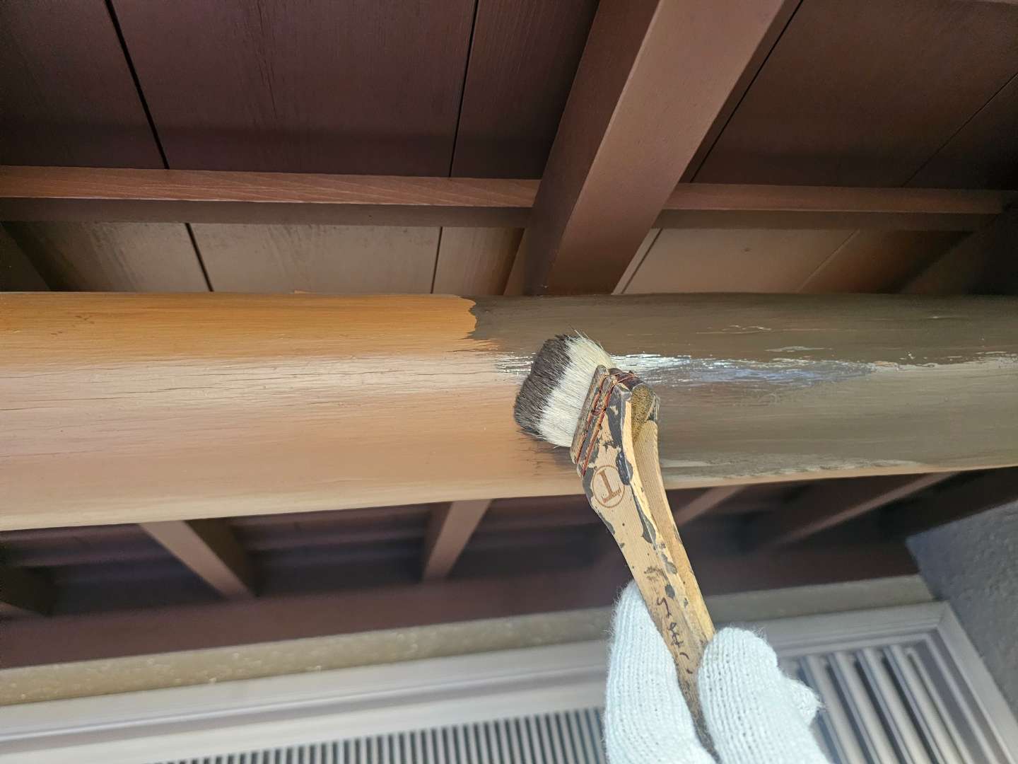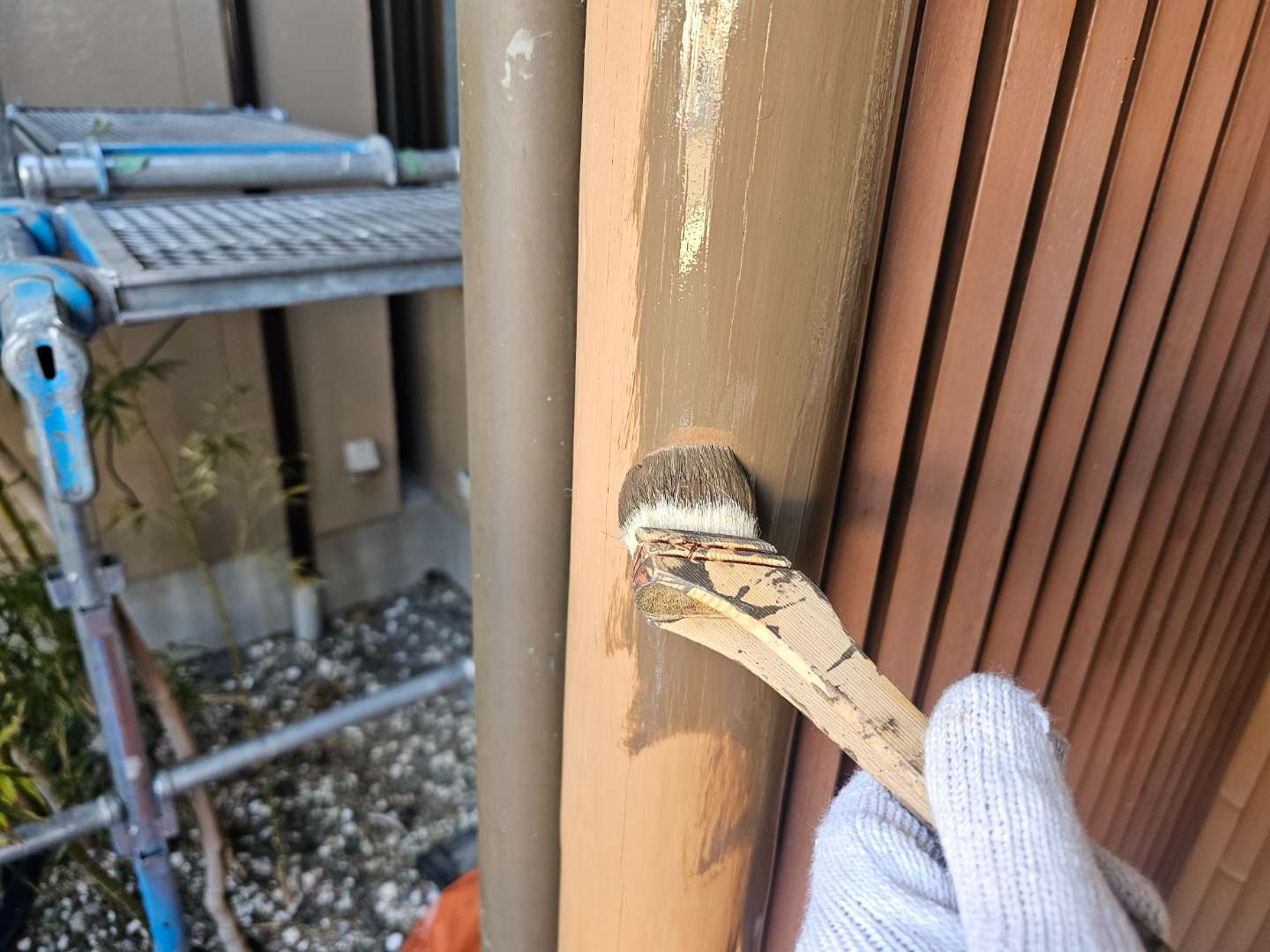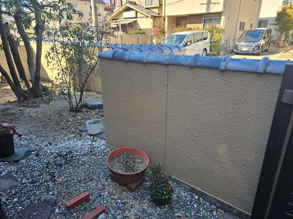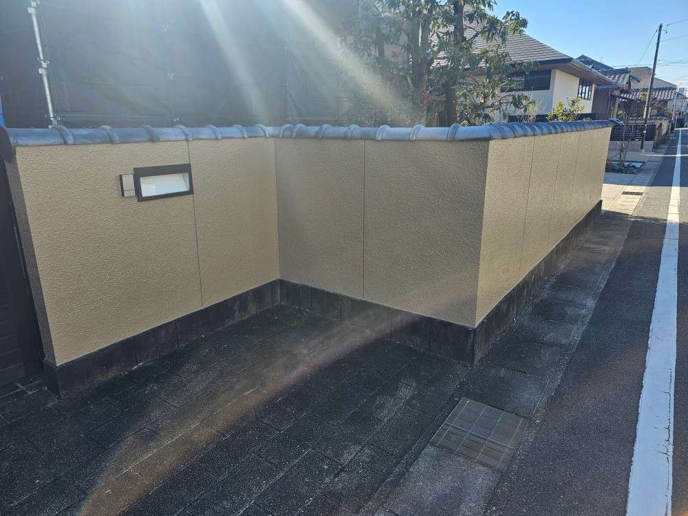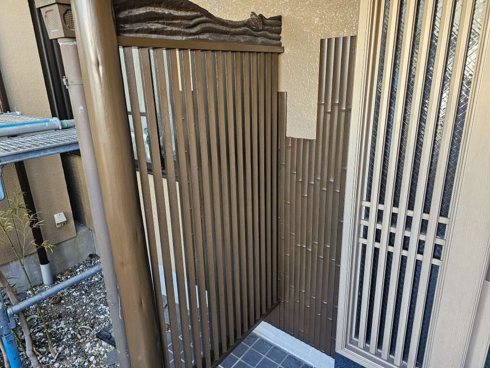 春日井市U様邸の昨日の作業は、塀の上塗り塗装と玄関周りの木部塗装作業を行っています。