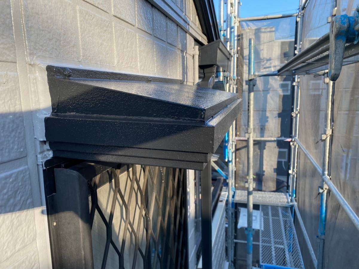 東区U様邸の昨日の作業内容は、屋根上塗り塗装、手すり・笠木部のケレン、コーキング(シーリング)、プライマー塗装、付帯部の庇部分下塗り塗装、中塗り塗装を行っています。