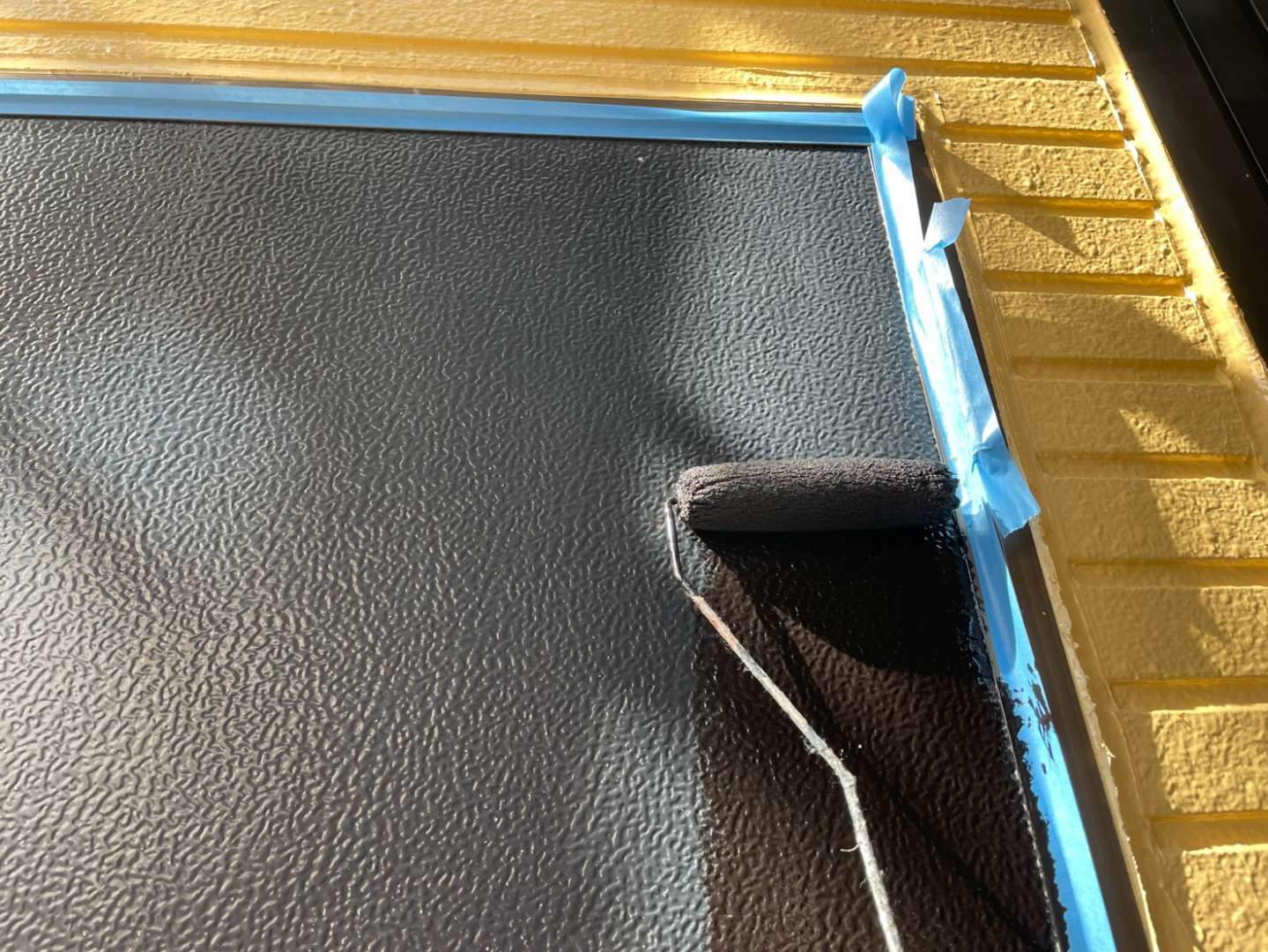 破風板・鼻隠し板・雨樋・ベランダ鉄部格子の上塗り塗装と雨戸・シャッターボックスの中塗り塗装と水切りの中塗り・上塗り塗装と勝手口のサビ止め・中塗り・上塗り塗装です。