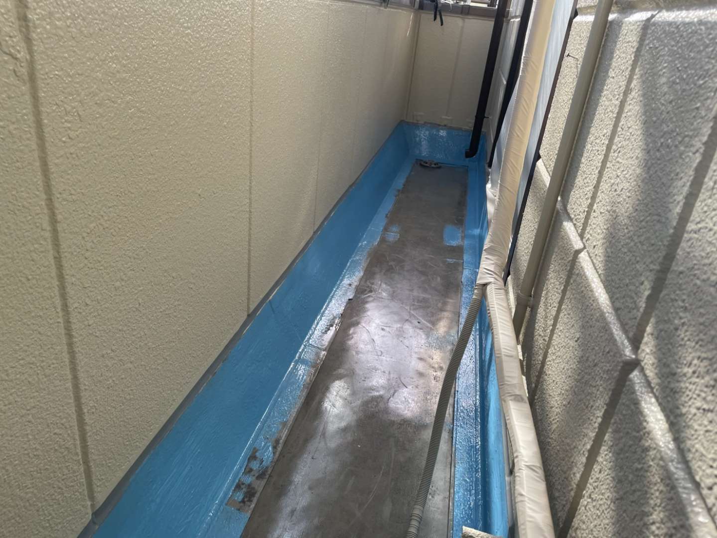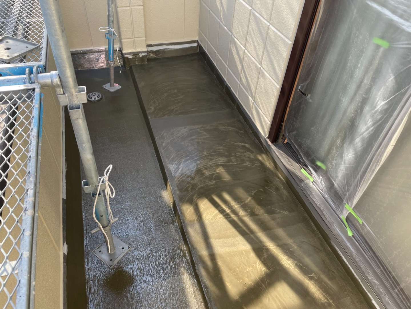 北区K様邸の今日の作業は、ベランダウレタン防水工事の下地処理作業、プライマー塗布作業、立上り部のウレタン樹脂1層目塗装作業を行っています。