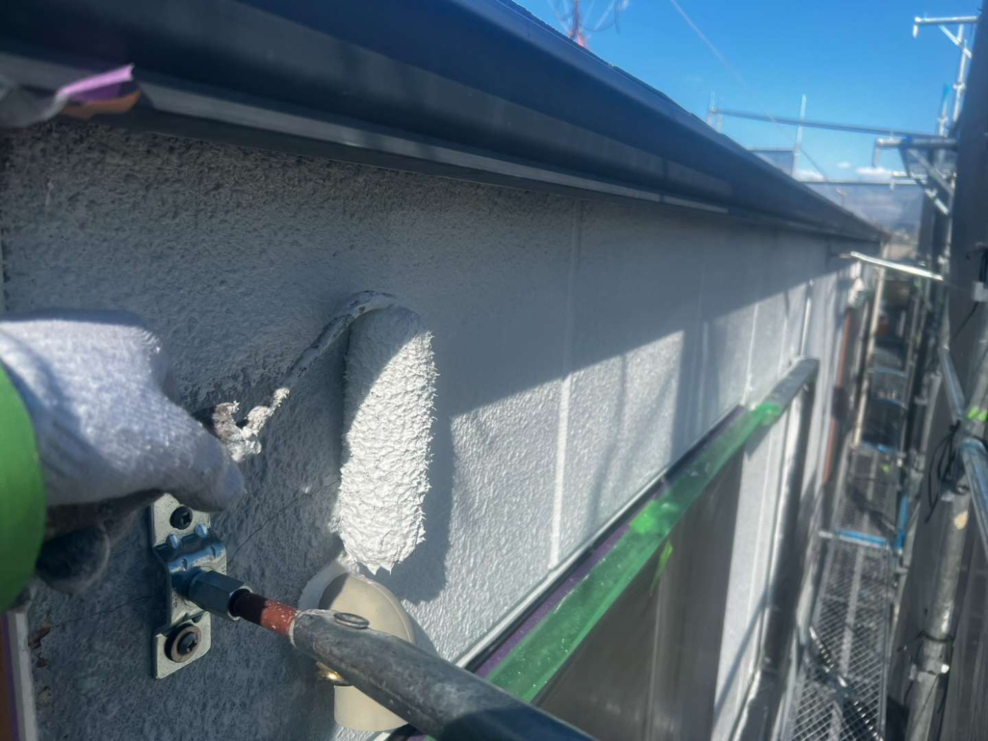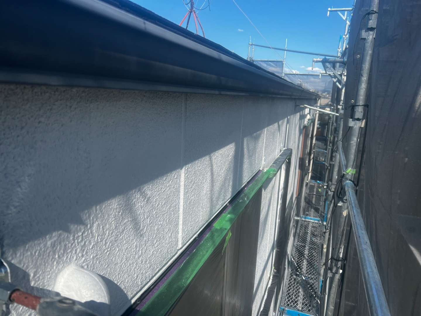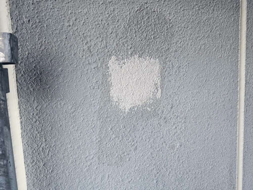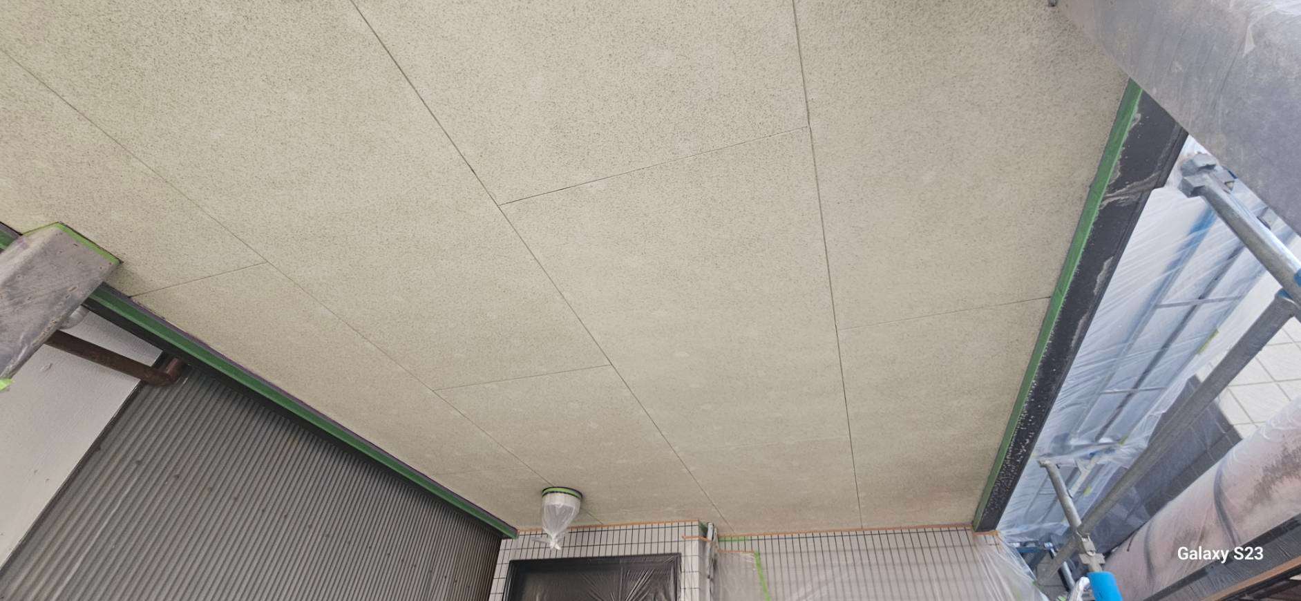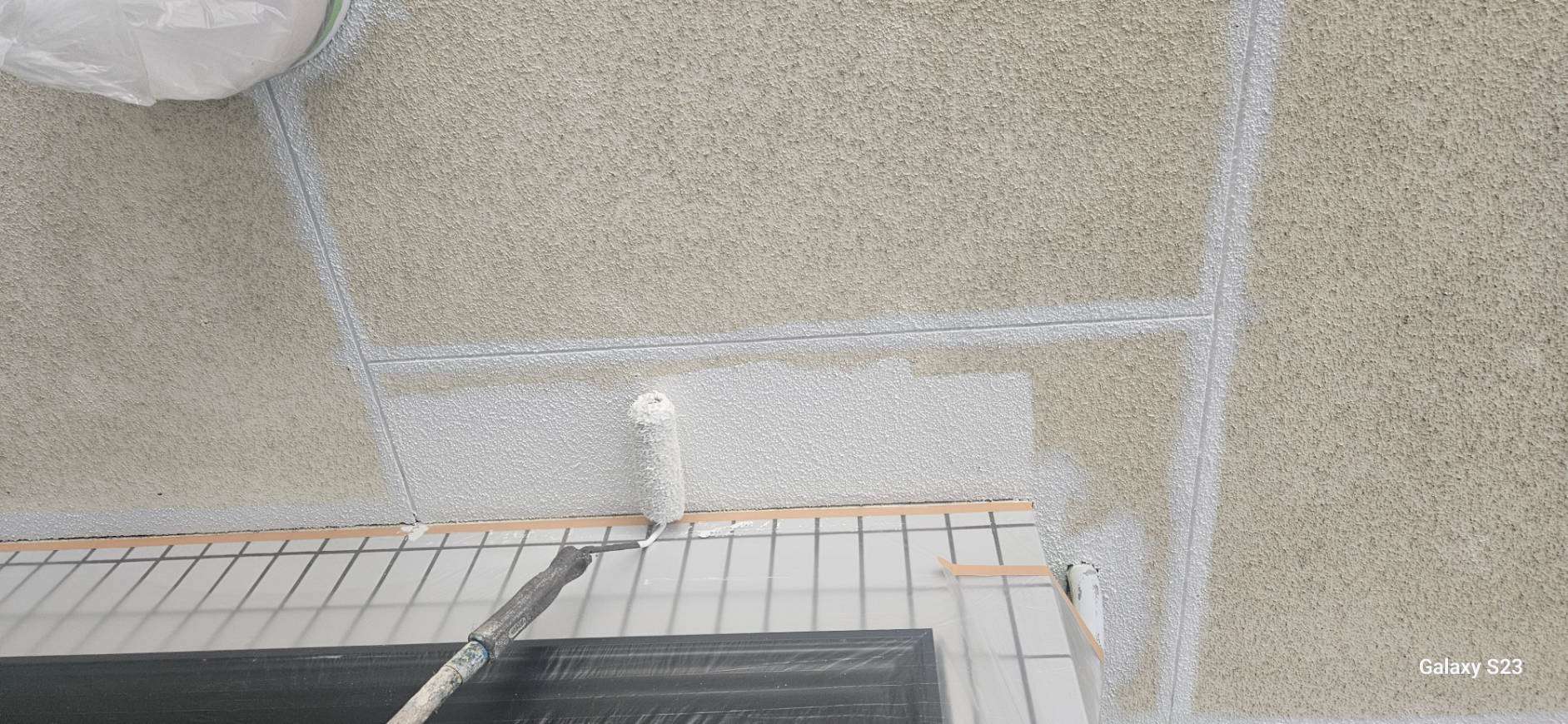 W様邸の作業は、クラックパテ補修後に柄付け作業・タイルの補修作業・外壁の下塗り塗装・屋根の中塗り塗装・軒天の上塗り1回目、2回目塗装作業を行っていました。