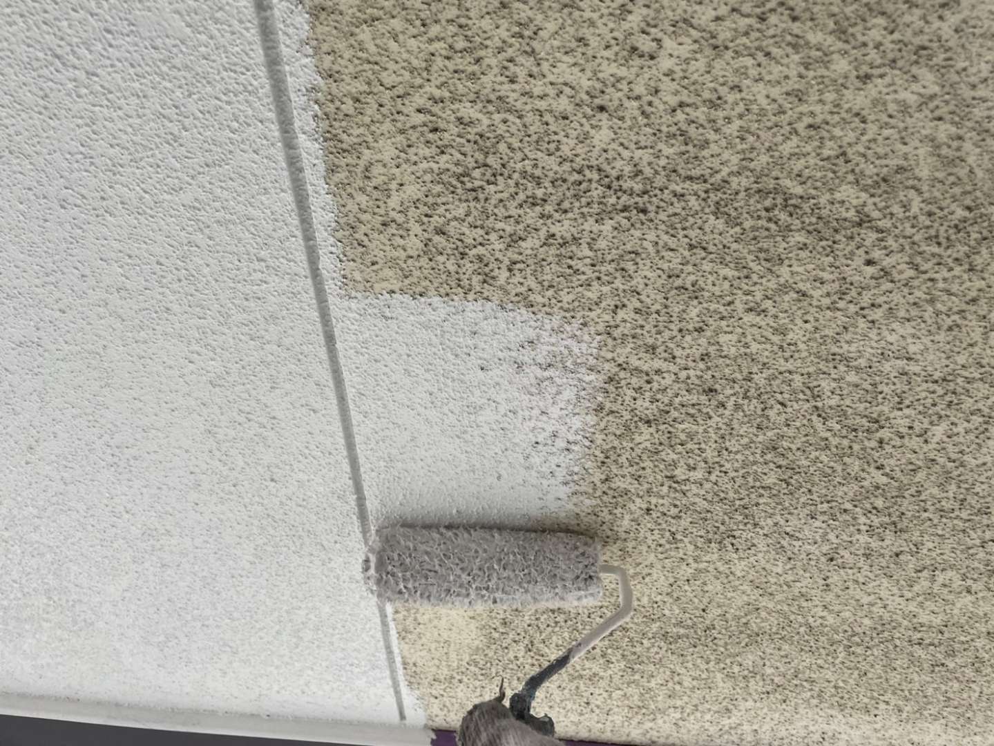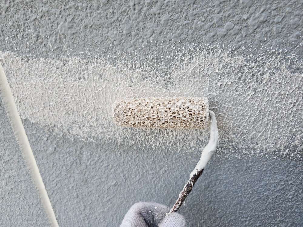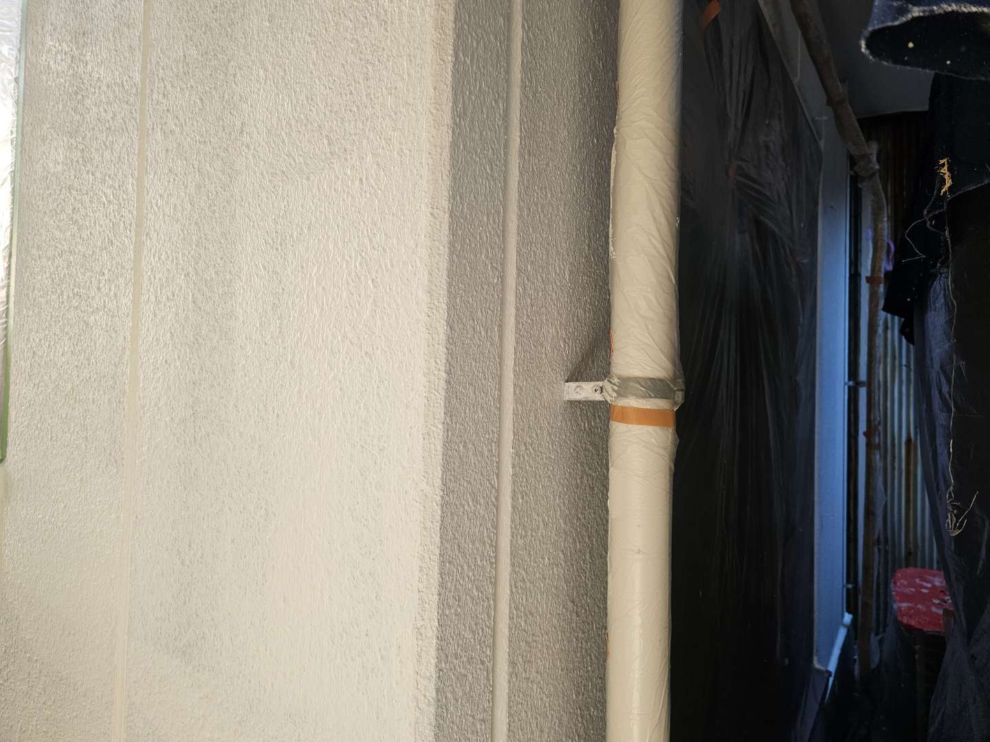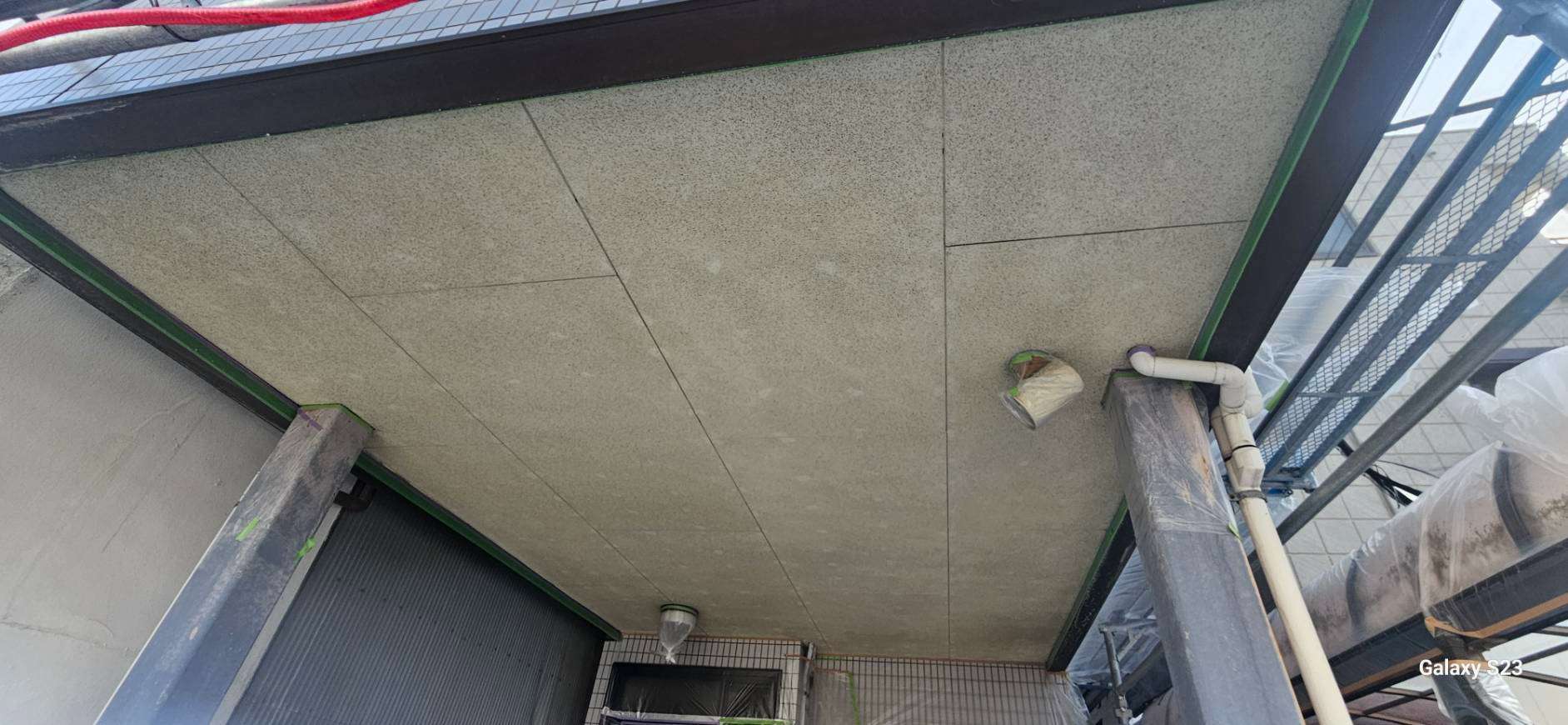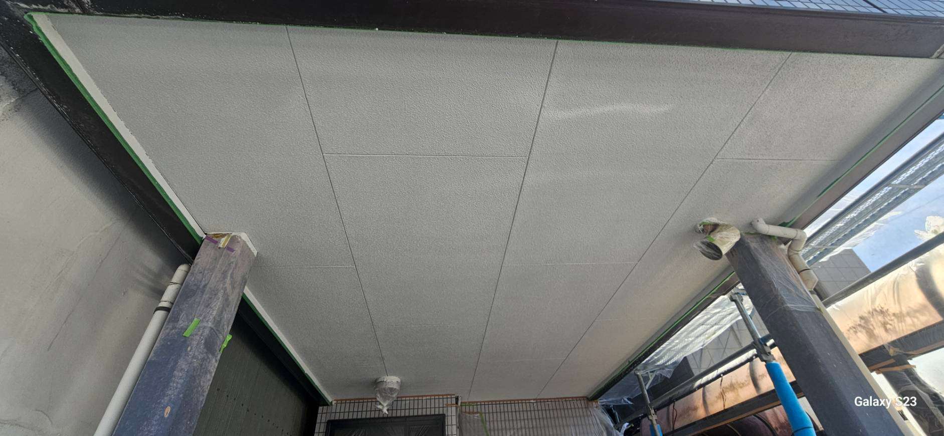 W様邸の作業は、クラックパテ補修後に柄付け作業・タイルの補修作業・外壁の下塗り塗装・屋根の中塗り塗装・軒天の上塗り1回目、2回目塗装作業を行っていました。