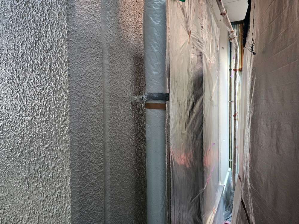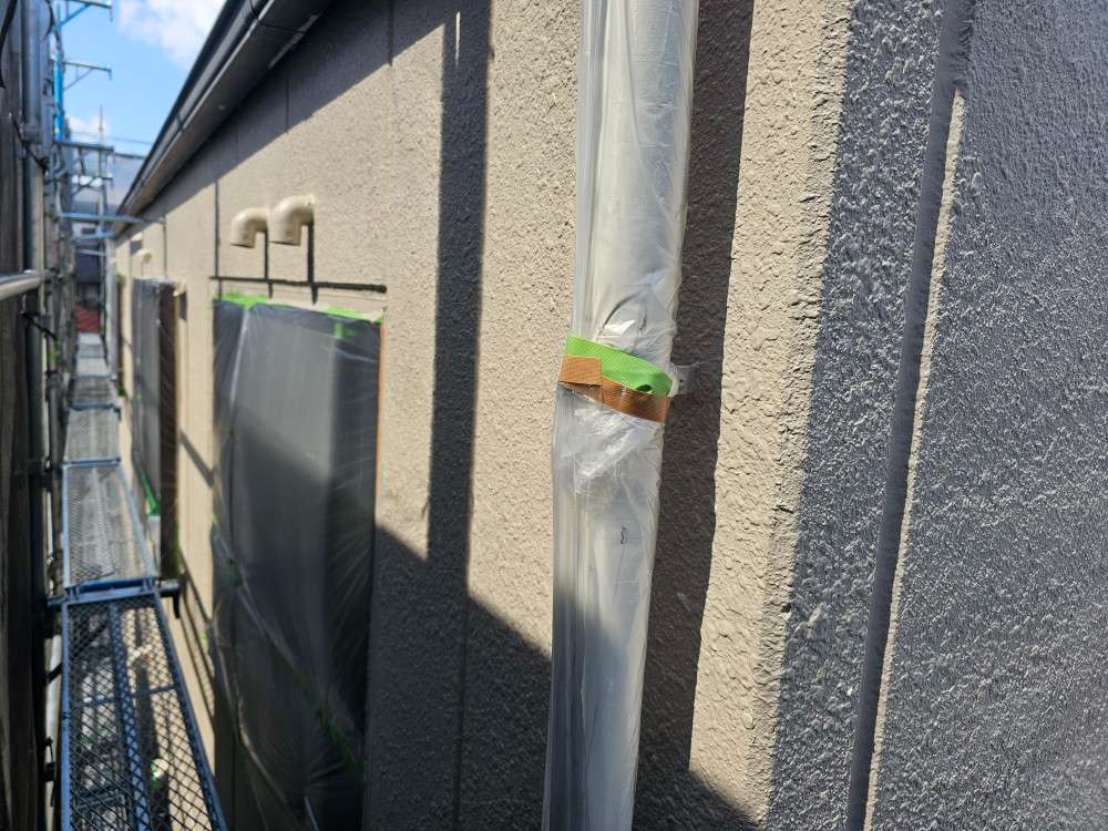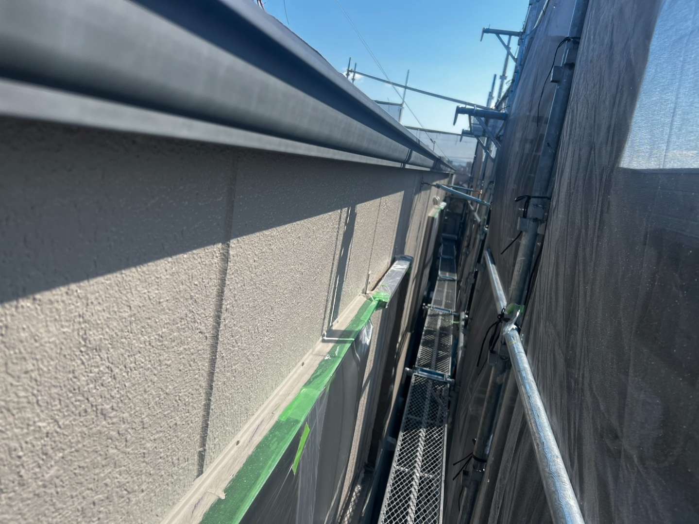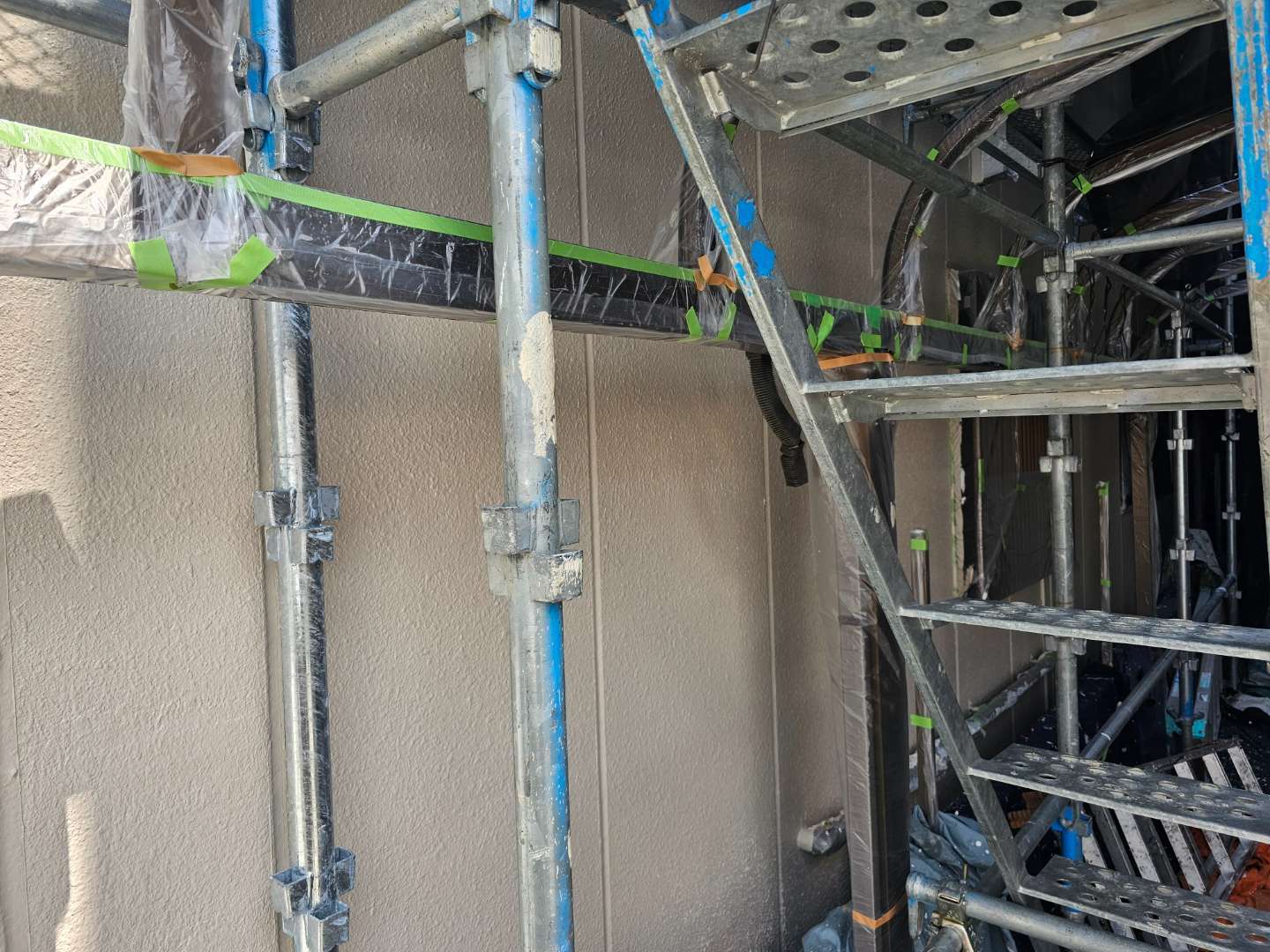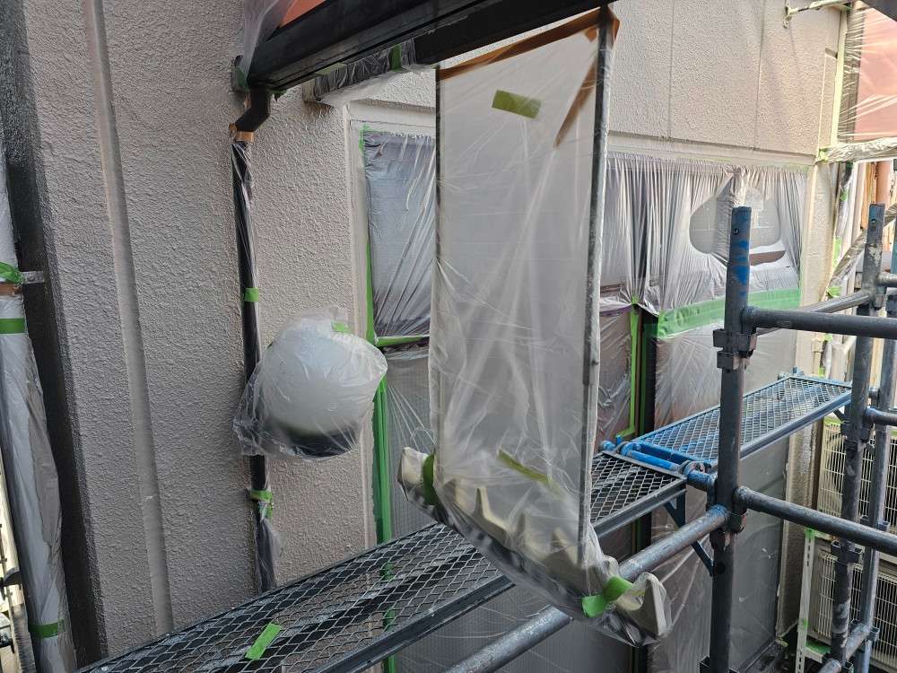 今日の作業は、外壁の上塗り塗装・付帯部塗装作業予定です。