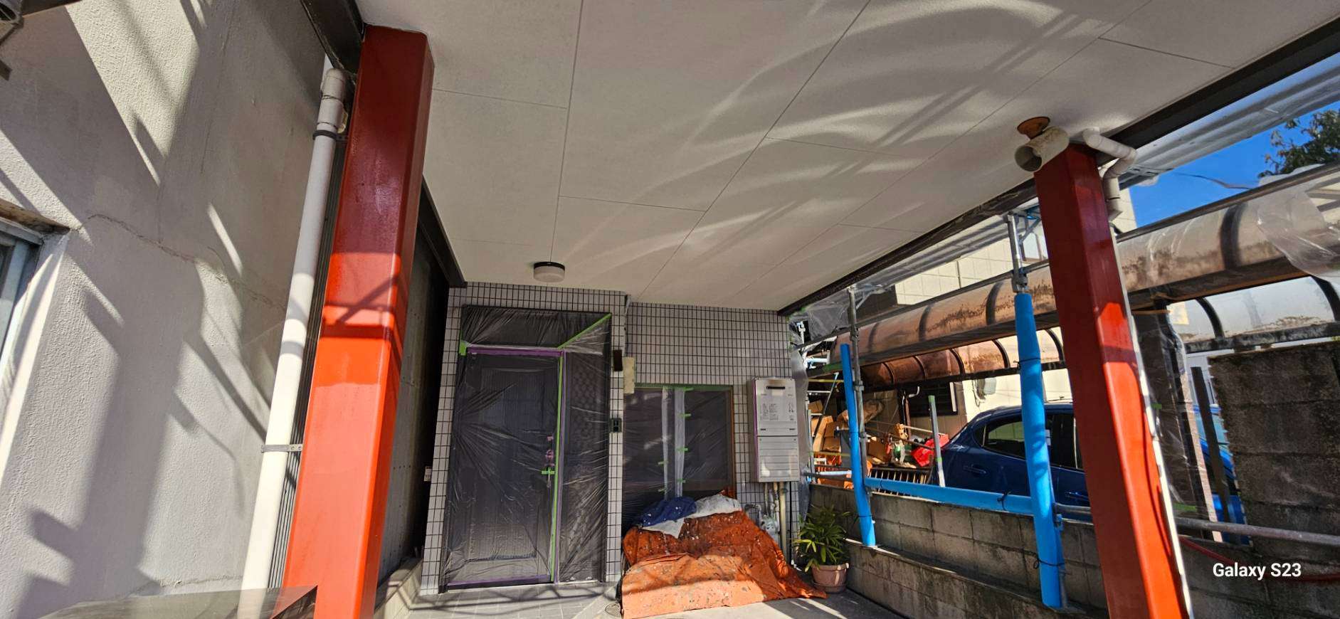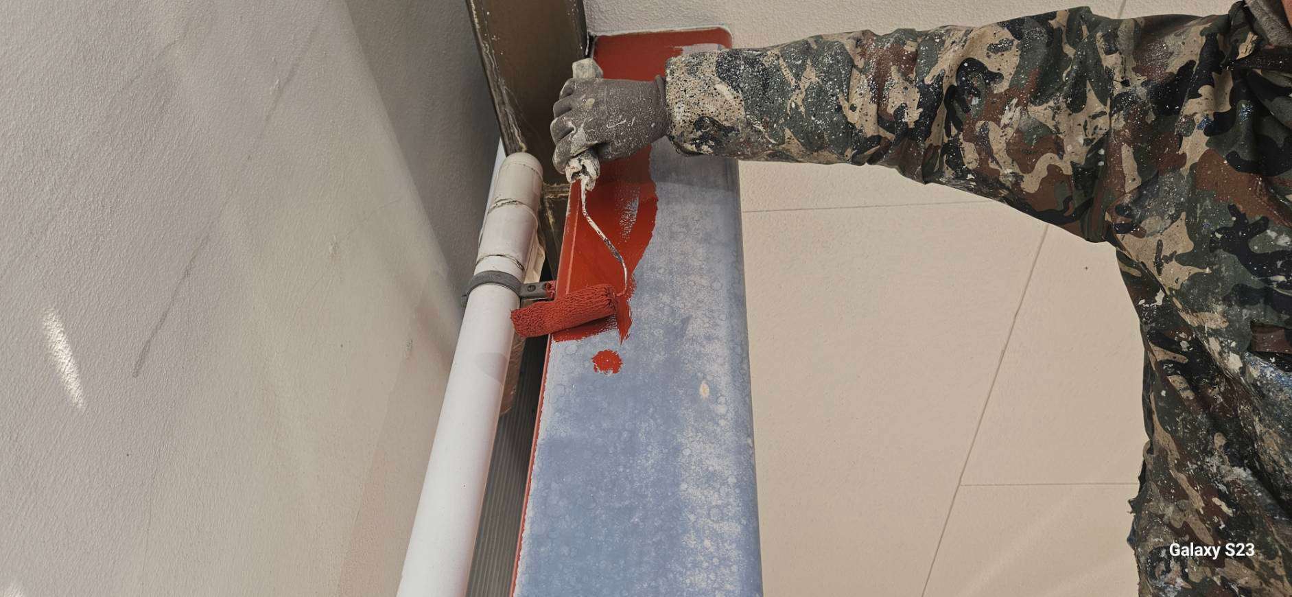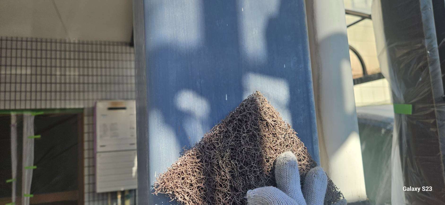 W様邸の昨日の作業は、外壁の中塗り塗装・屋根の上塗り塗装・タイル部の目地補修・鉄柱のケレン・錆止め塗装作業を行っていました。