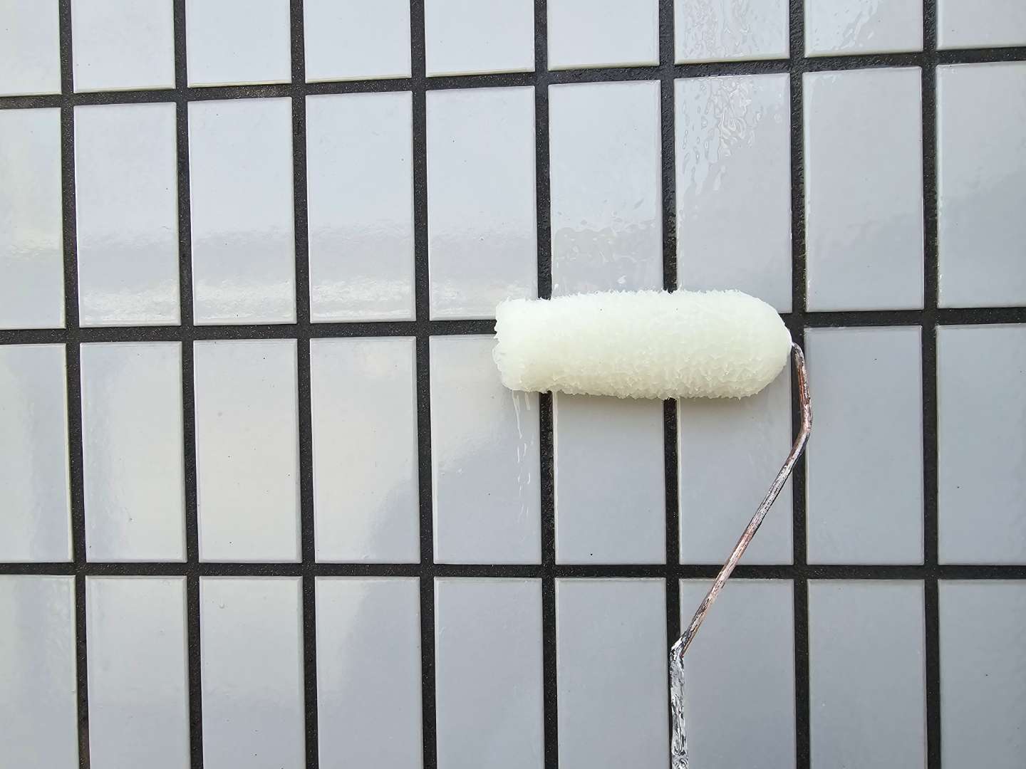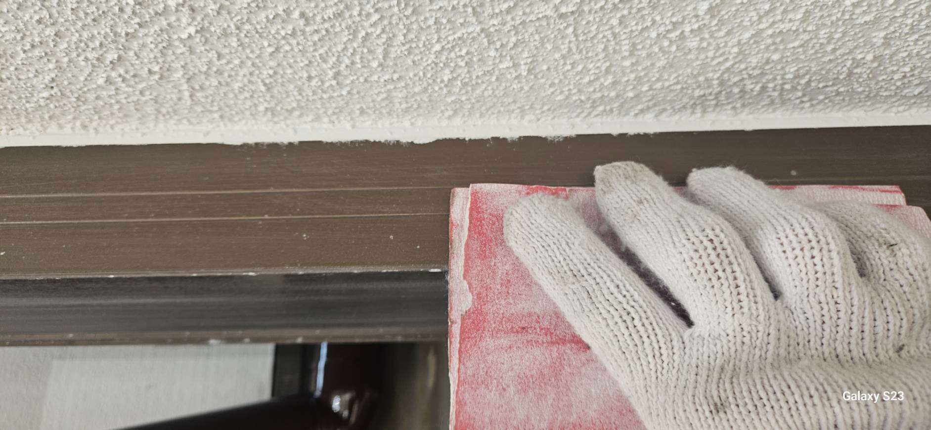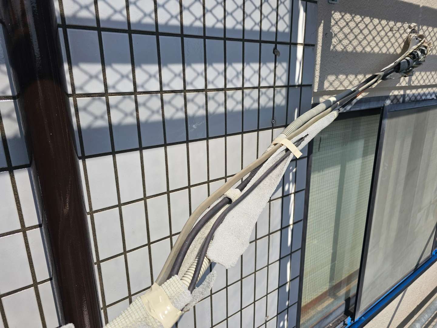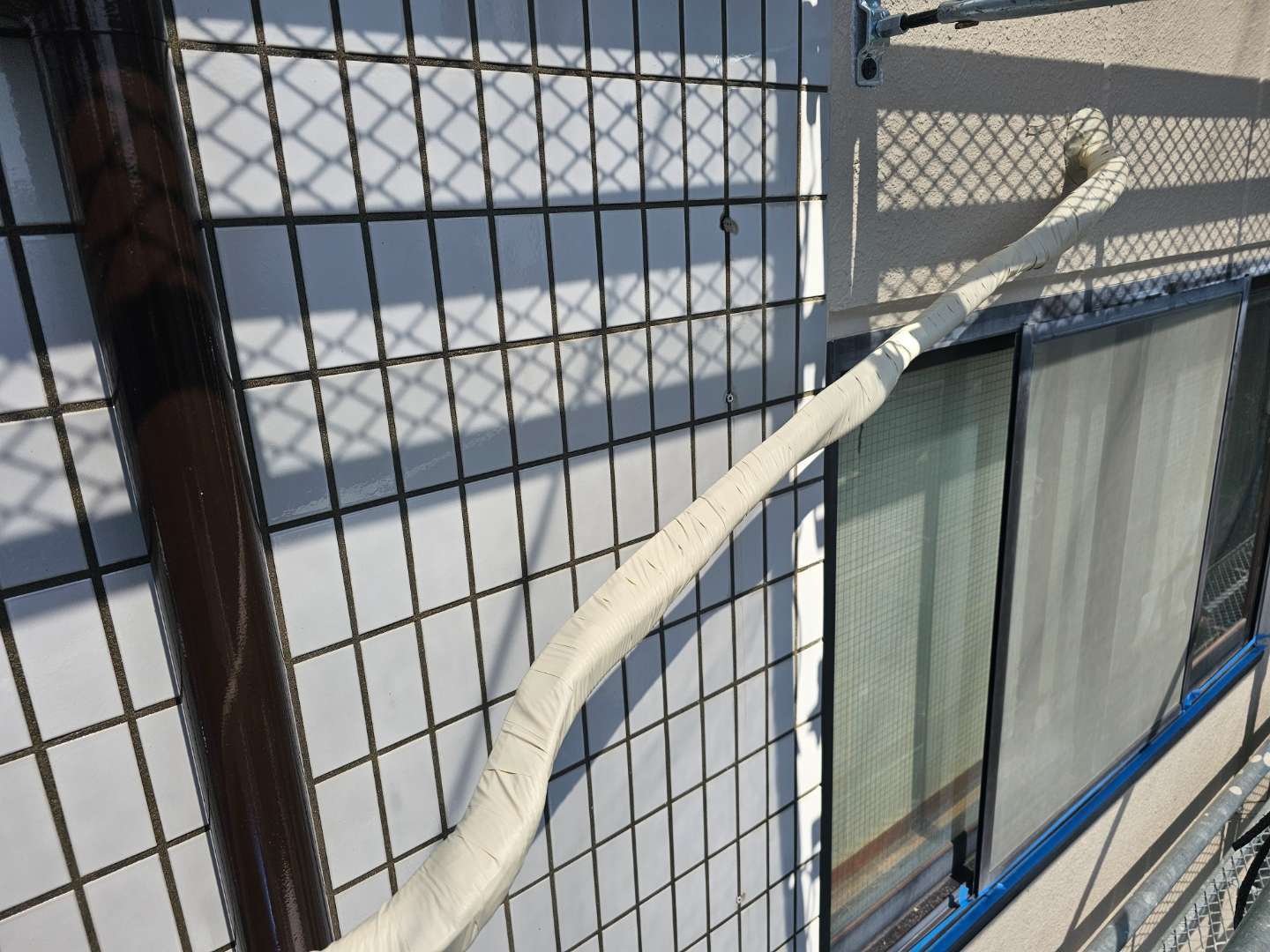 北区W様邸の昨日の作業内容は、タイル部のクリヤー2回目塗装と水切り部のケレン、プライマー塗装、上塗り1回目、2回目塗装、窓廻り面台部のコーキング補修、エアコンホースのまき直し作業を行っています。