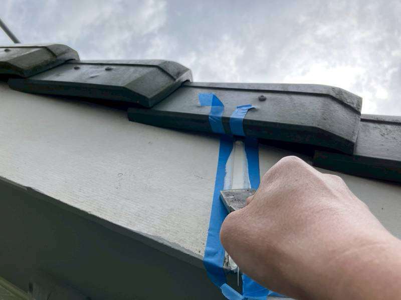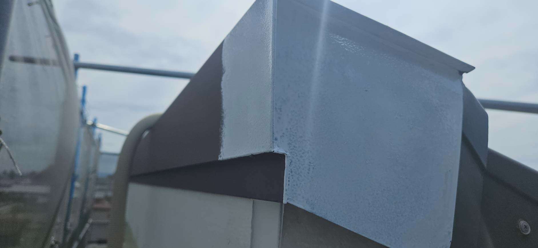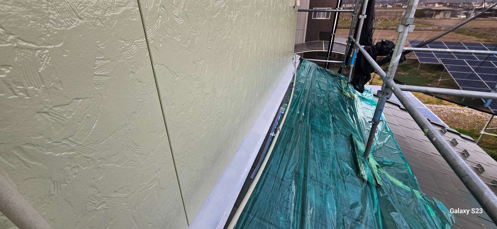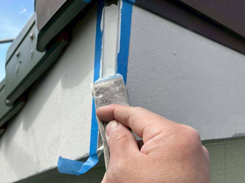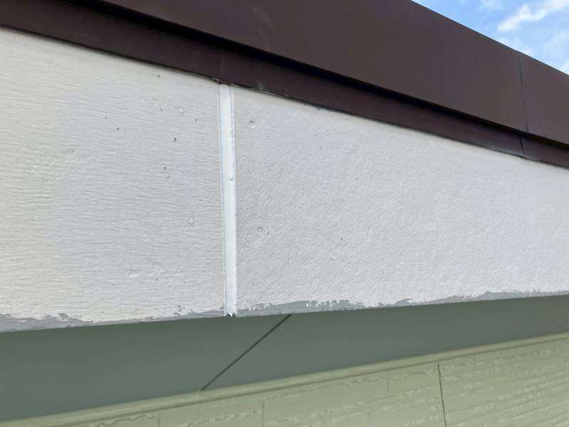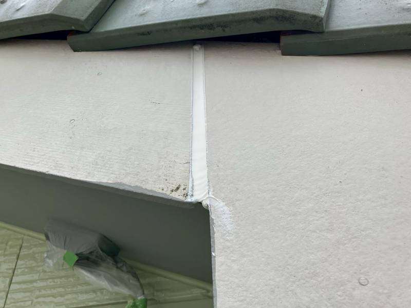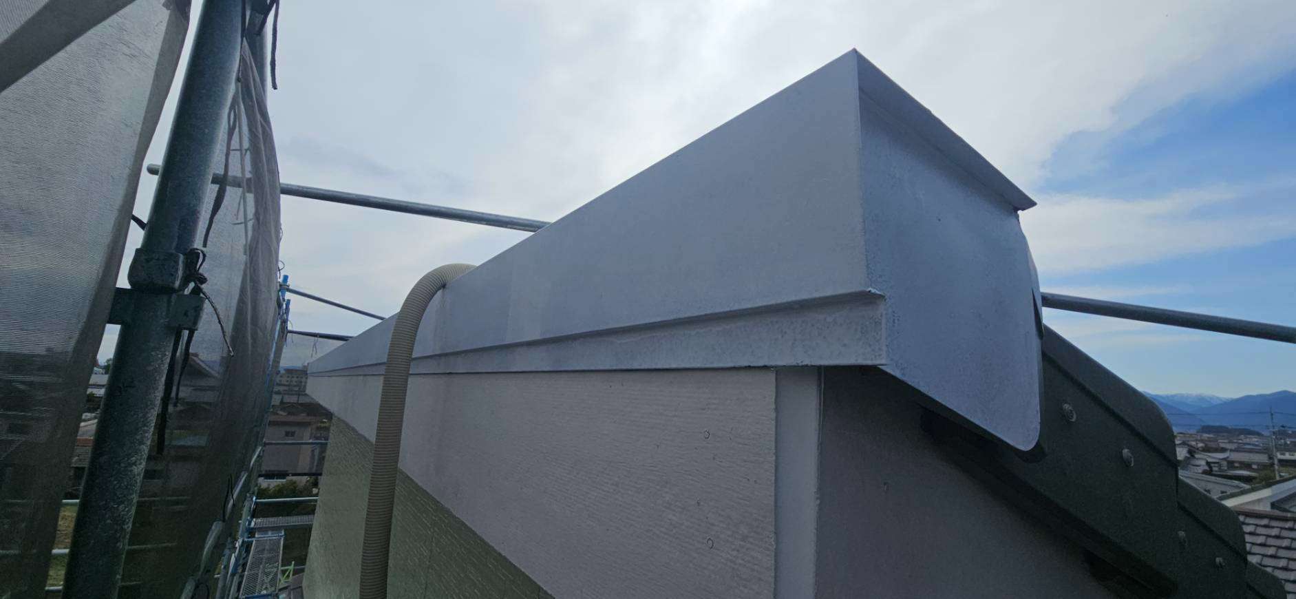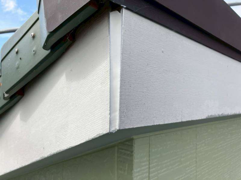 揖斐郡大野町T様邸の昨日の作業は、外壁の上塗り塗装、破風板のコーキング(シーリング)、屋根棟包部、水切り部の下塗り(サビ止め)塗装作業を行っています。