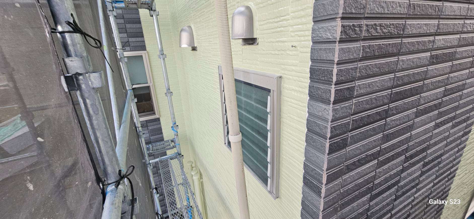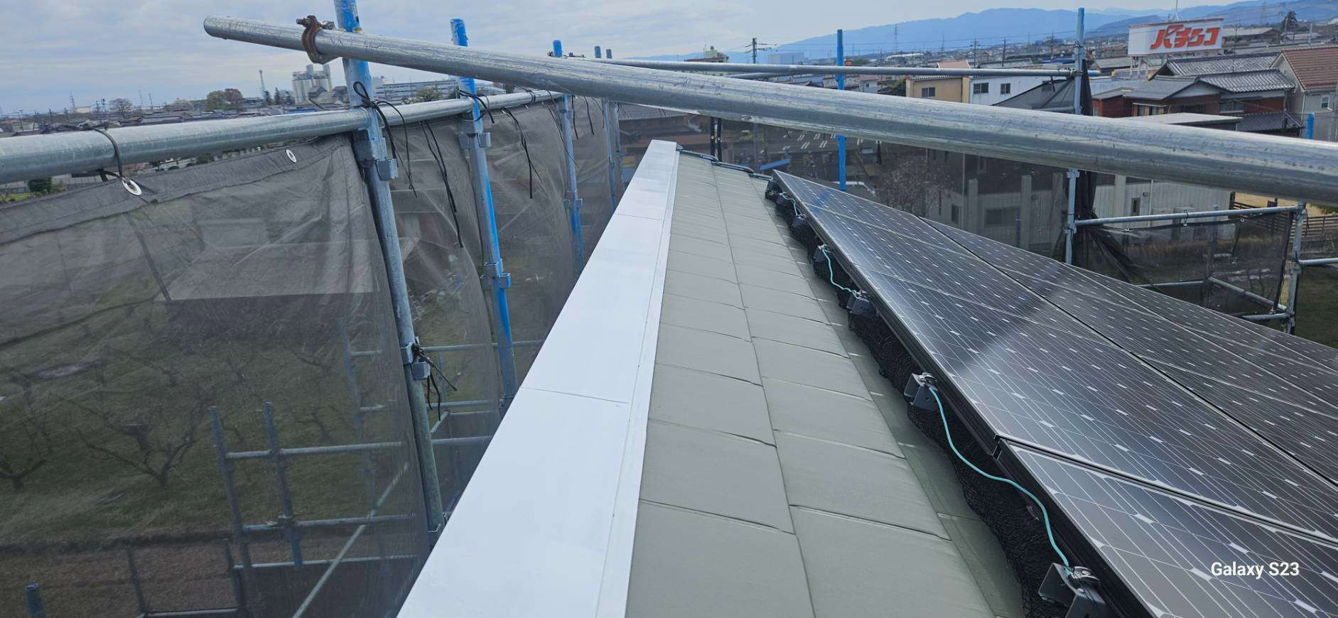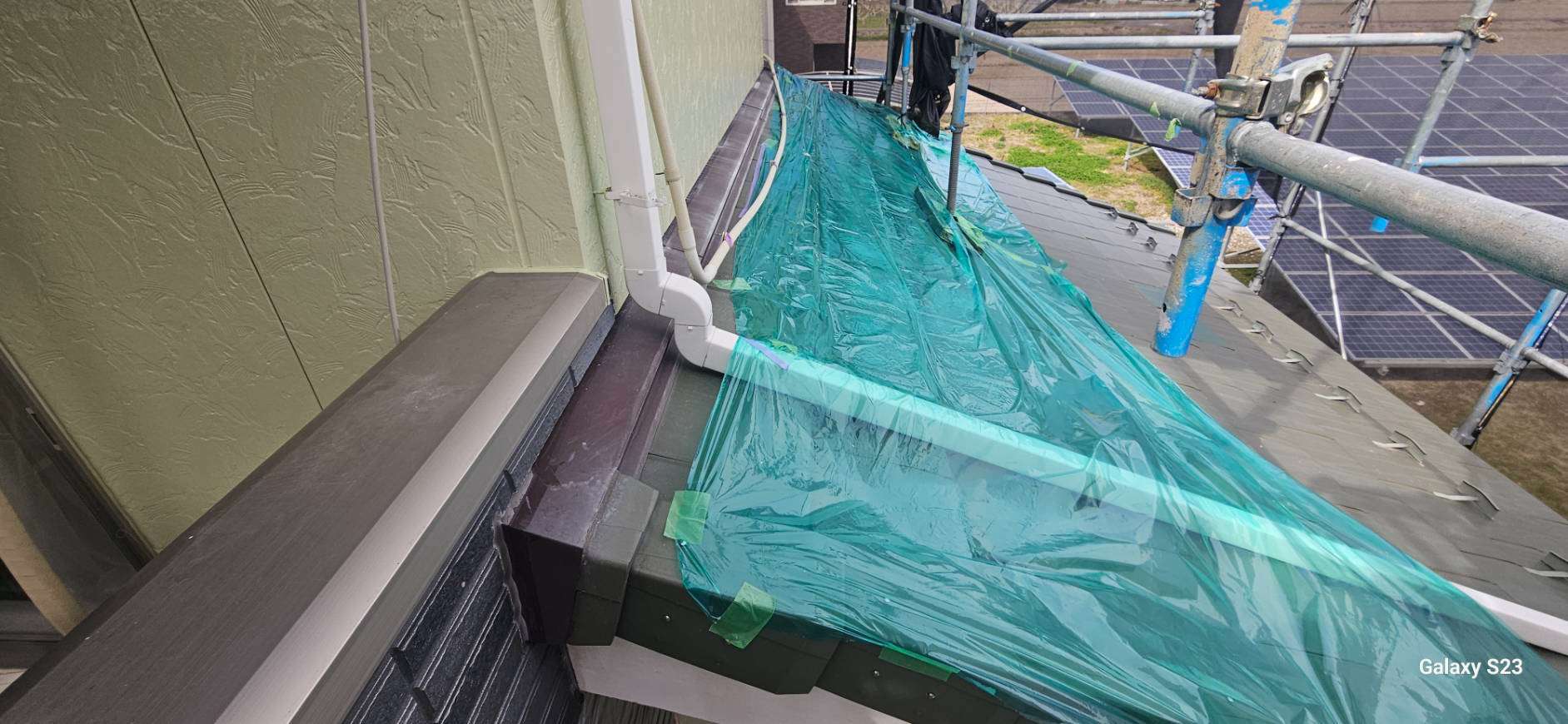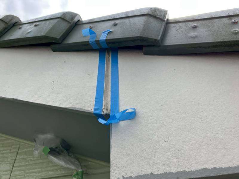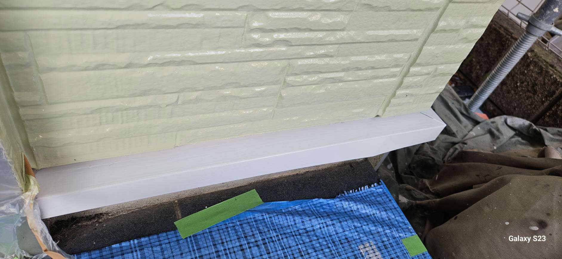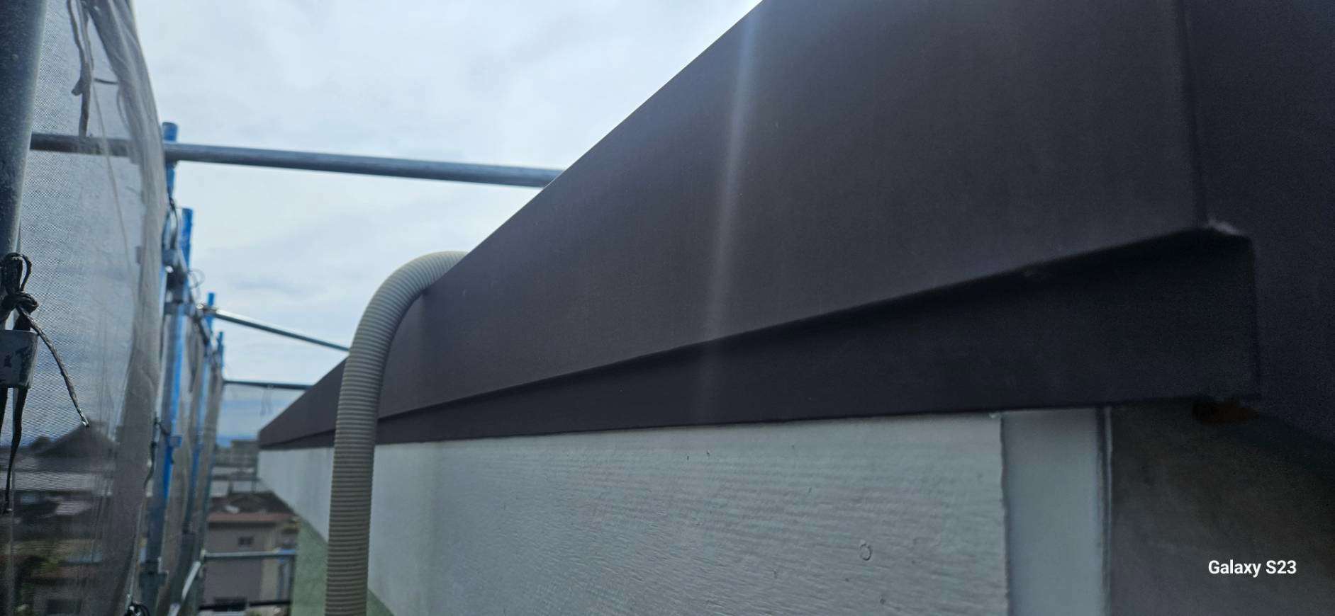 揖斐郡大野町T様邸の昨日の作業は、外壁の上塗り塗装、破風板のコーキング(シーリング)、屋根棟包部、水切り部の下塗り(サビ止め)塗装作業を行っています。