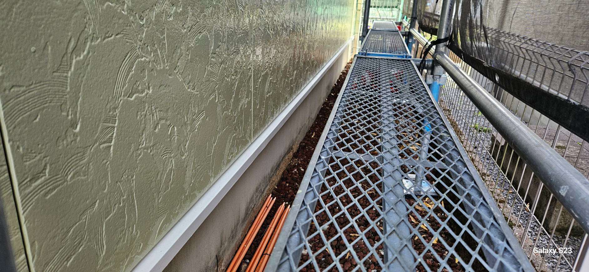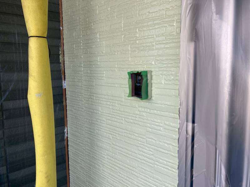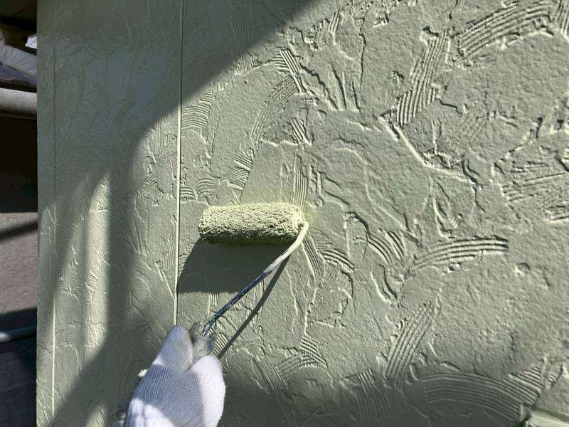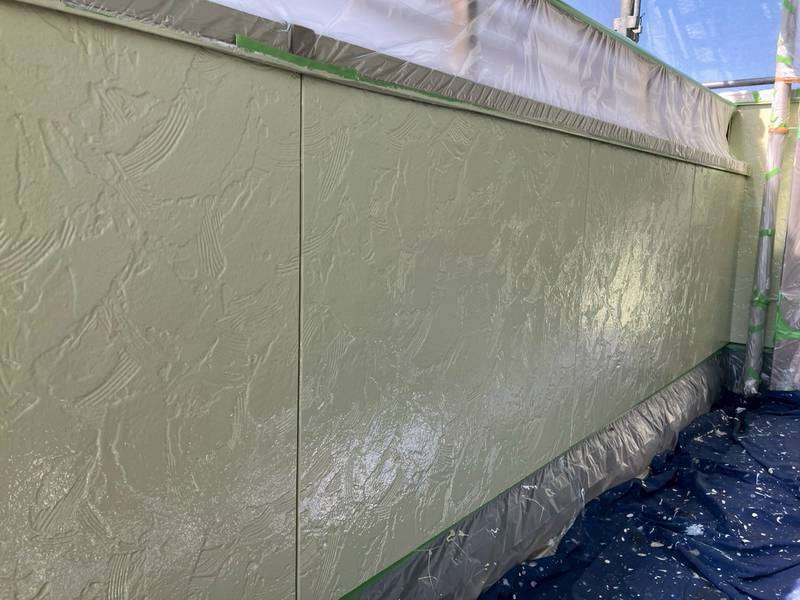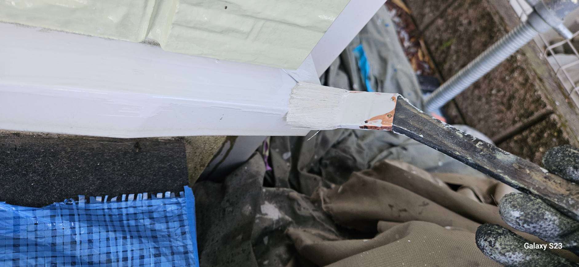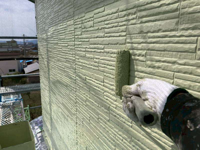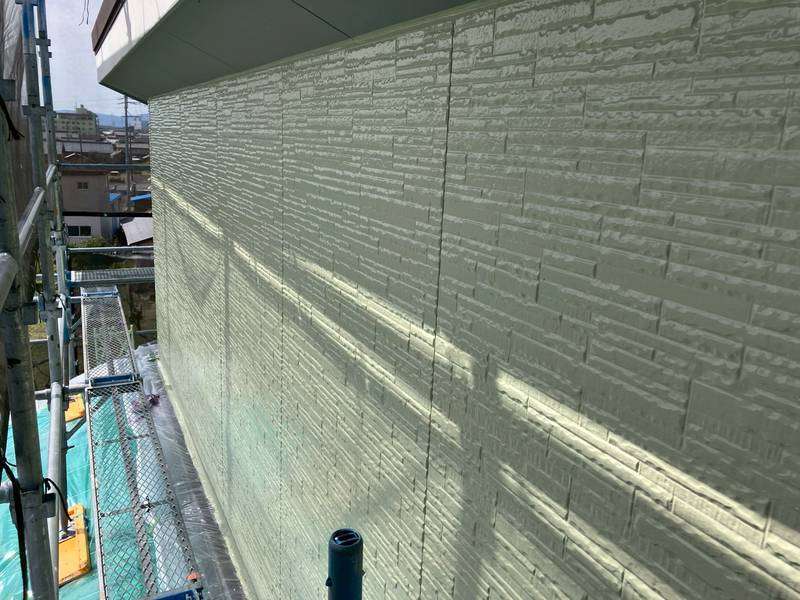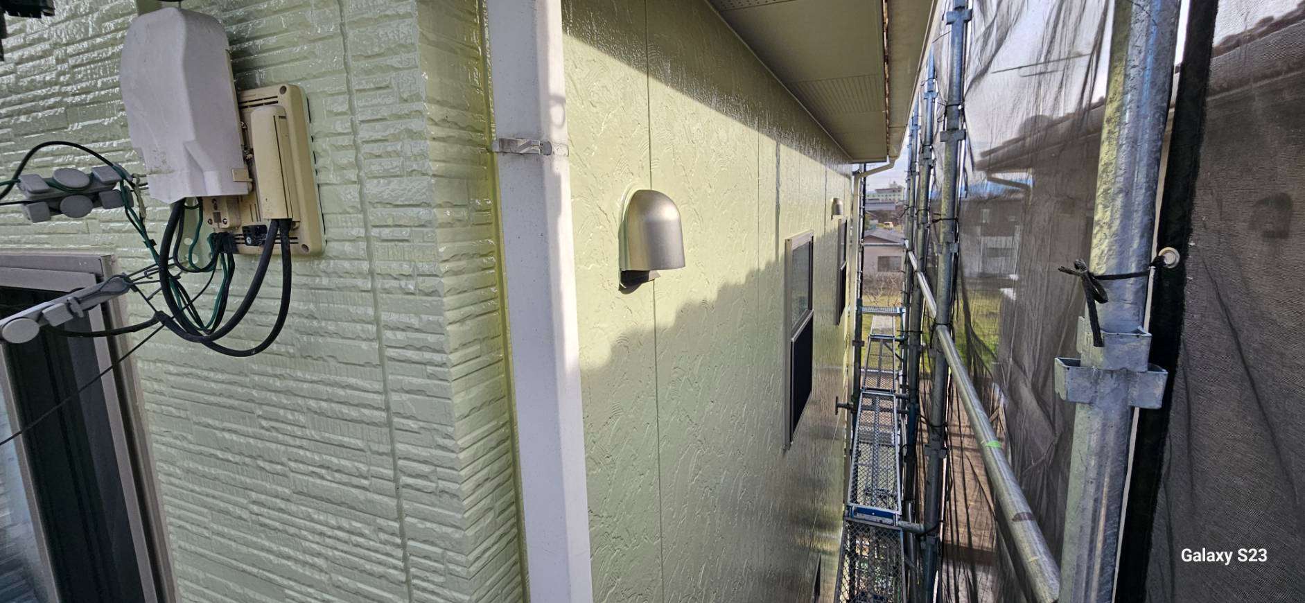 揖斐郡大野町T様邸の昨日の作業は、外壁の上塗り塗装、破風板のコーキング(シーリング)、屋根棟包部、水切り部の下塗り(サビ止め)塗装作業を行っています。