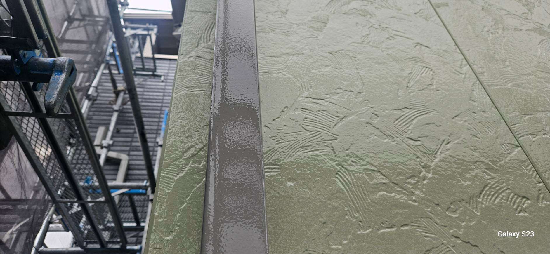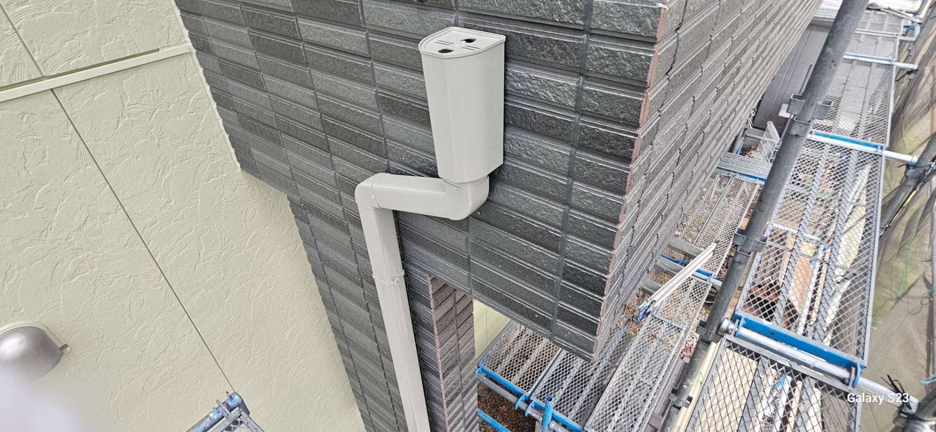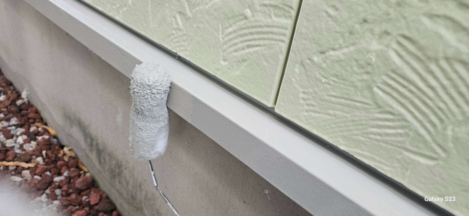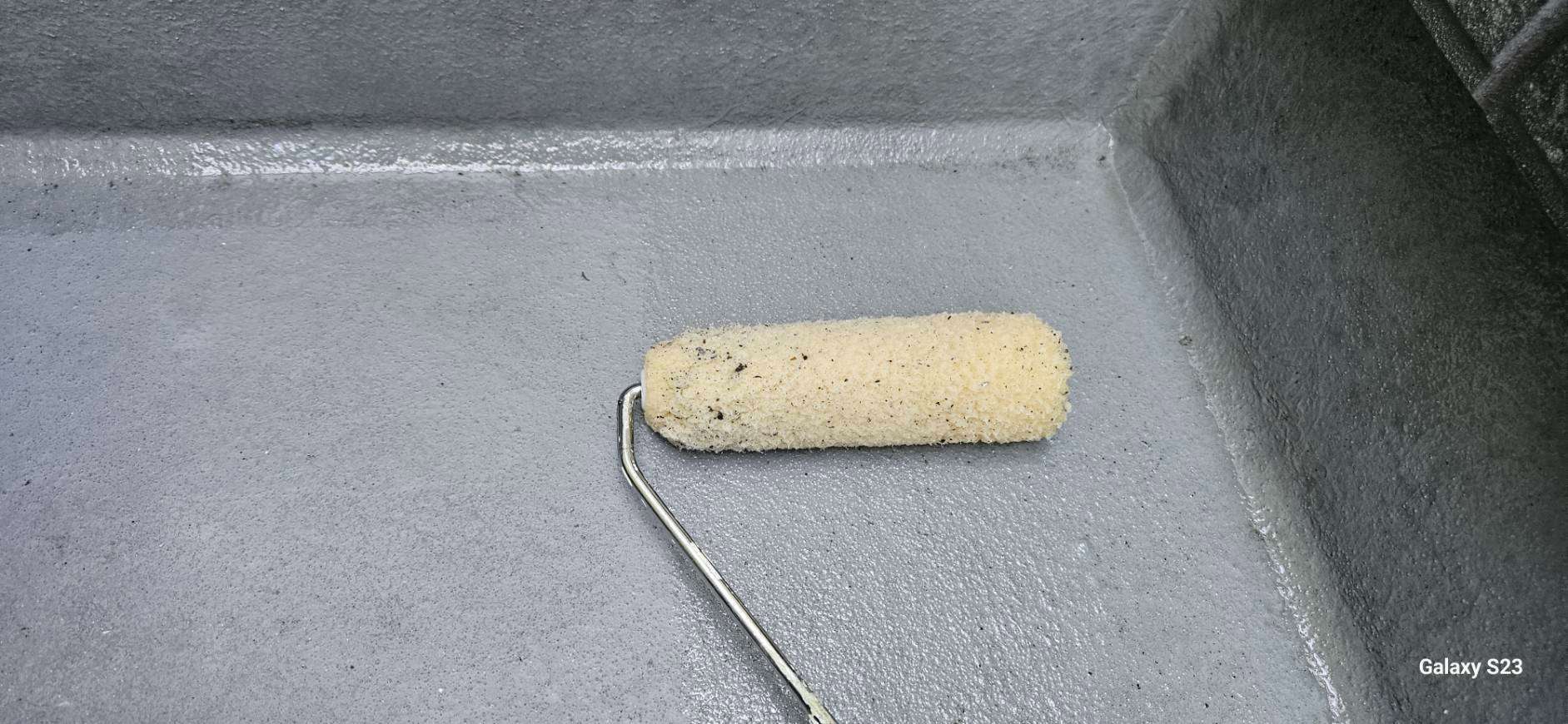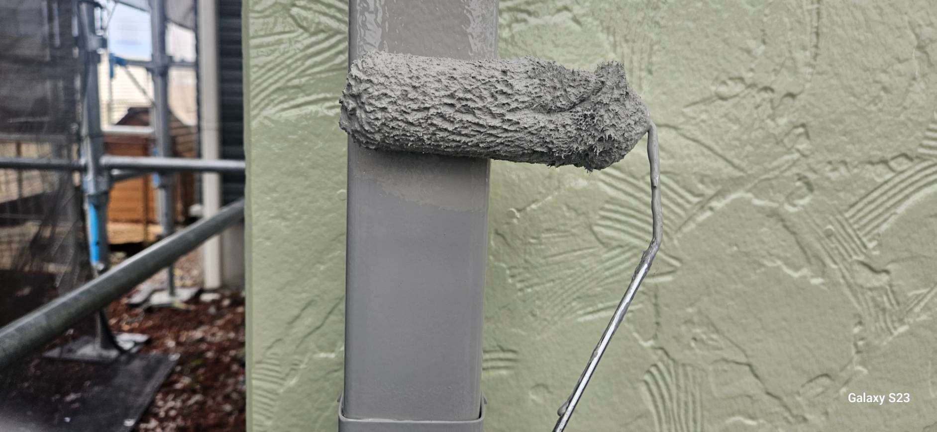 T様邸の昨日の作業は、タイル部のコーキング(シーリング)・付帯部塗装の水切り、竪樋の上塗り2回目塗装・ベランダトップコート作業のプライマー塗装作業を行っていました。