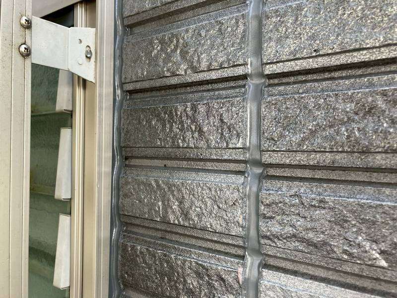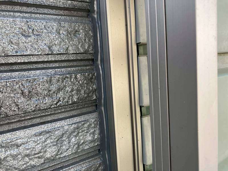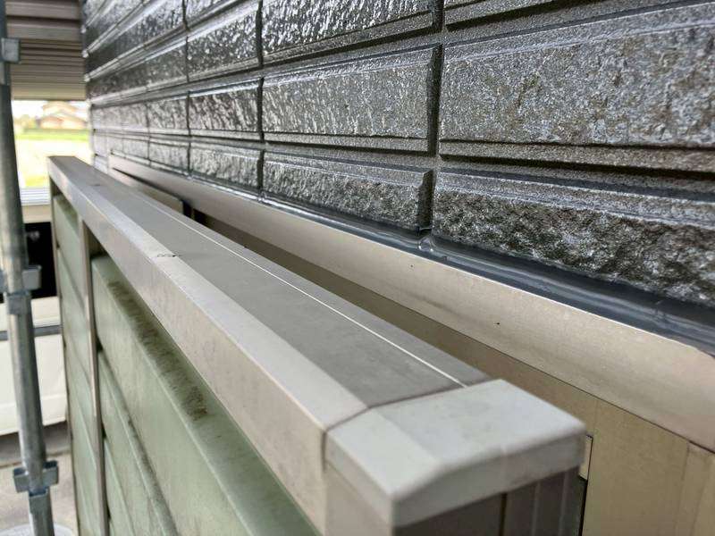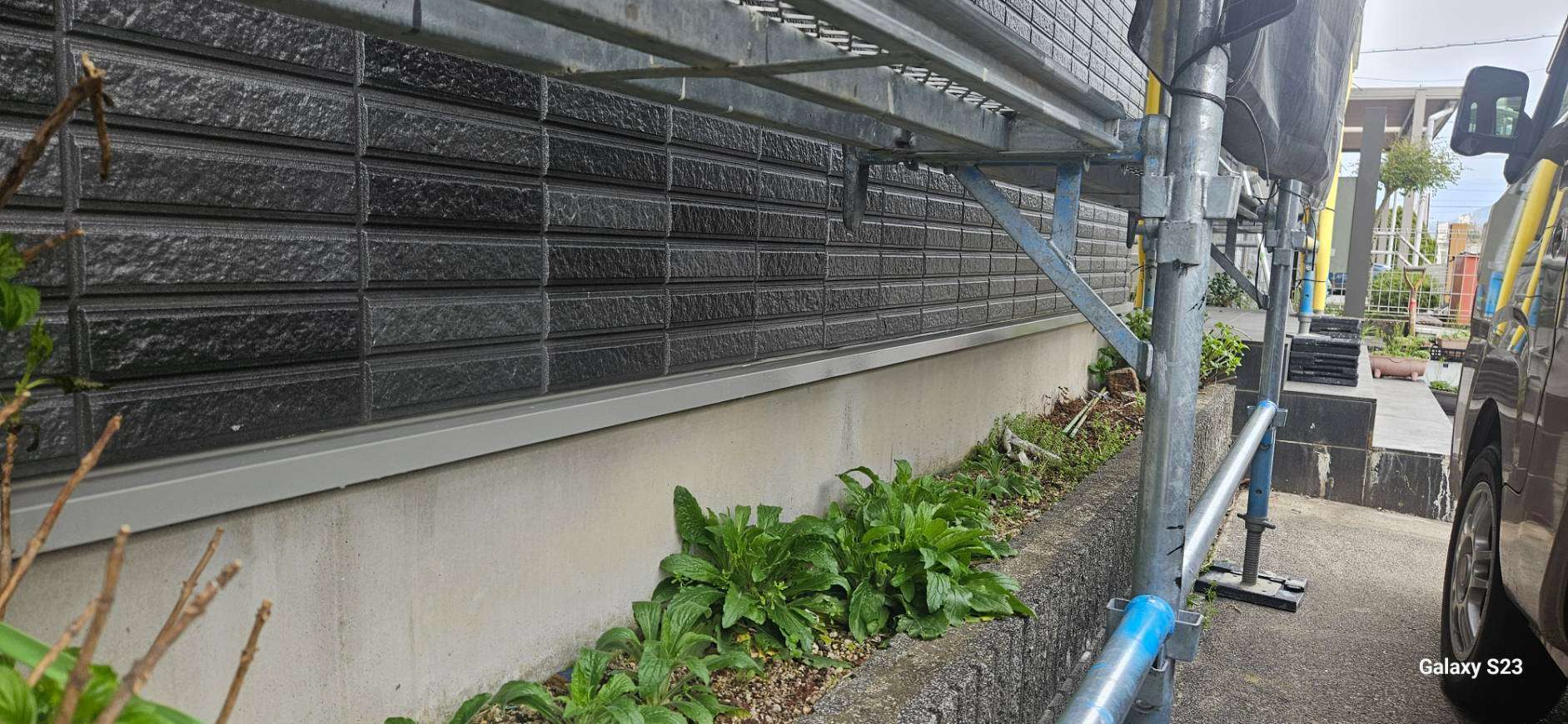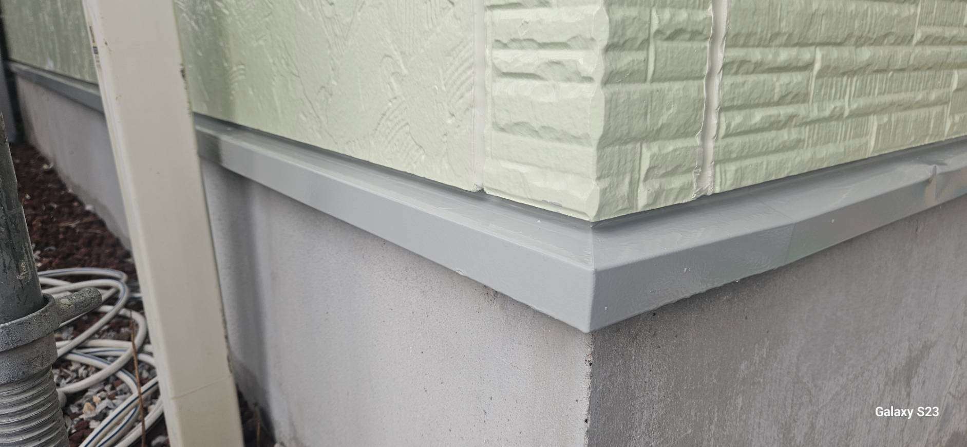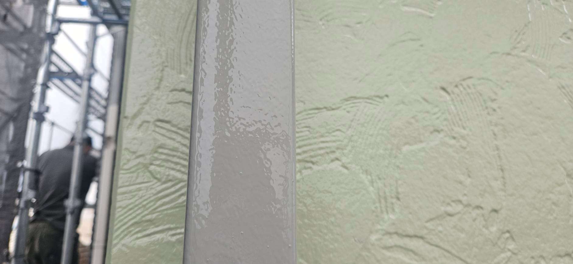 T様邸の昨日の作業は、タイル部のコーキング(シーリング)・付帯部塗装の水切り、竪樋の上塗り2回目塗装・ベランダトップコート作業のプライマー塗装作業を行っていました。