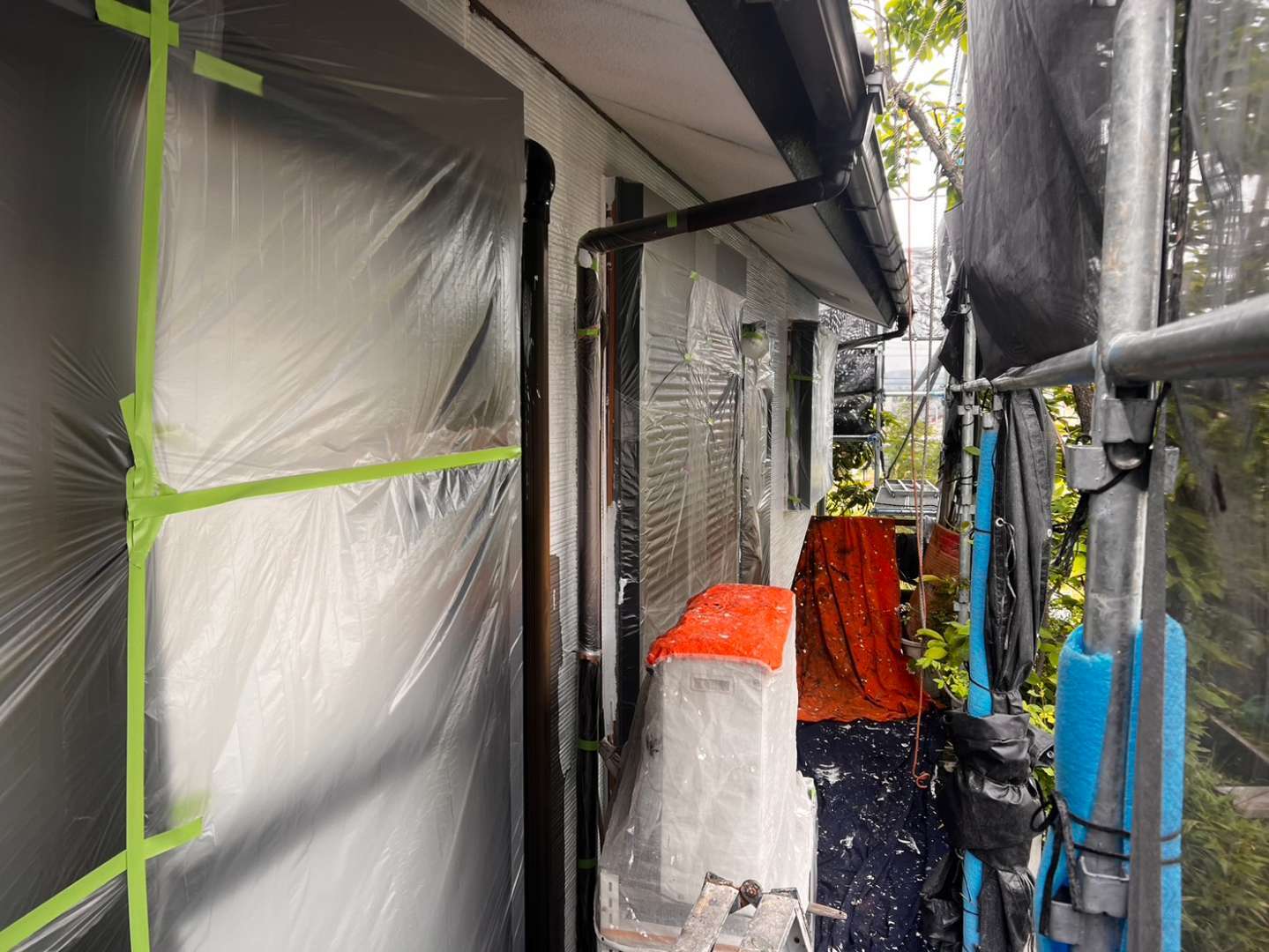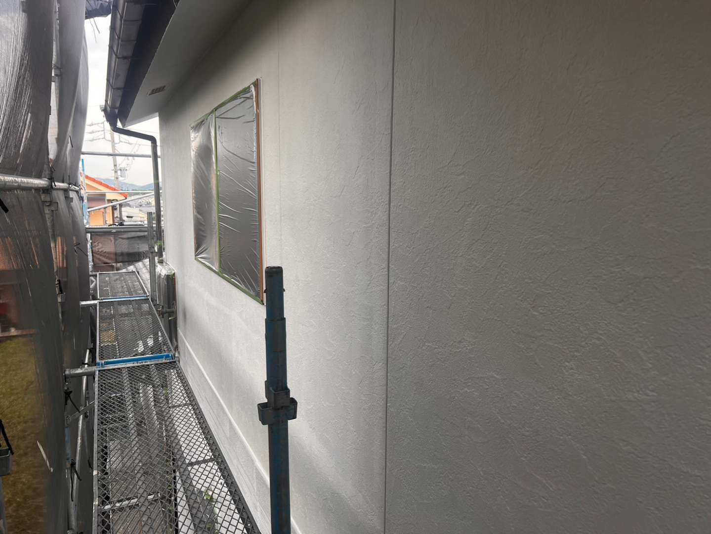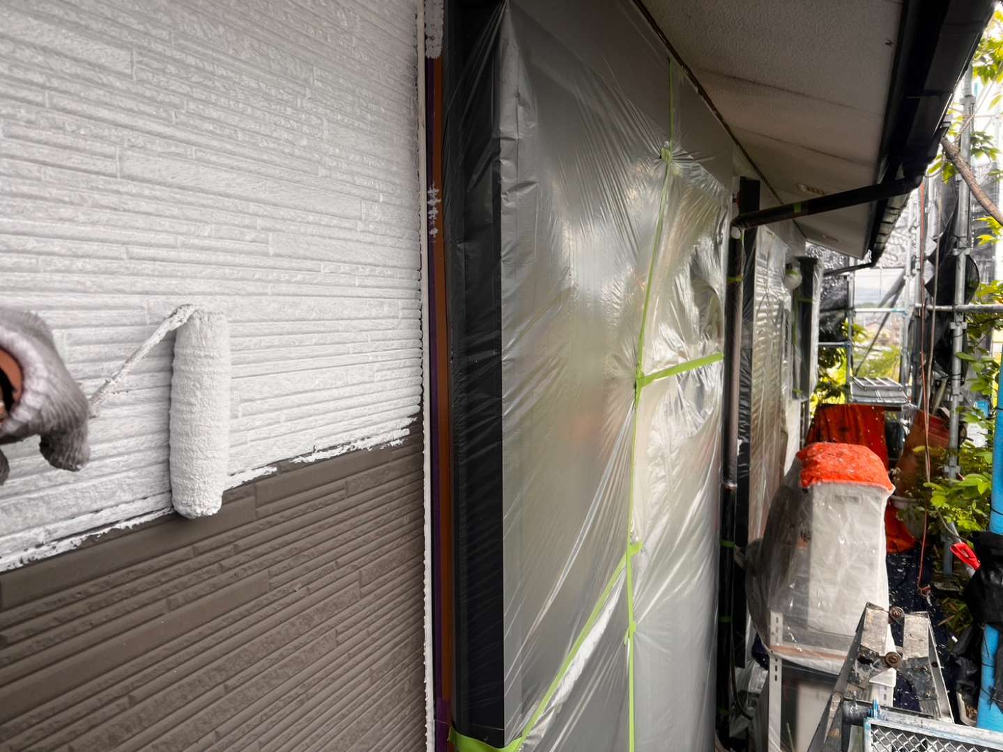 今日の作業は、外壁の中塗り・軒天の2回目塗装作業予定です。