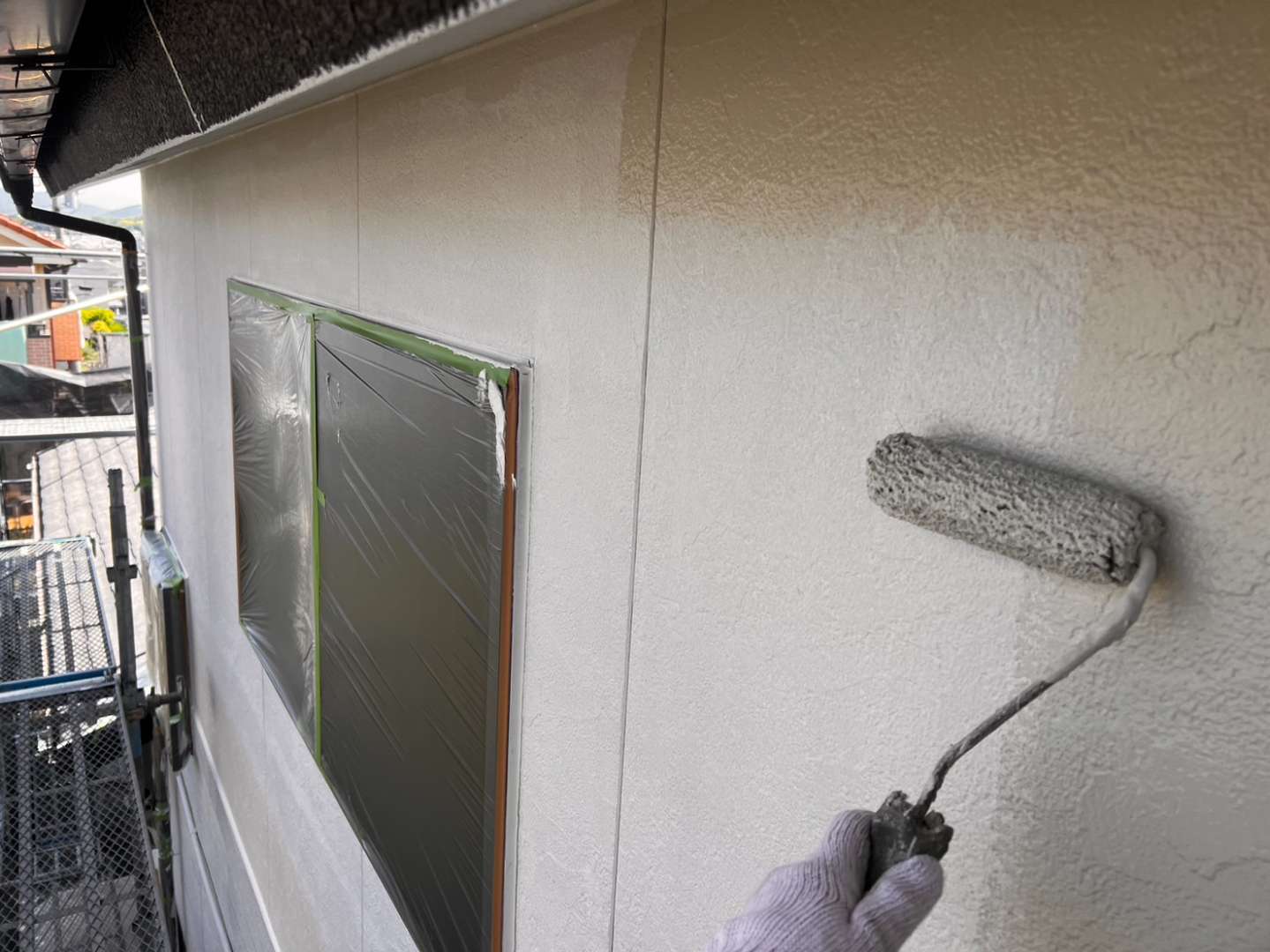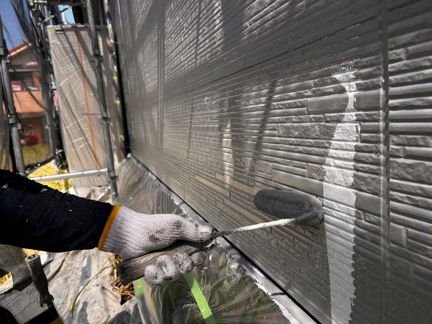 今日の作業は、外壁の上塗り塗装作業予定です。