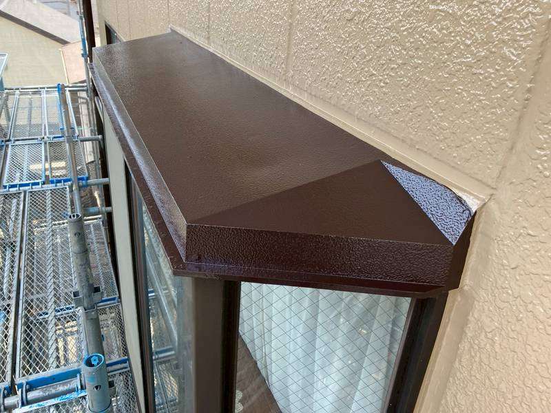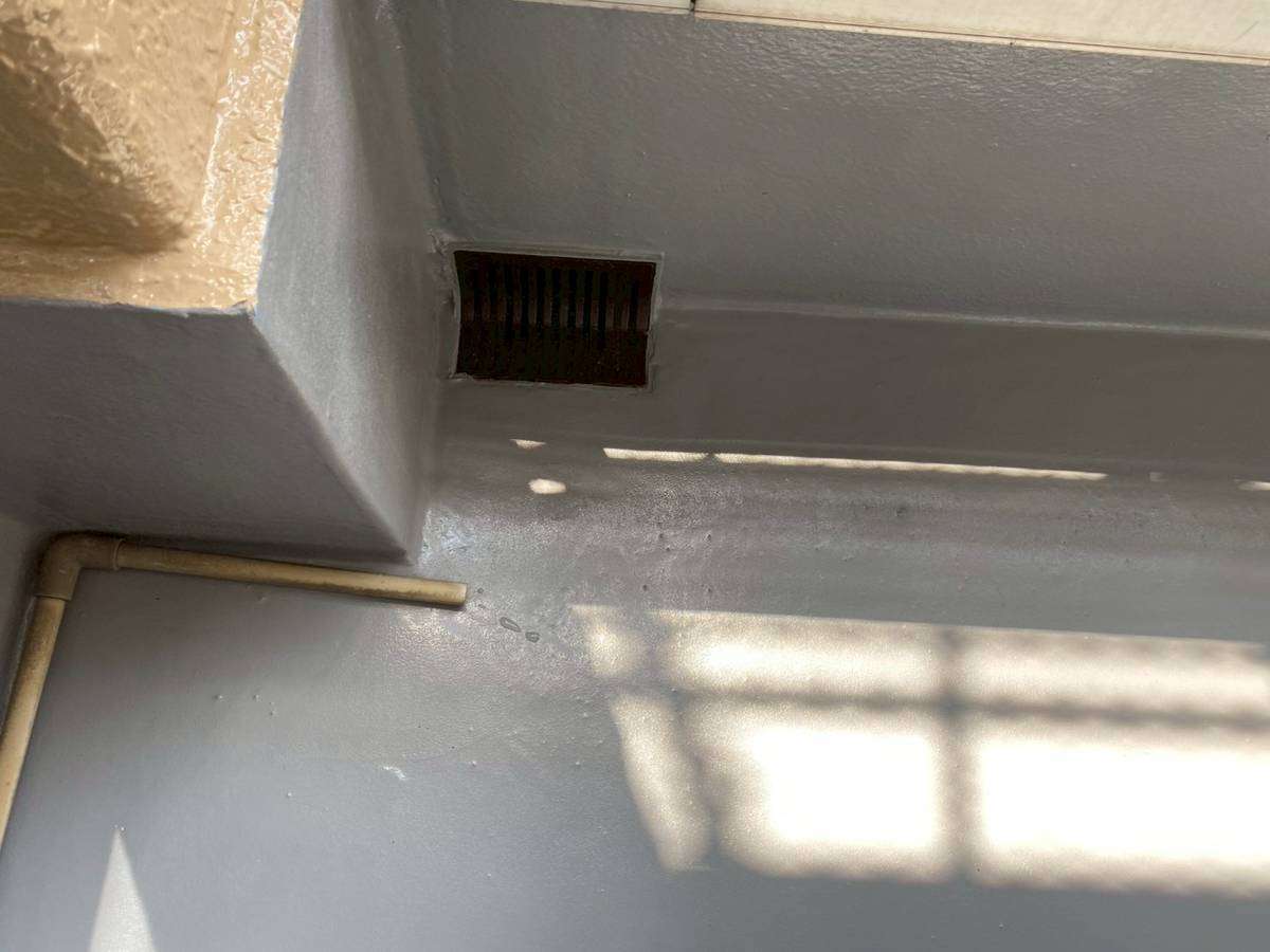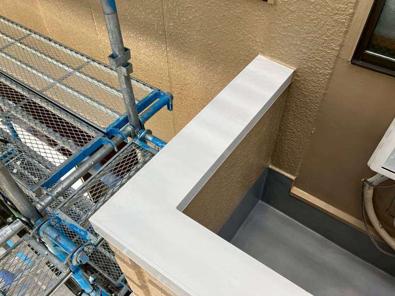 M様邸の昨日の作業は、ベランダ防水作業のトップコート塗装作業と笠木部の上塗り塗装後に塗装部の最終点検作業を行いました。