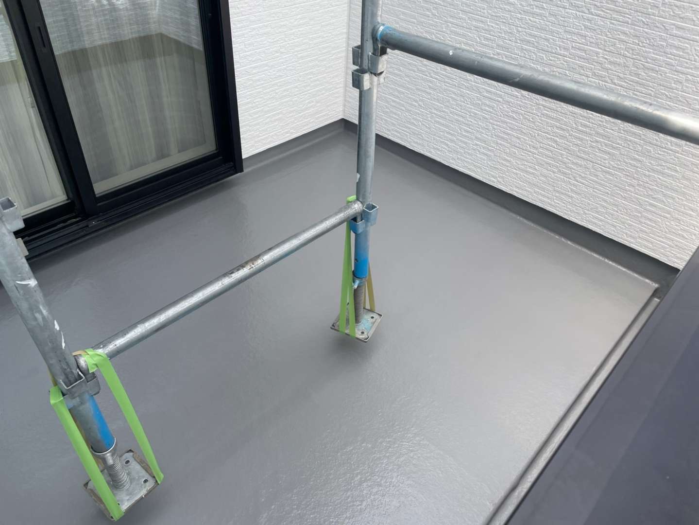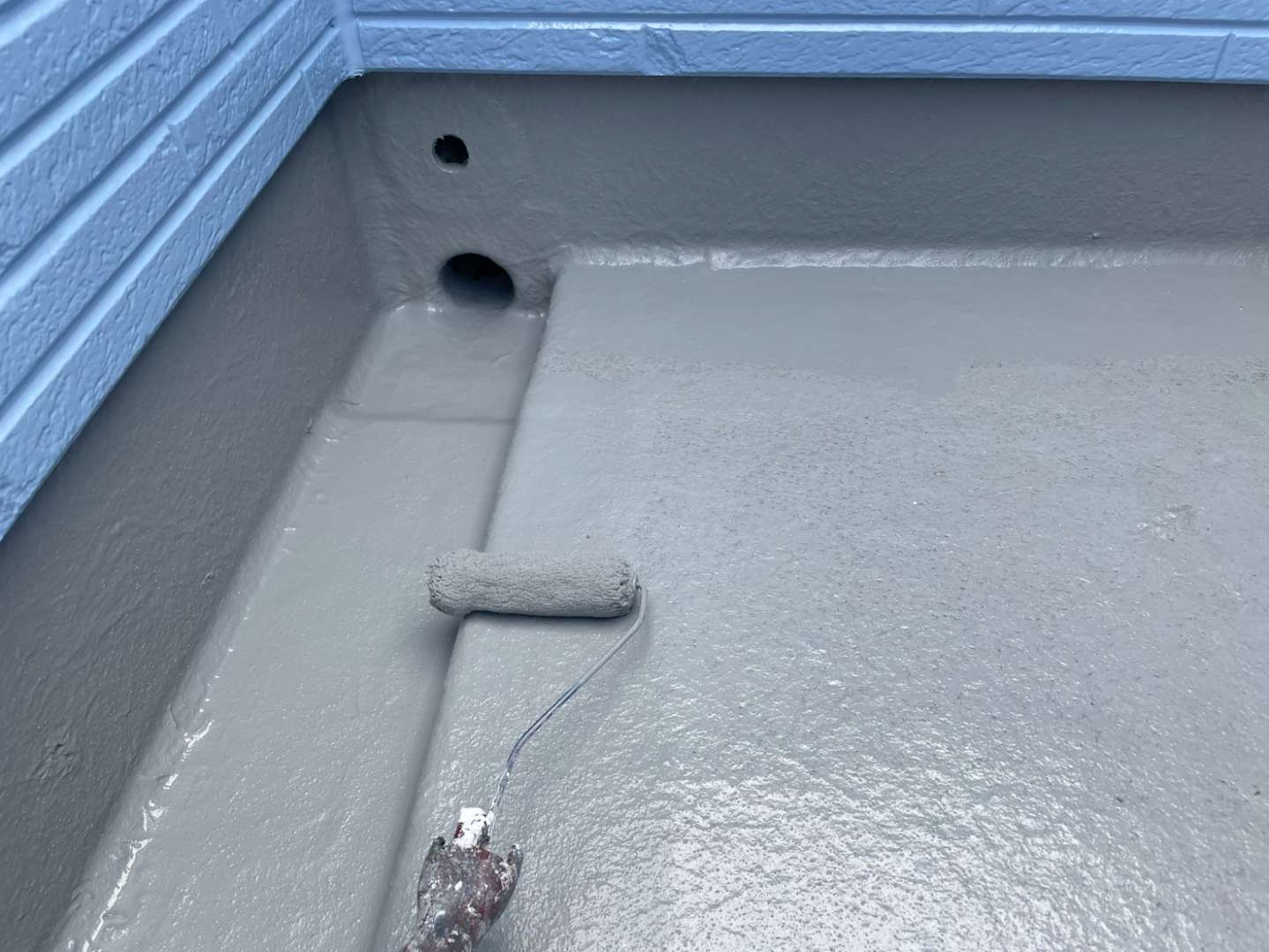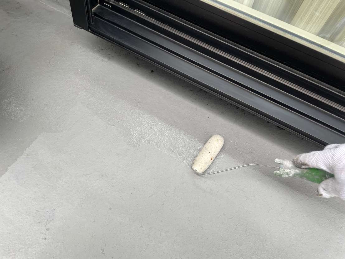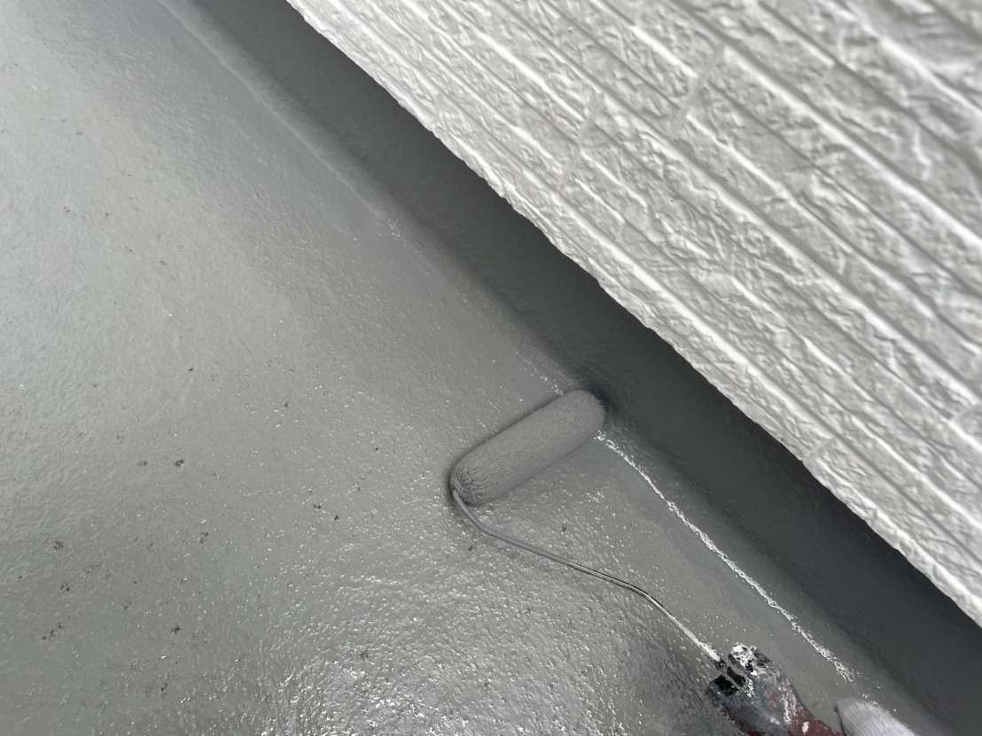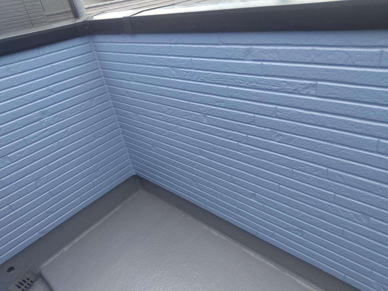Y様邸の作業は、ベランダのトップコート塗装作業のプライマー・トップコート塗装が完了して