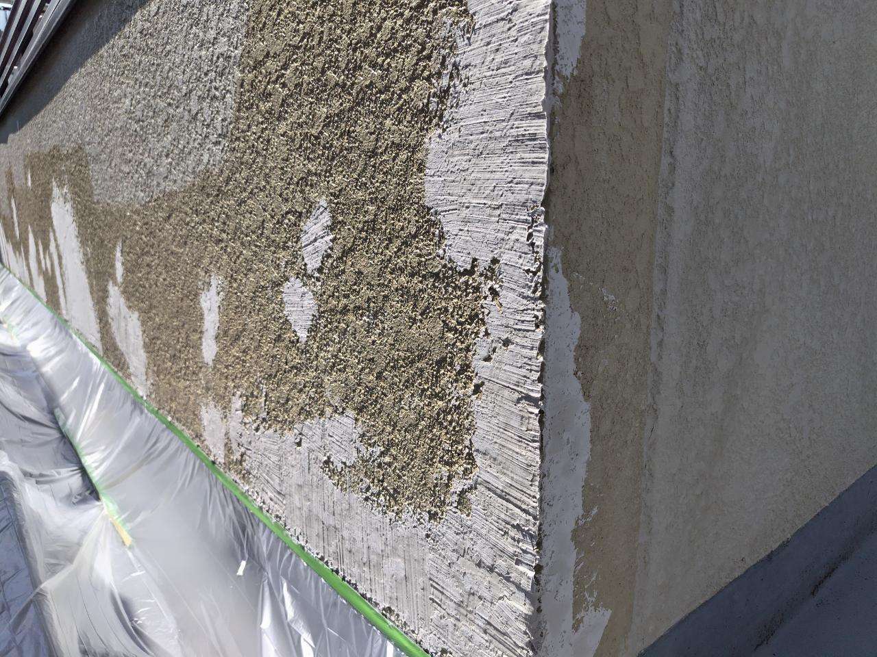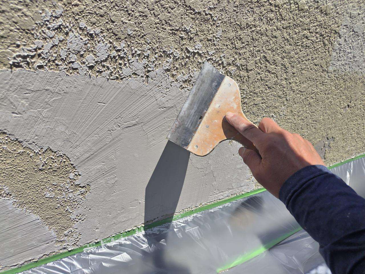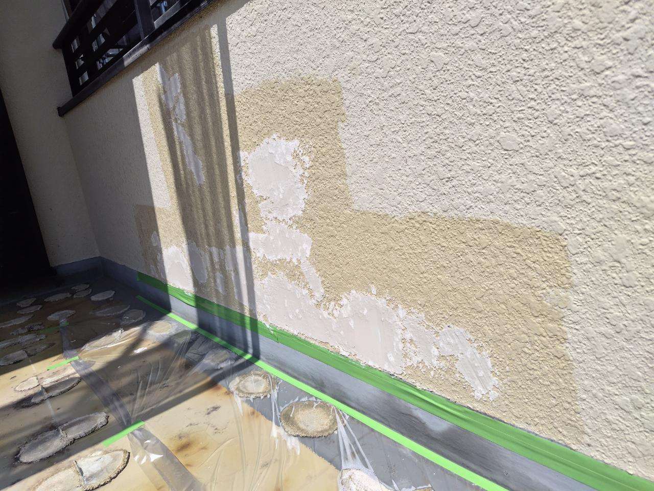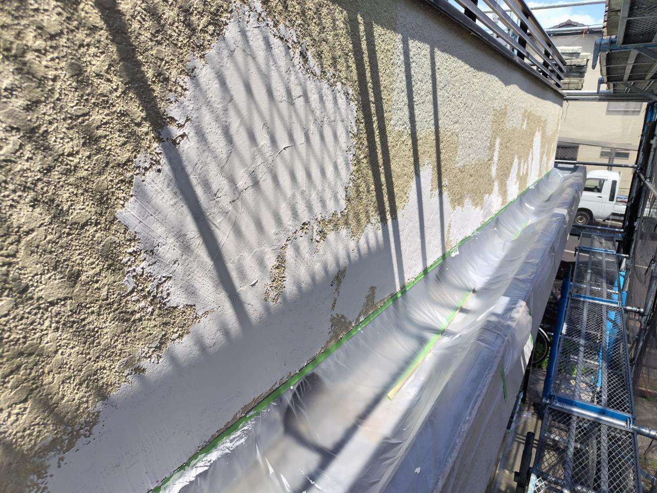 O様邸の昨日の作業は、外壁の劣化部のケレン・シーラー・パテ補修作業と養生作業を行っていました。