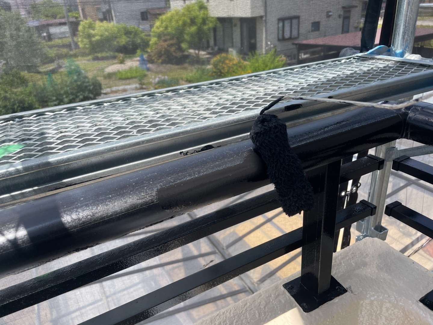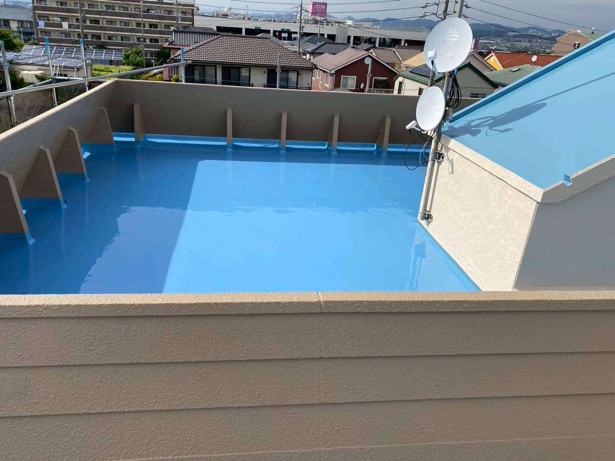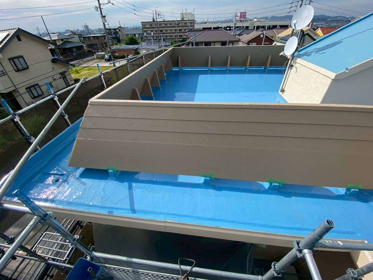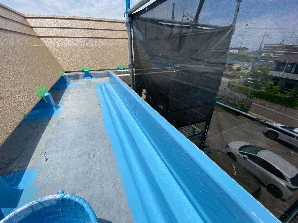 守山区S様邸の今日の作業は、付帯部塗装作業と屋上ウレタン樹脂2層目塗装作業予定です。