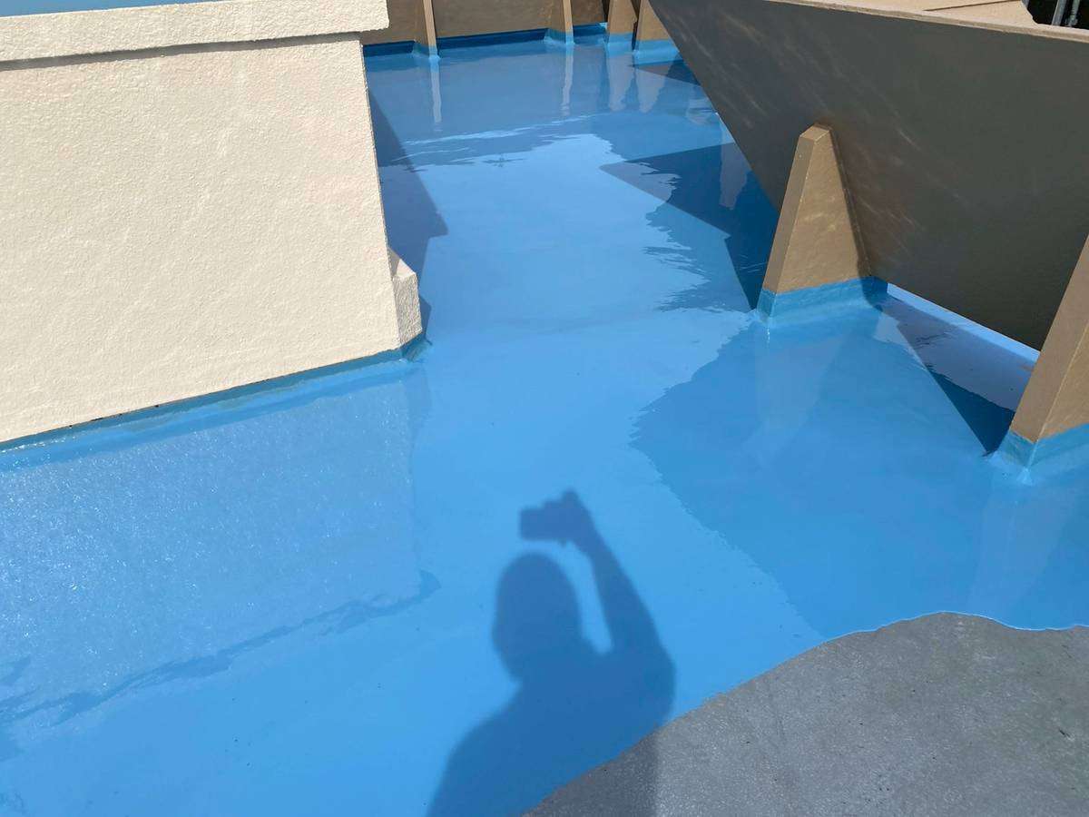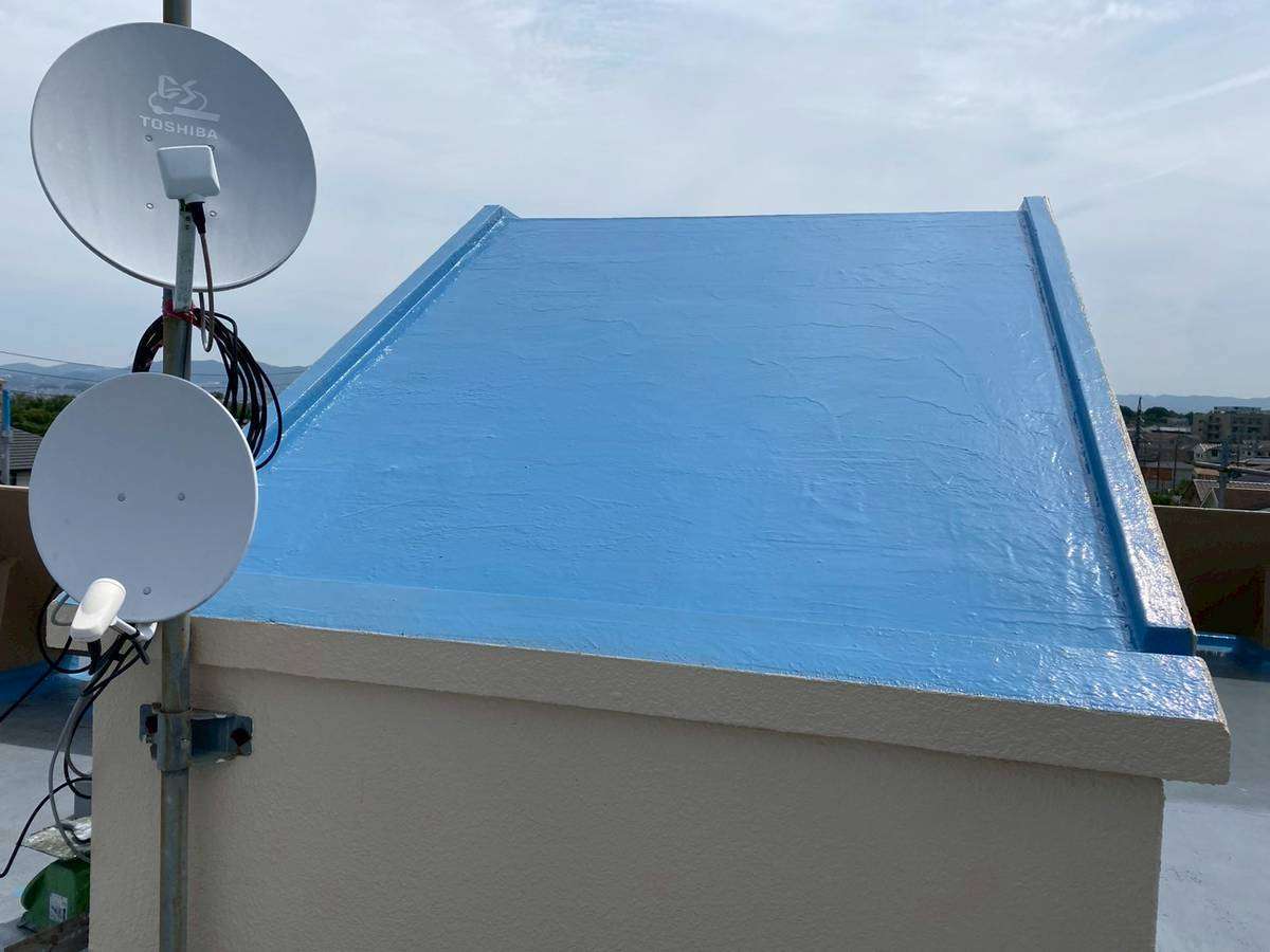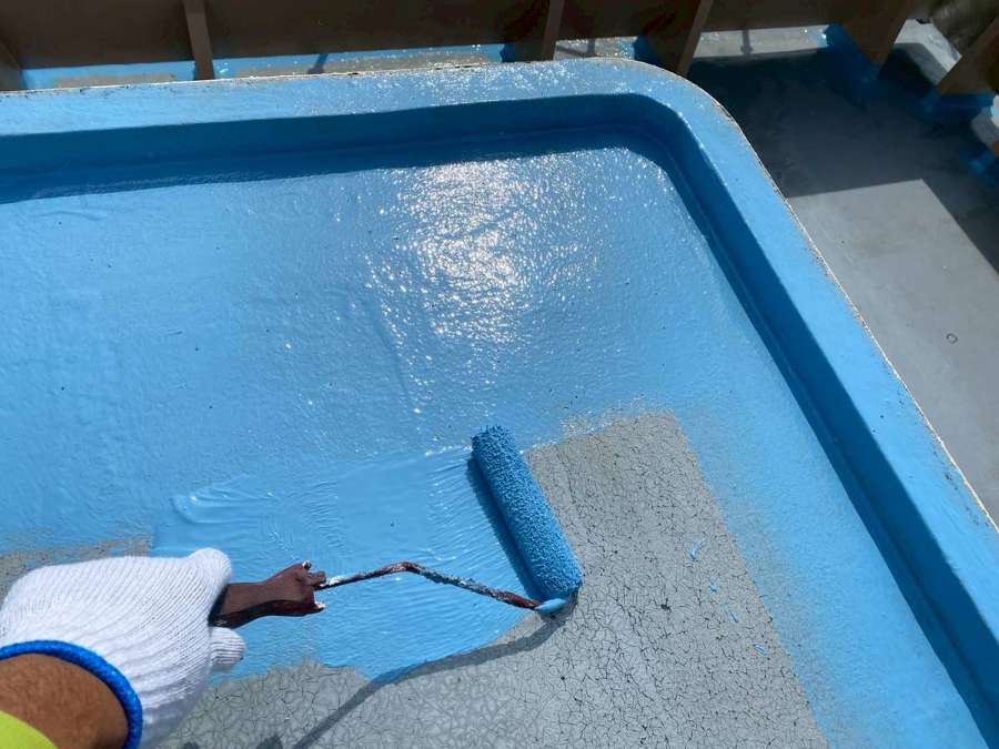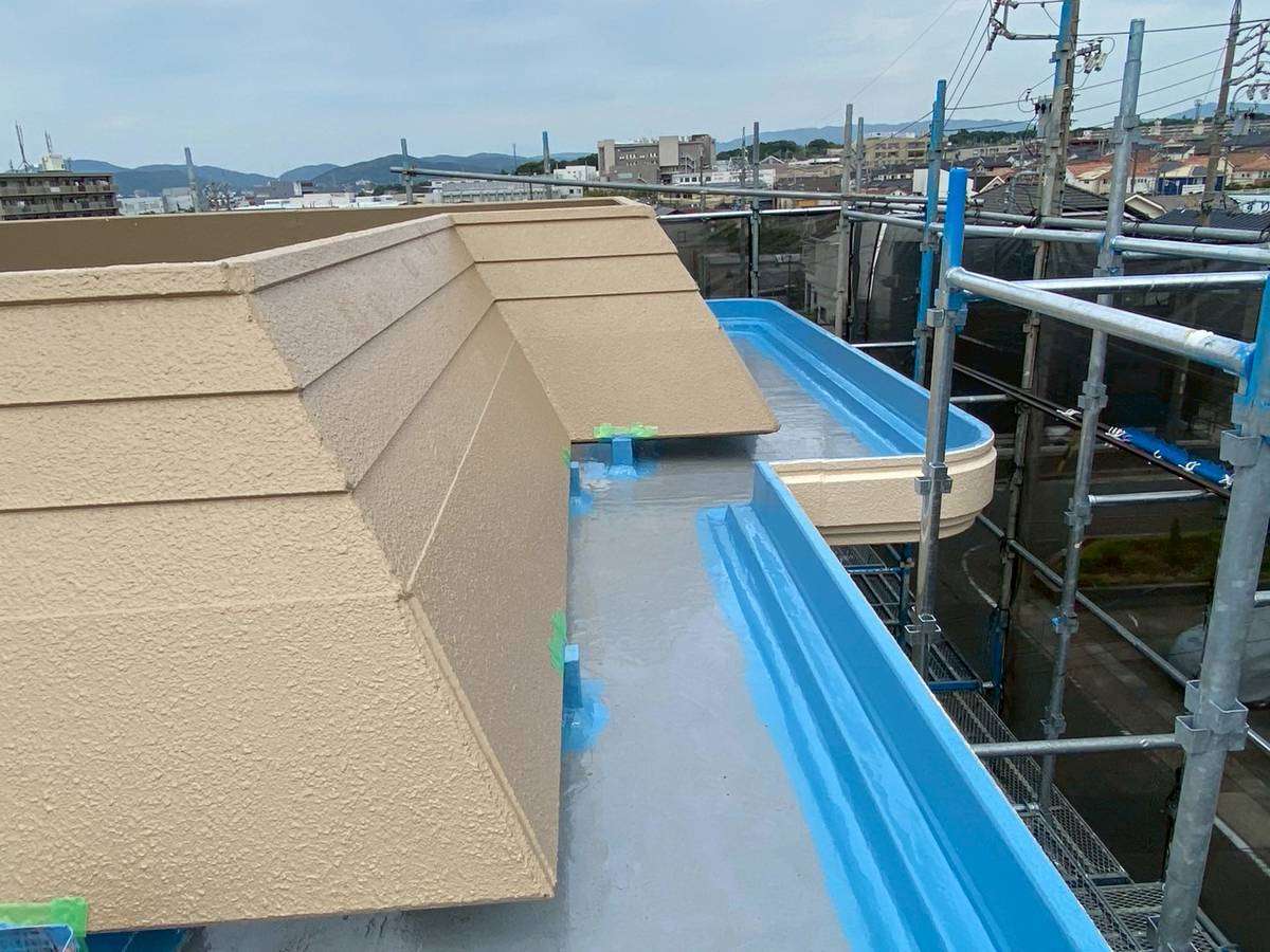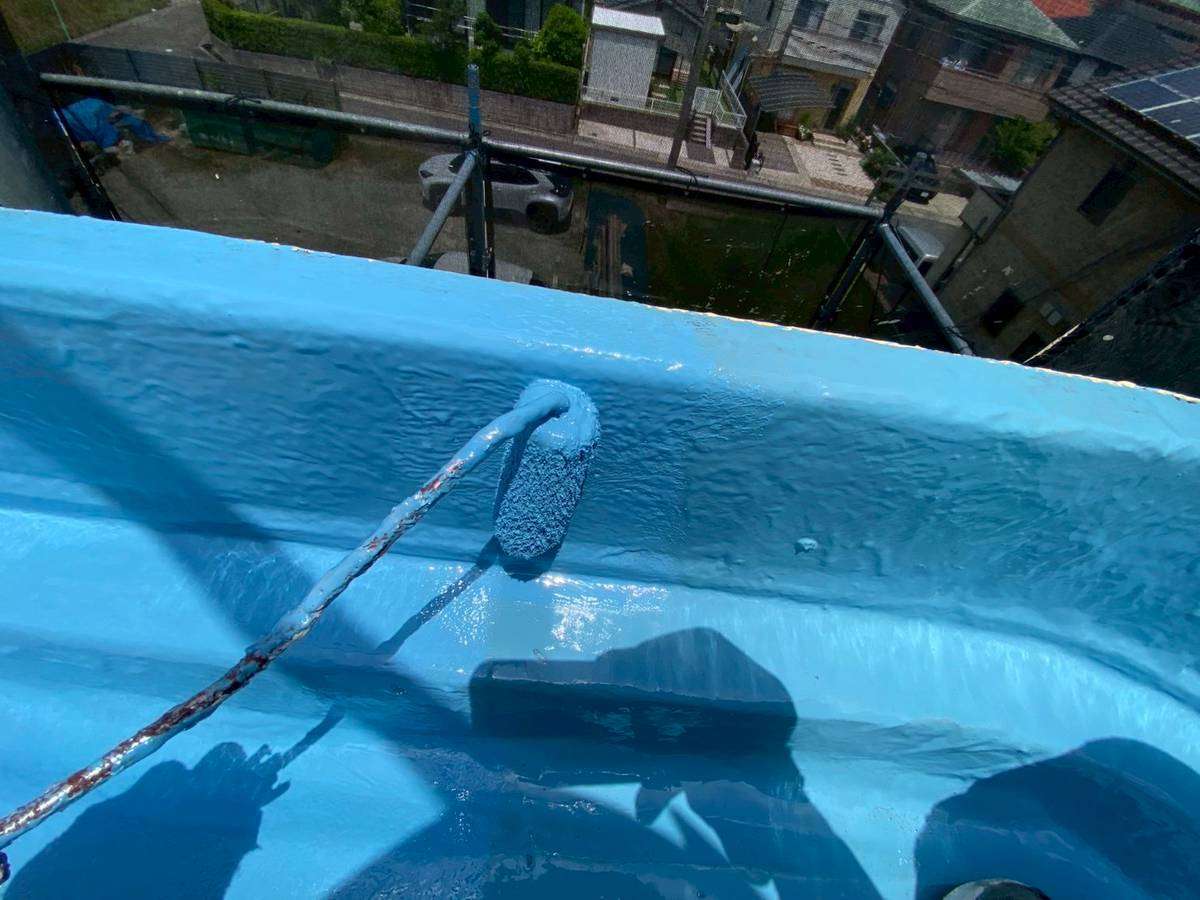 屋上ウレタン防水の立上り・側溝部ウレタン樹脂2層目塗装と平場部ウレタン樹脂1層目塗装、雨樋等付帯部上塗り1回目、2回目塗装を行っていました。