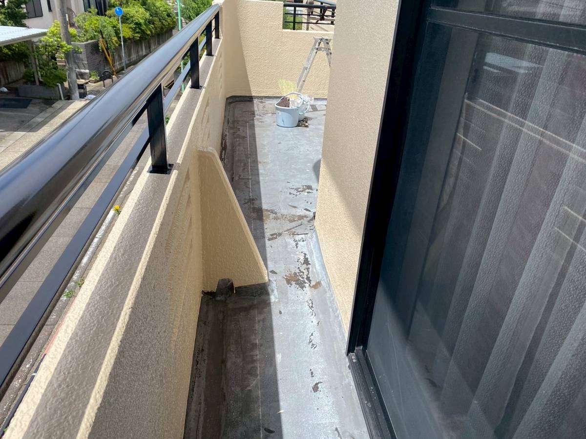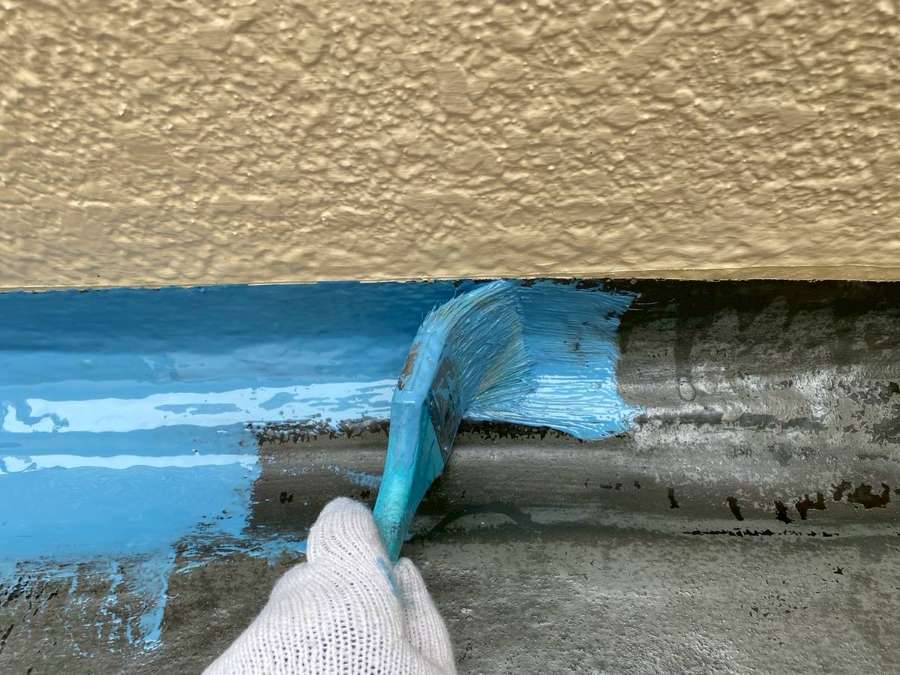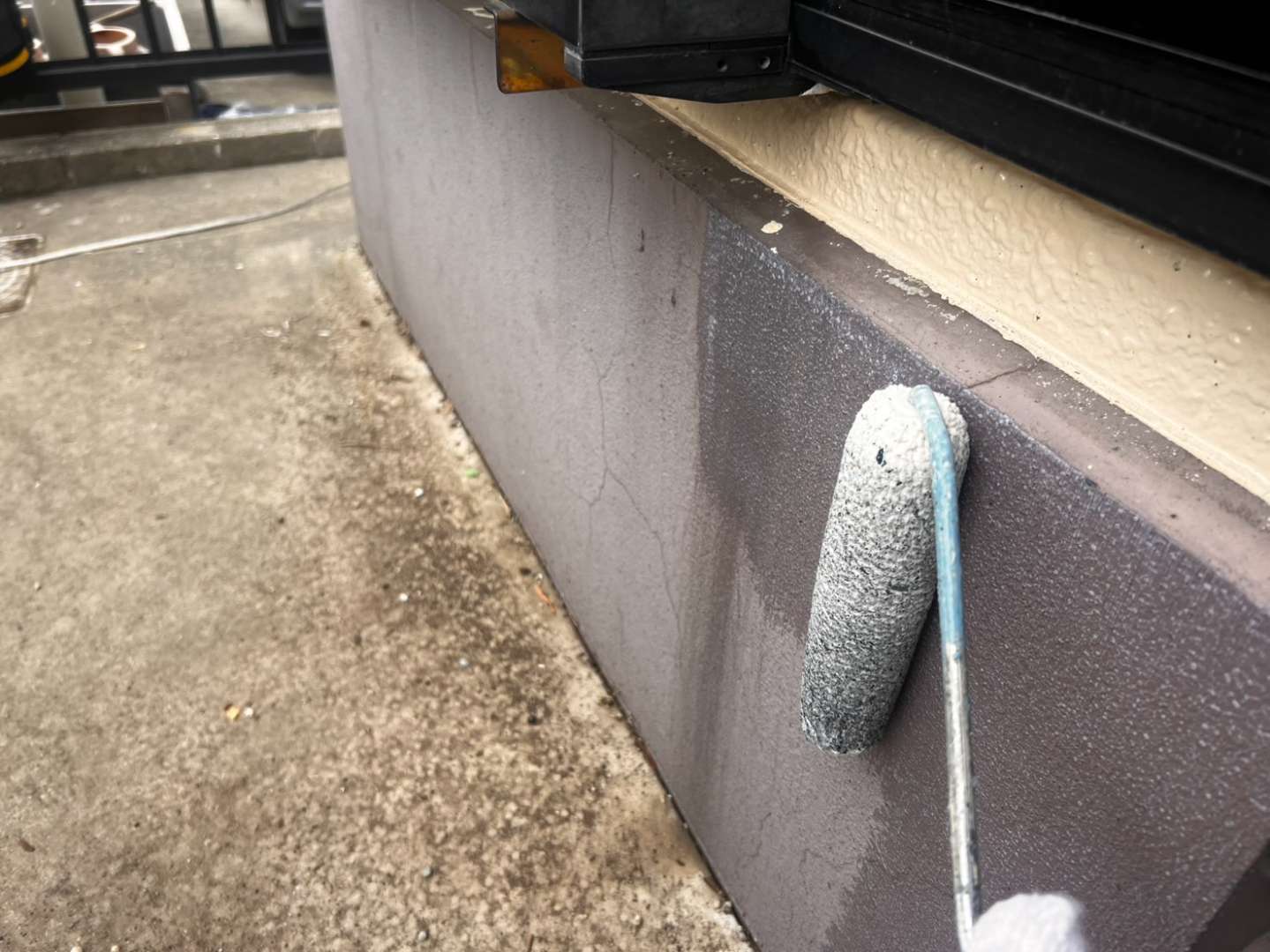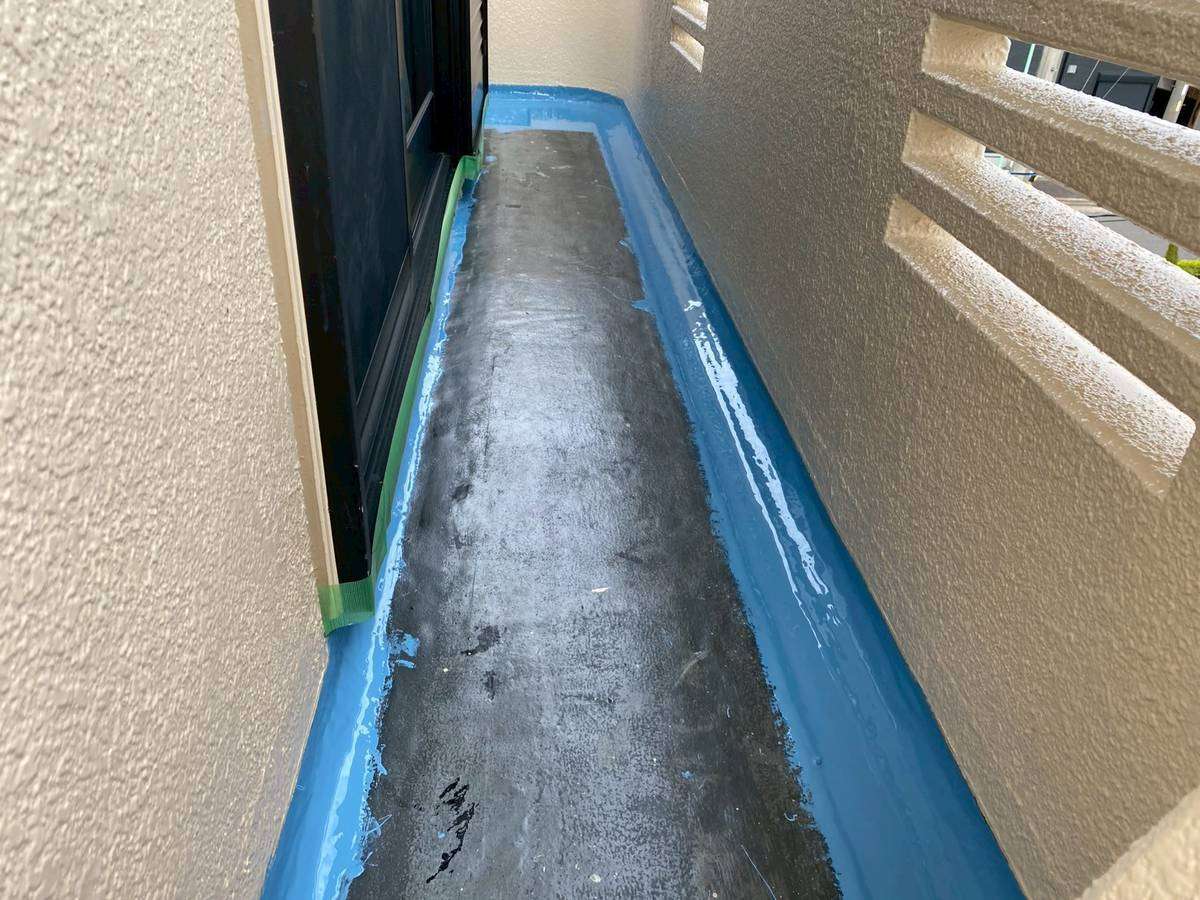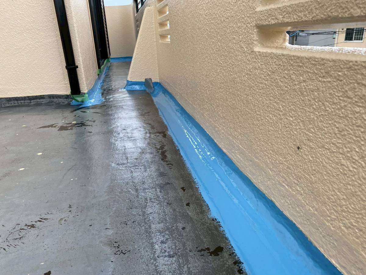 ベランダのウレタン防水のプライマー塗装、立上り・側溝・平場部のウレタン樹脂1層目塗装、基礎・と塀の塗装作業を行っていました。