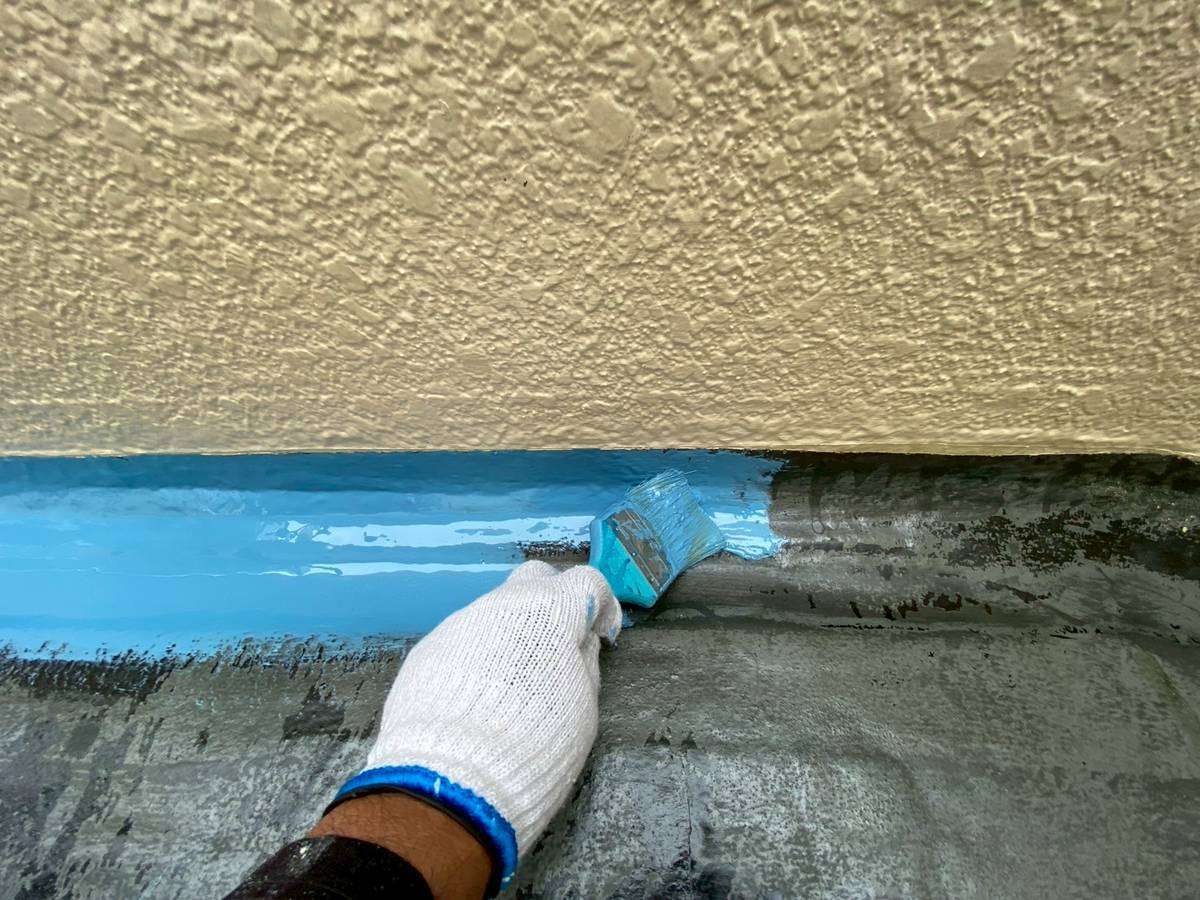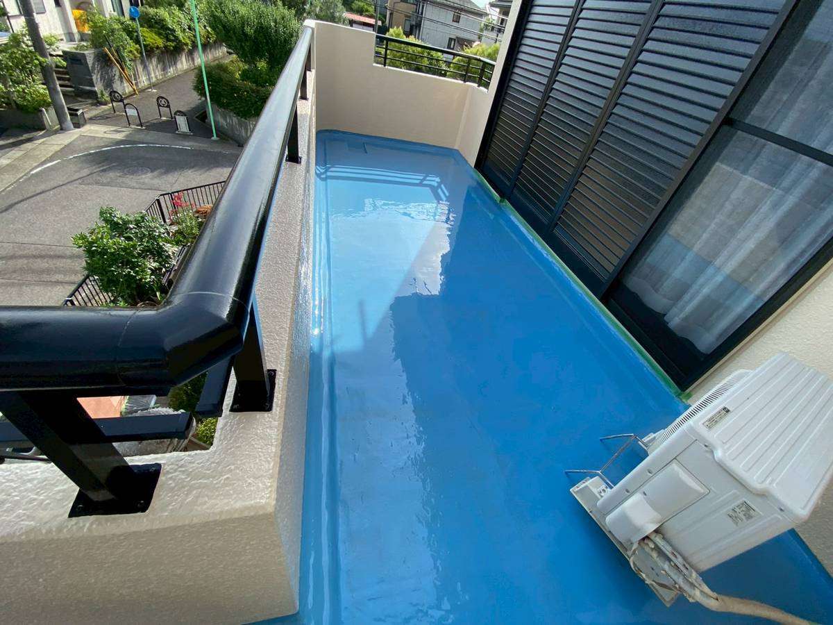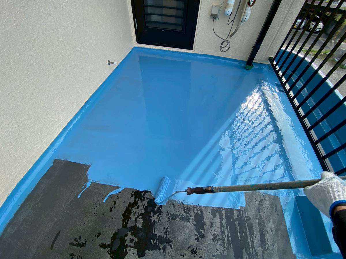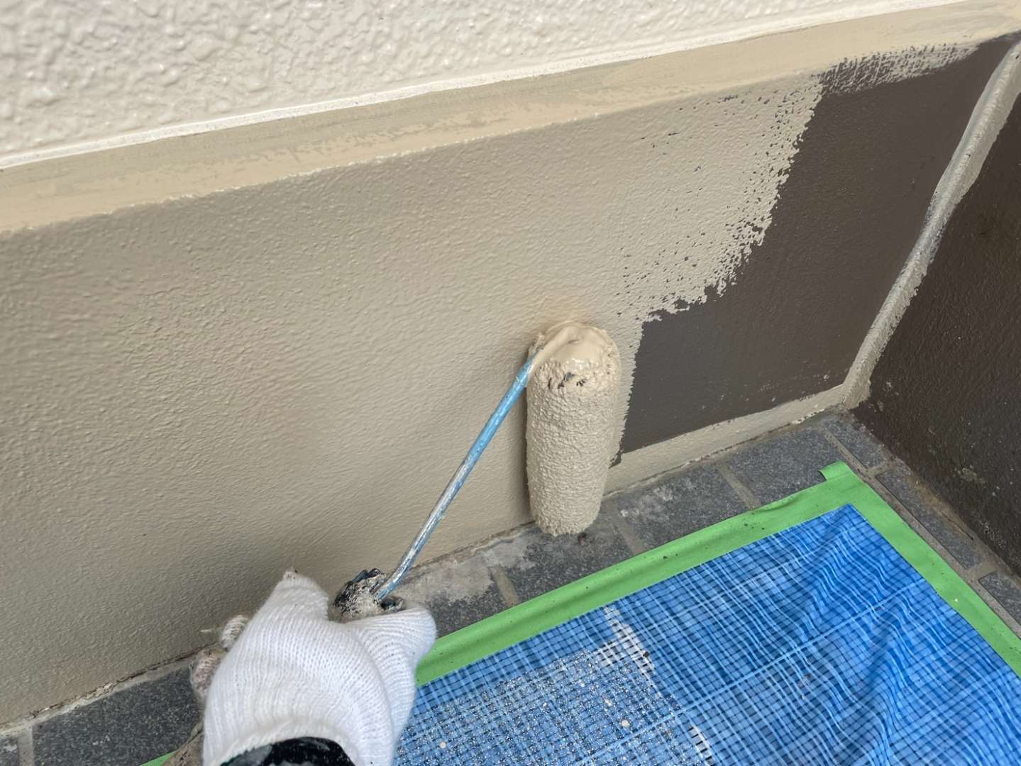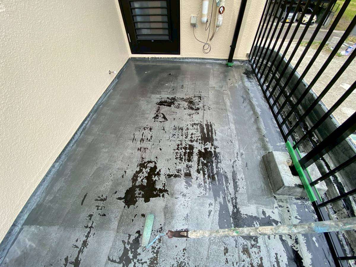 ベランダのウレタン防水のプライマー塗装、立上り・側溝・平場部のウレタン樹脂1層目塗装、基礎・と塀の塗装作業を行っていました。