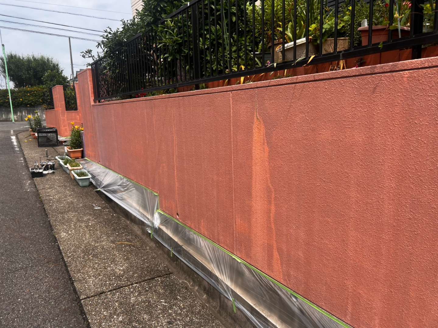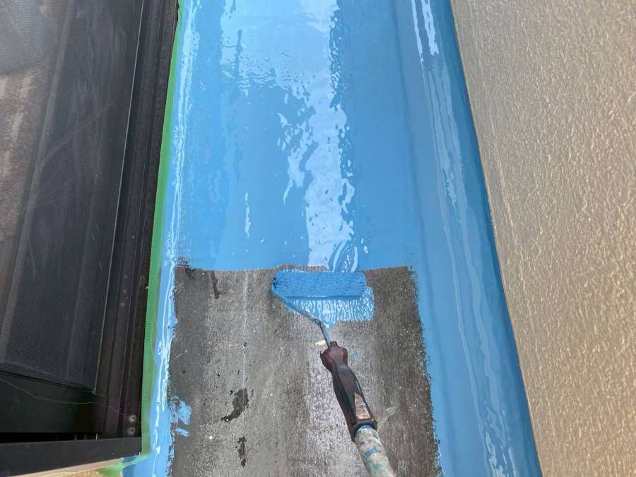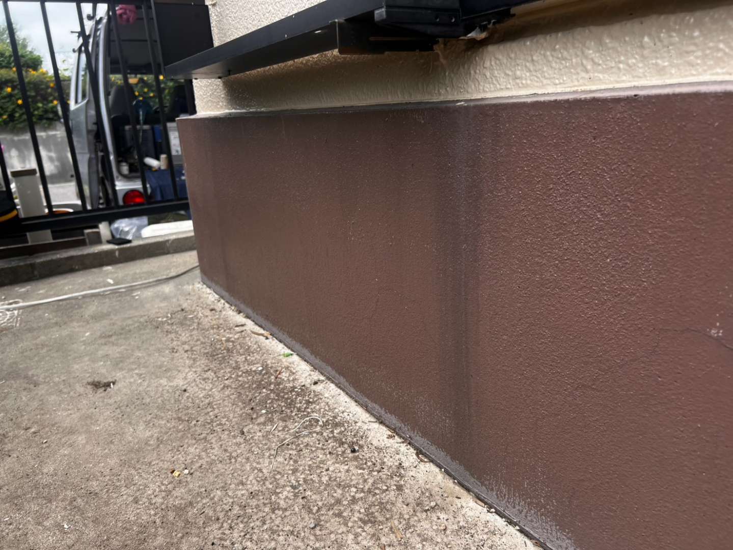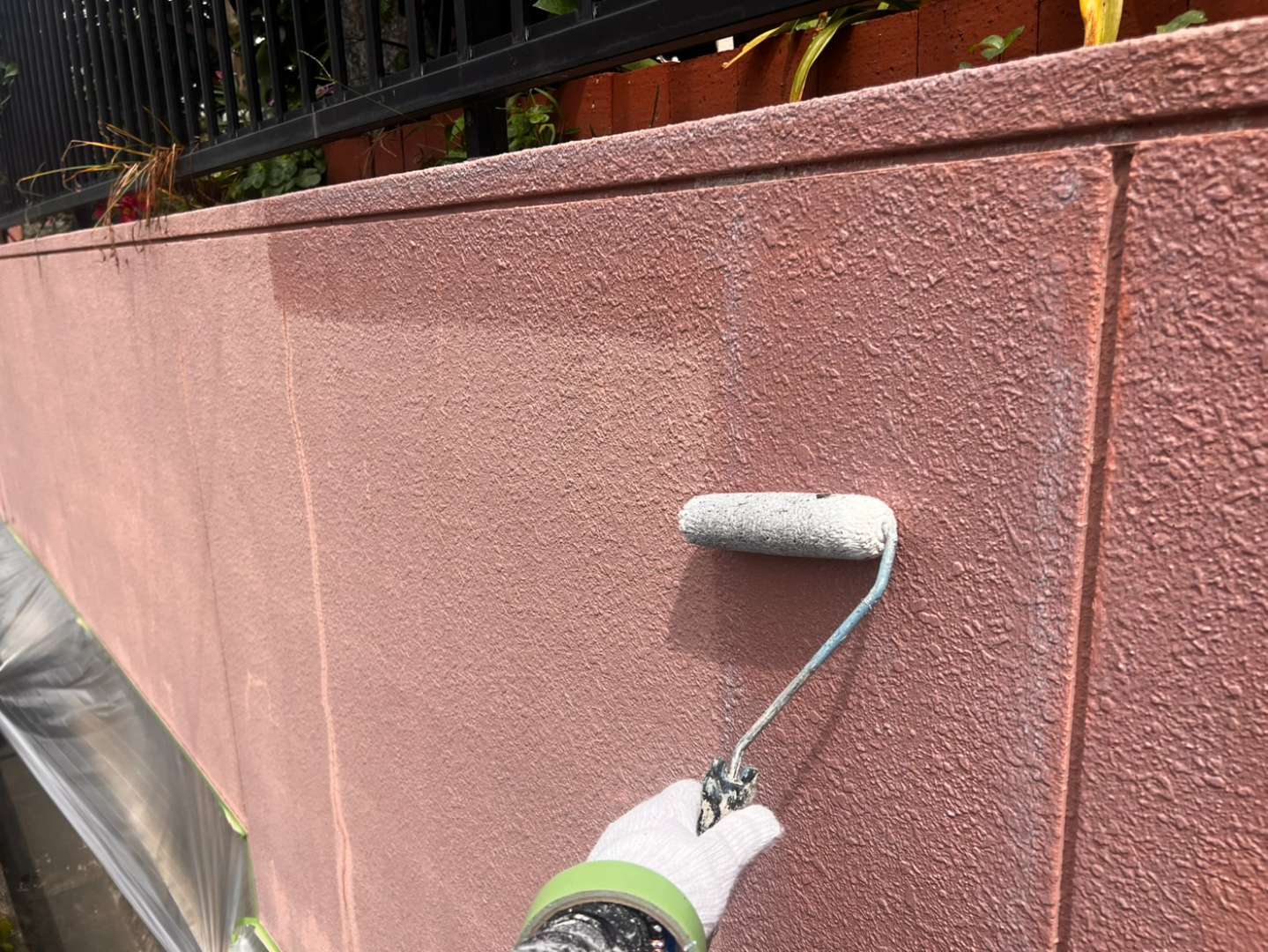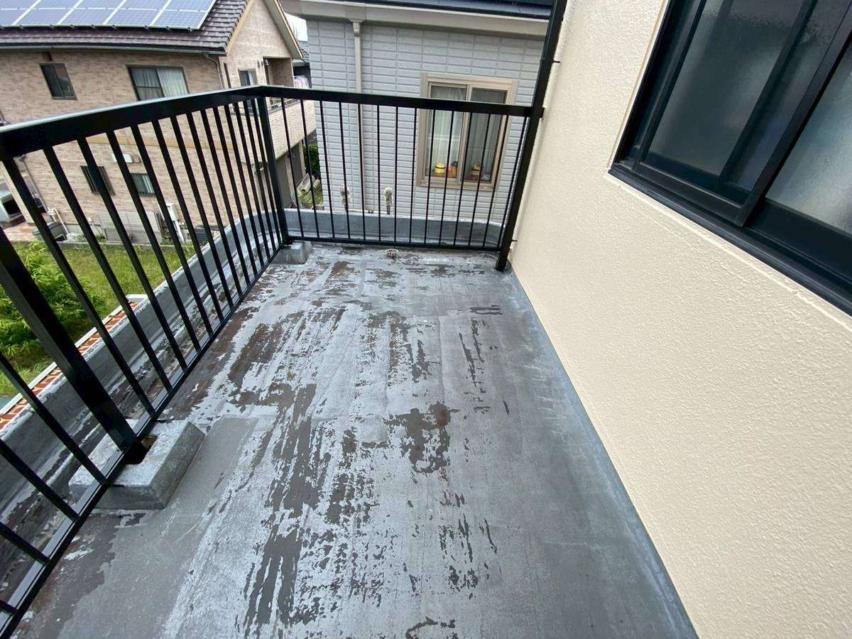 ベランダのウレタン防水のプライマー塗装、立上り・側溝・平場部のウレタン樹脂1層目塗装、基礎・と塀の塗装作業を行っていました。