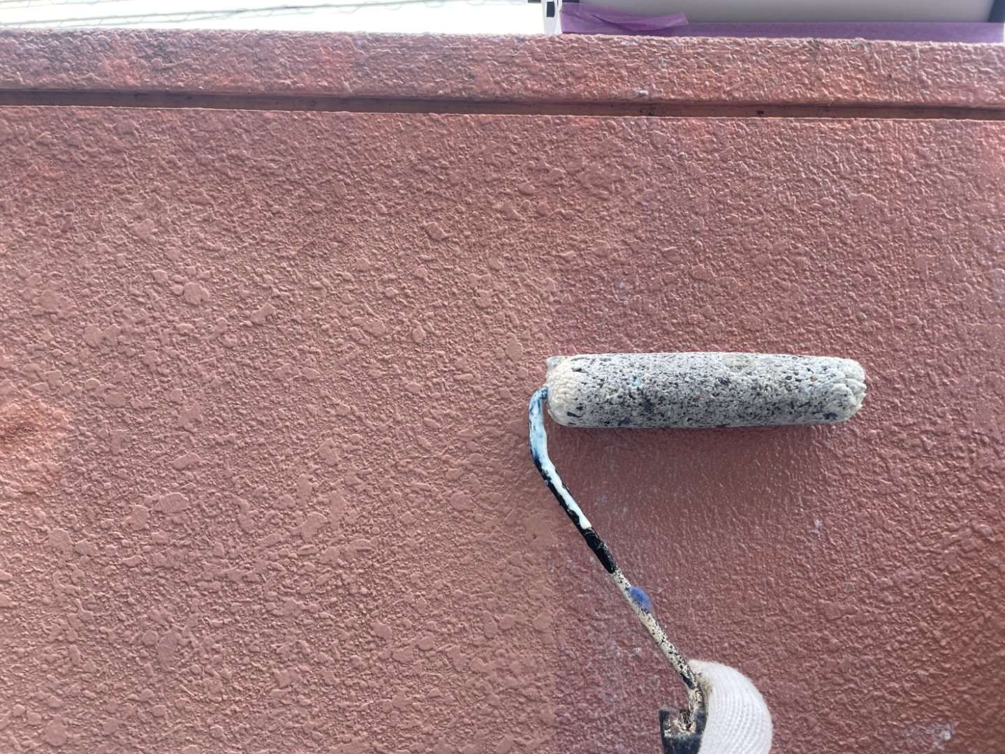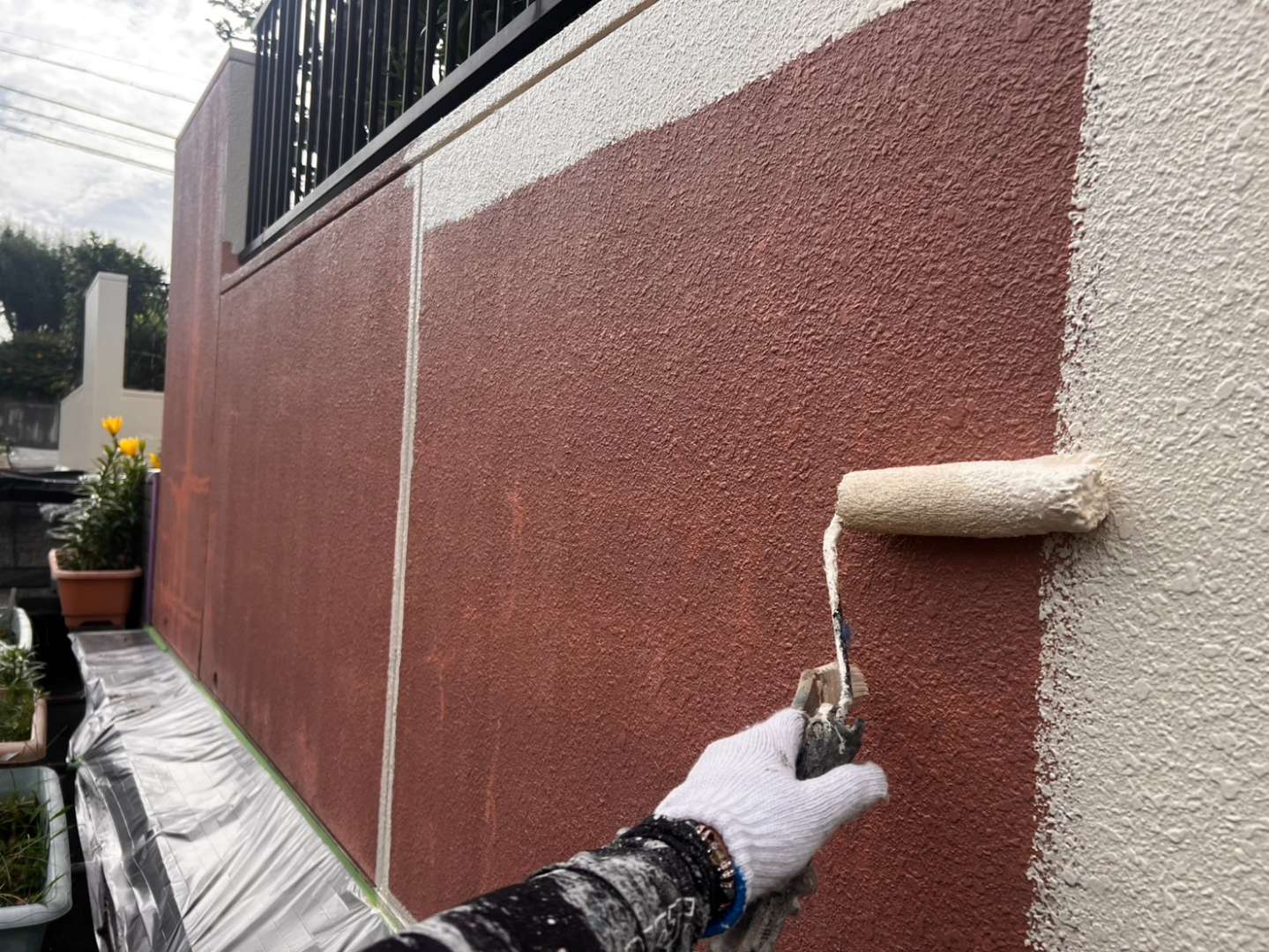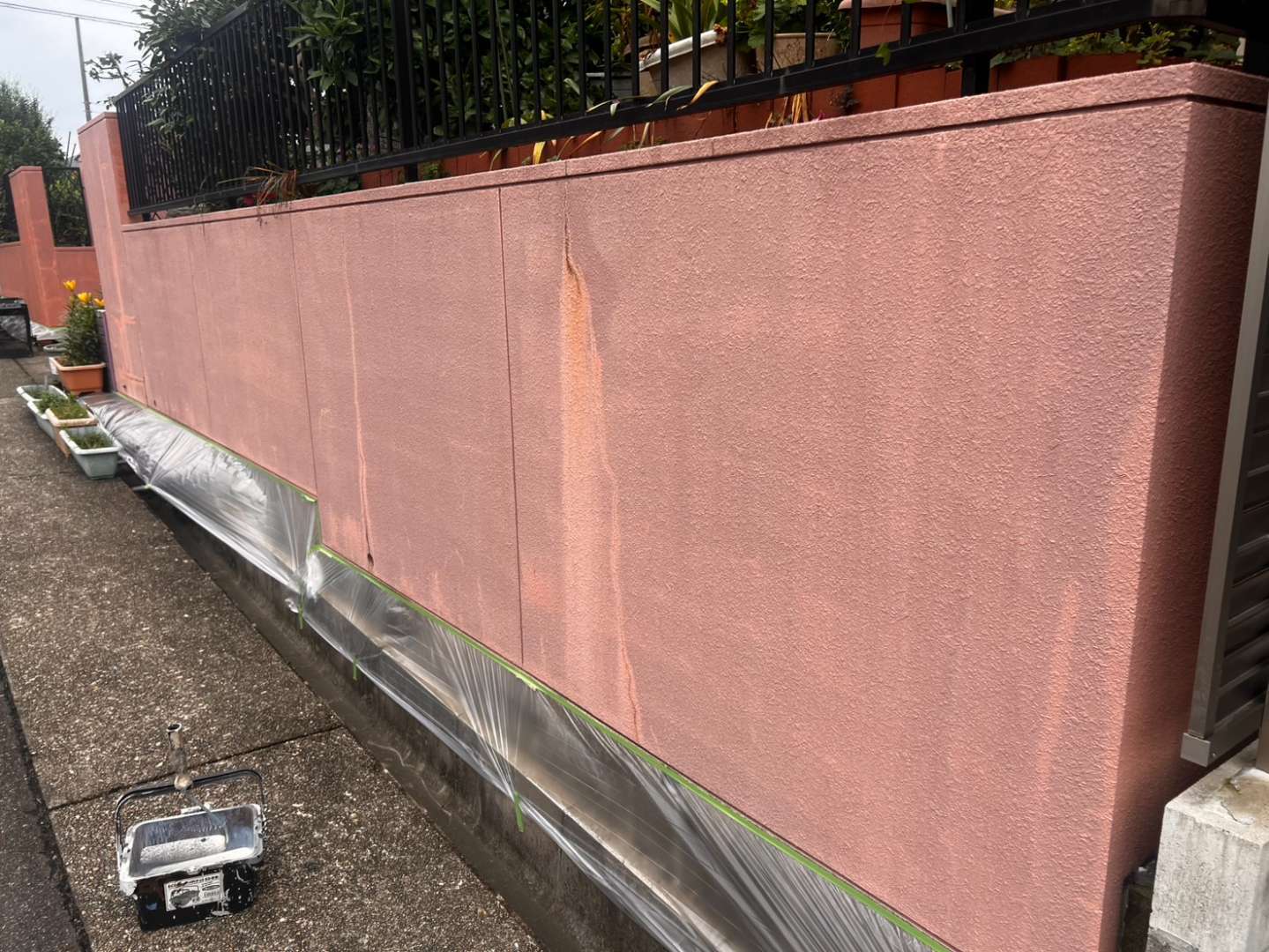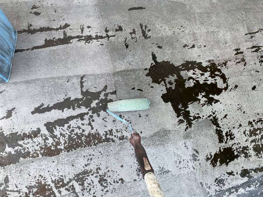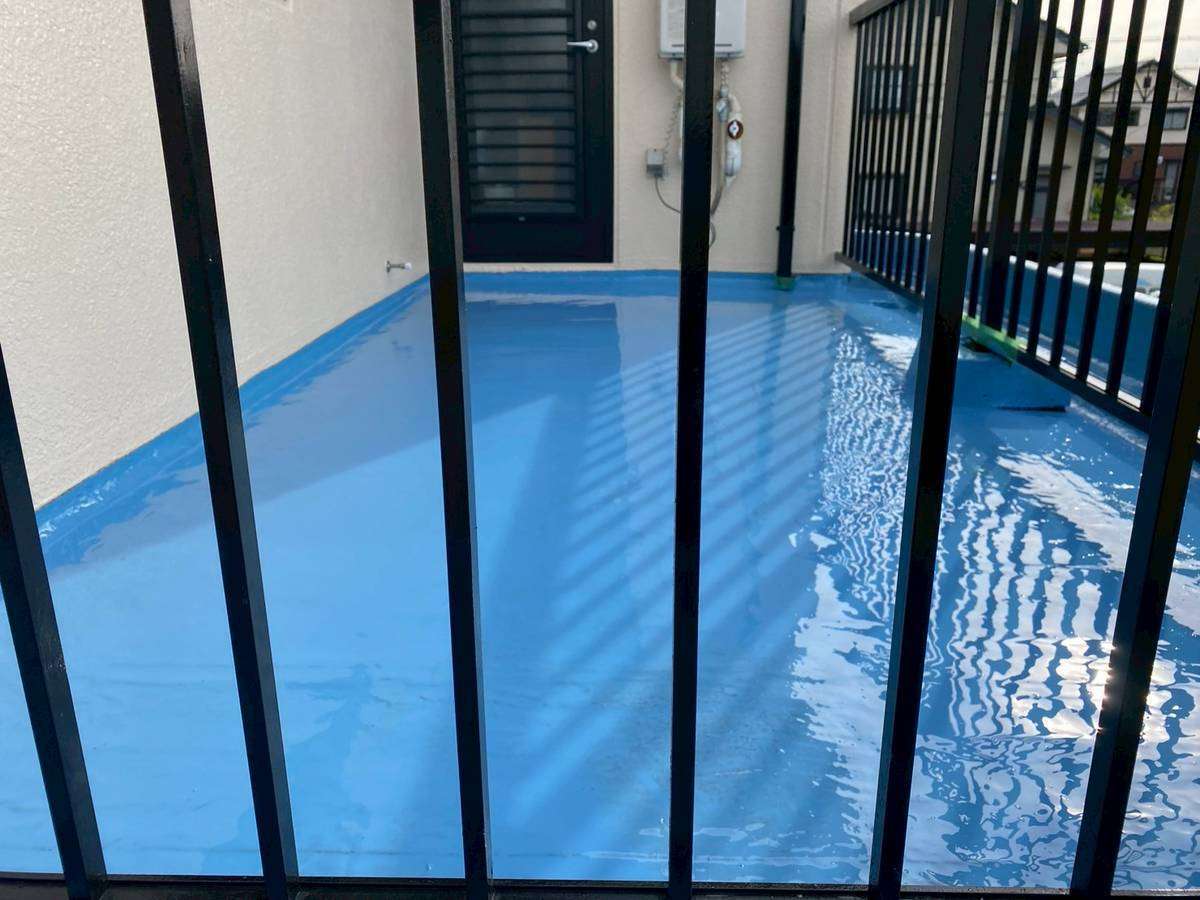 ベランダのウレタン防水のプライマー塗装、立上り・側溝・平場部のウレタン樹脂1層目塗装、基礎・と塀の塗装作業を行っていました。