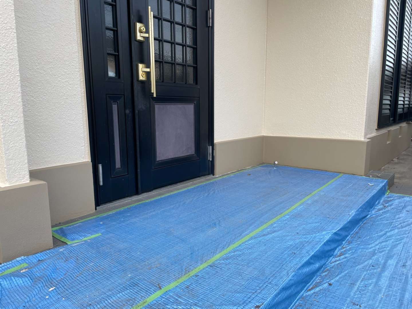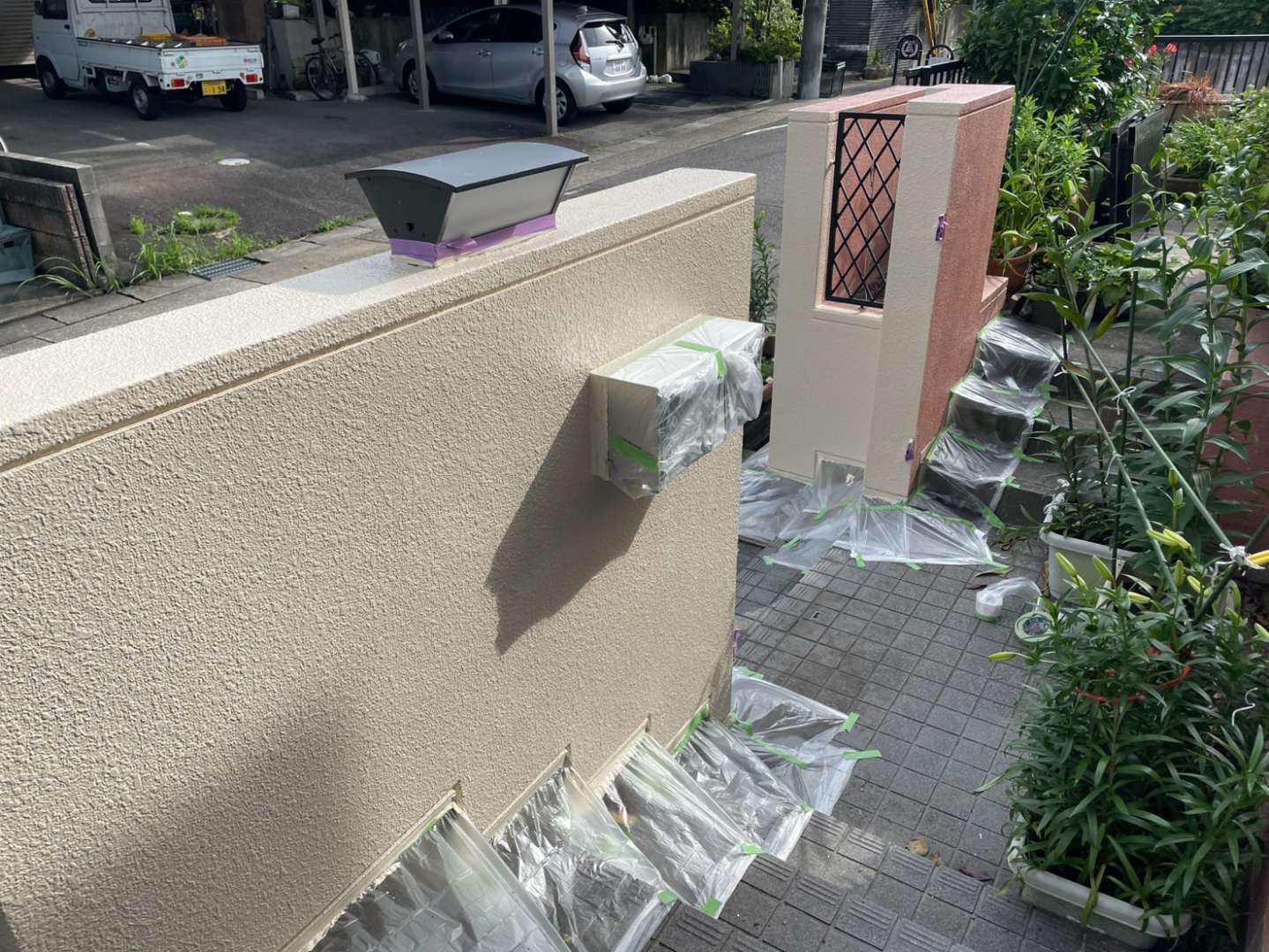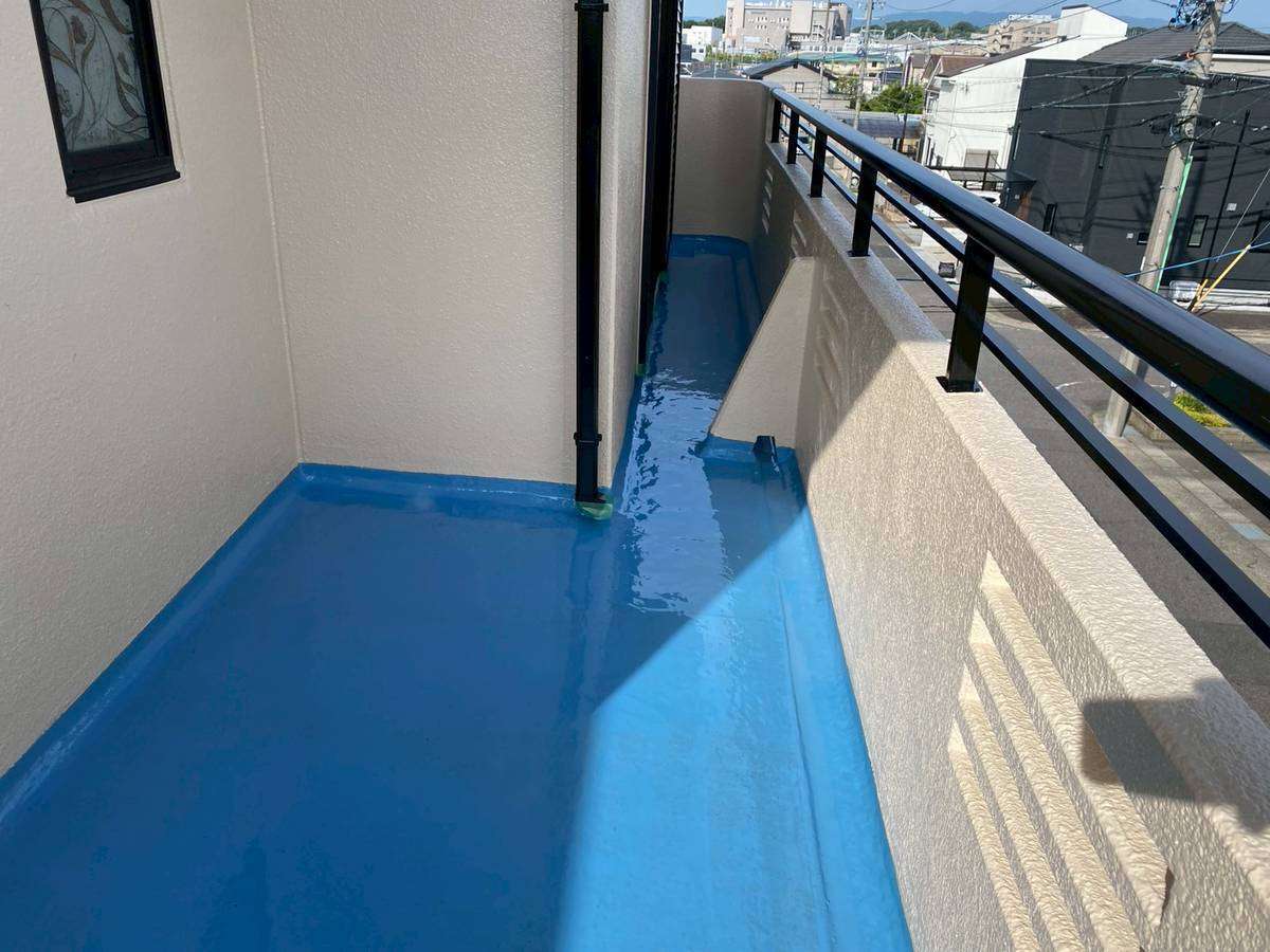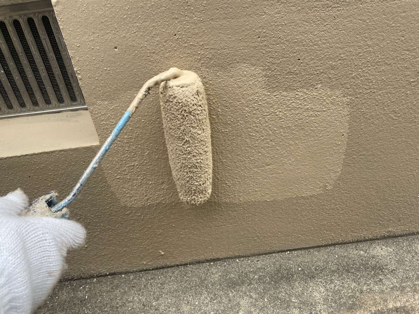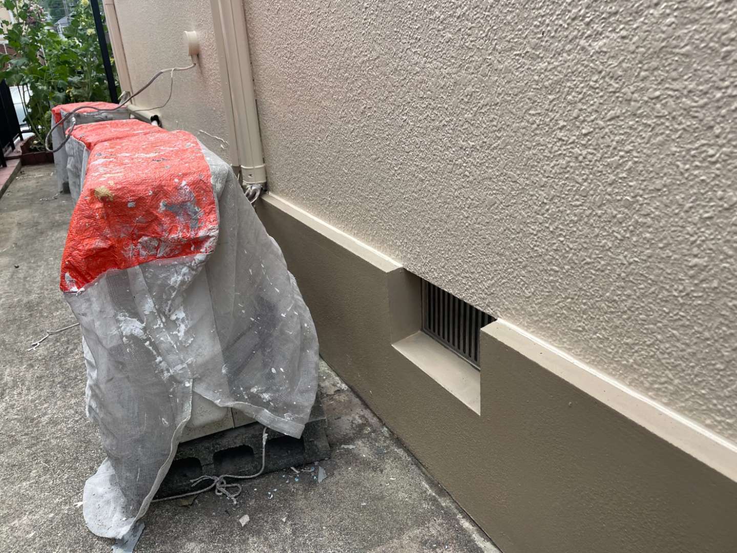 ベランダのウレタン防水のプライマー塗装、立上り・側溝・平場部のウレタン樹脂1層目塗装、基礎・と塀の塗装作業を行っていました。