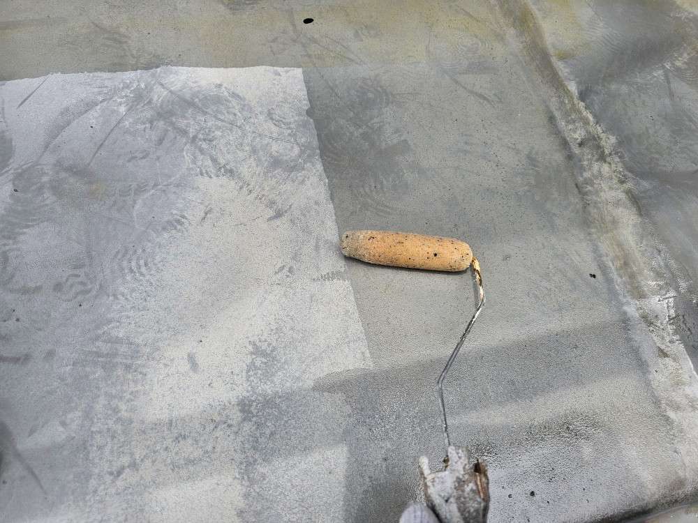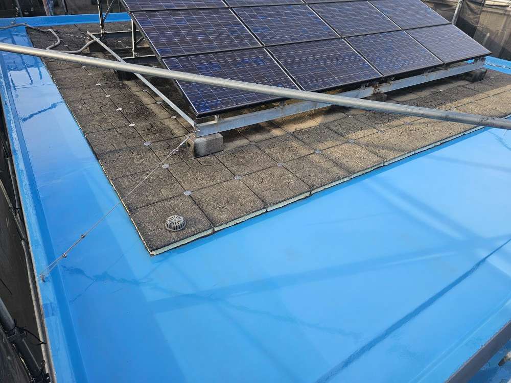 O様邸の昨日の作業は、屋上・ベランダ・バルコニーの塩ビシートプライマー塗装と立上り部・平場部のウレタン樹脂1層塗装作業を行いました。