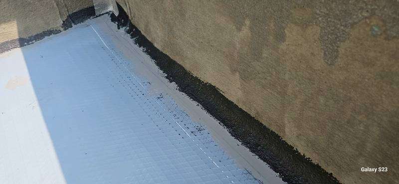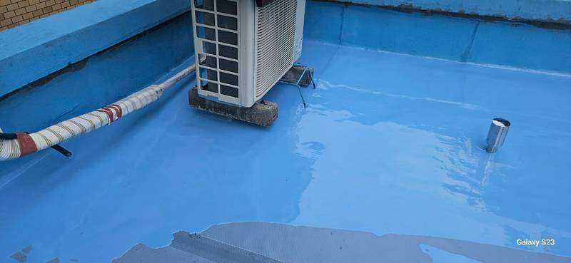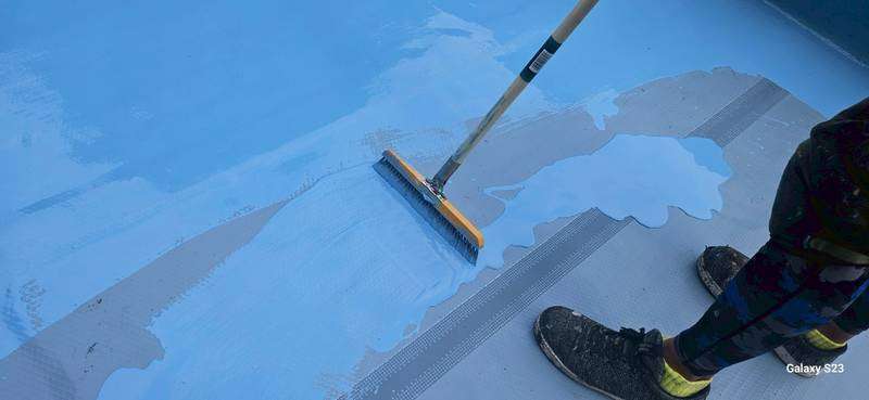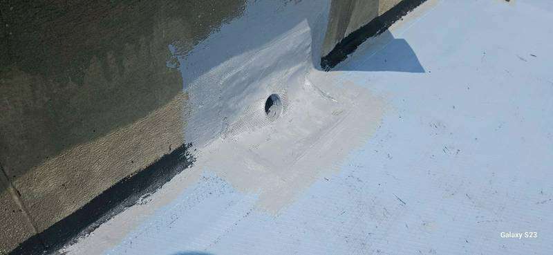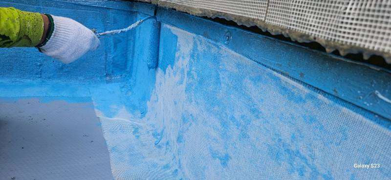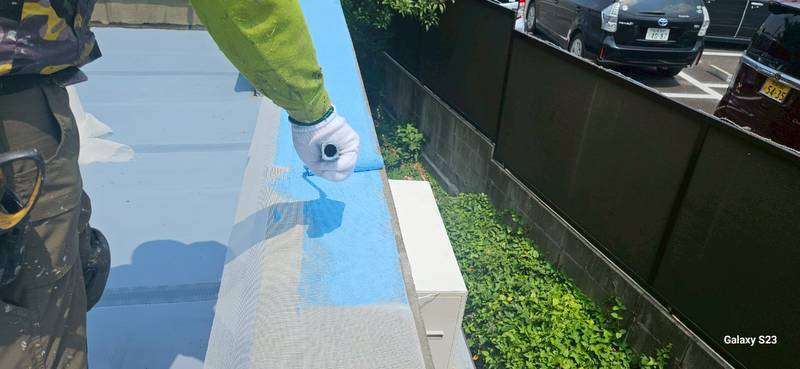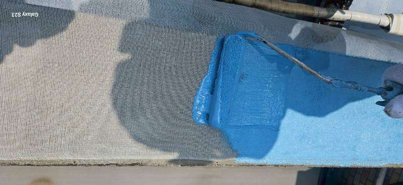 今日の作業は、立上り部のウレタン樹脂1層目・2層目塗装と平場部のウレタン樹脂2層目塗装作業予定です。
