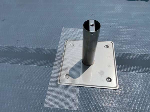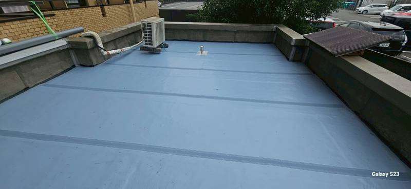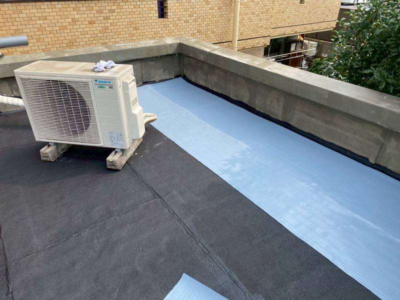 Pマンション様の作業は、ウレタン通気工法防水の通気シート貼り、脱気筒・改修ドレン取付け、コーキング処理、立上り部のメッシュシート貼付け・平場部のウレタン1層目塗装作業まで完了しています。