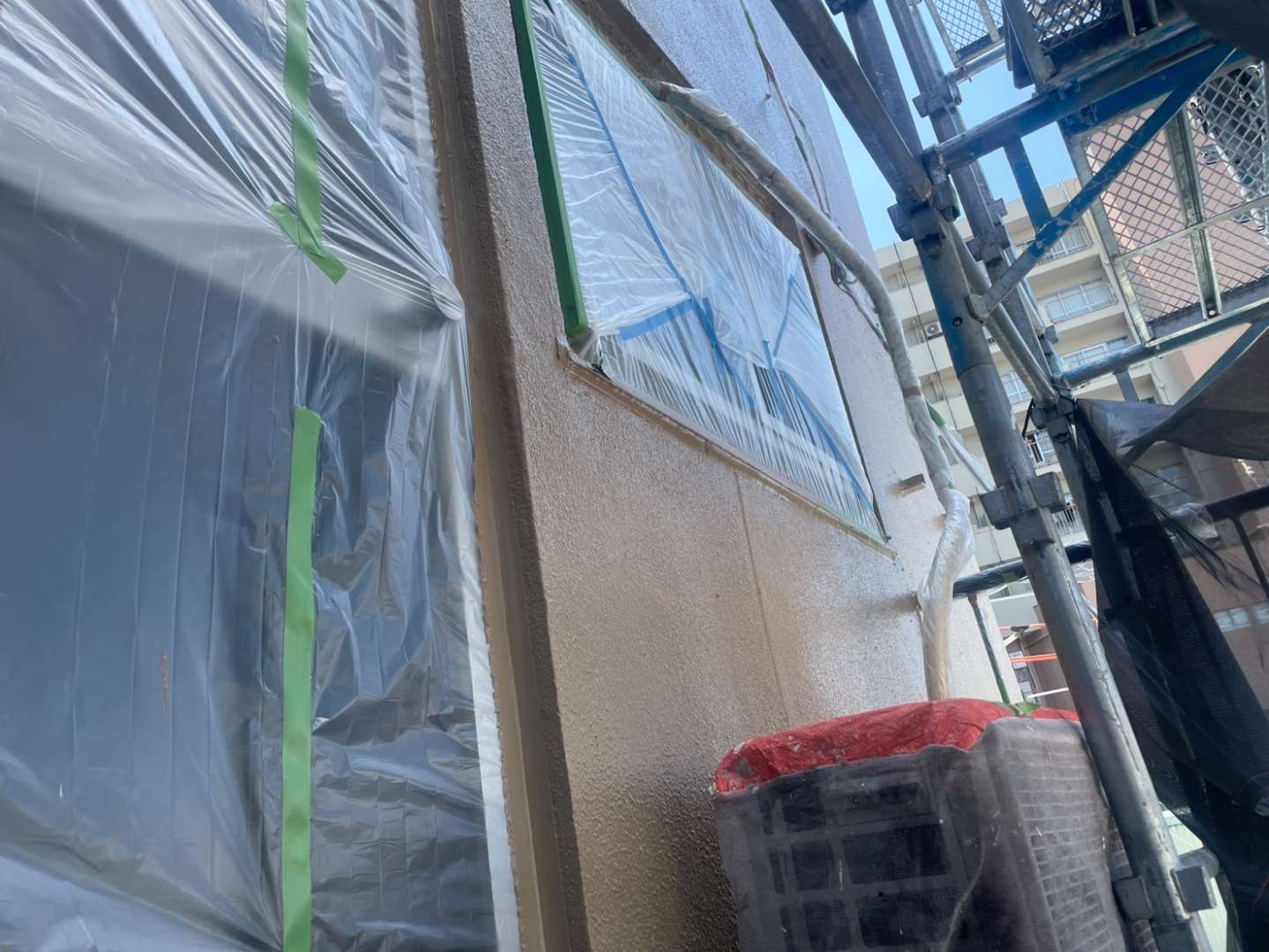今日の作業は、引き続き外壁の上塗り塗装・付帯部塗装作業予定です。