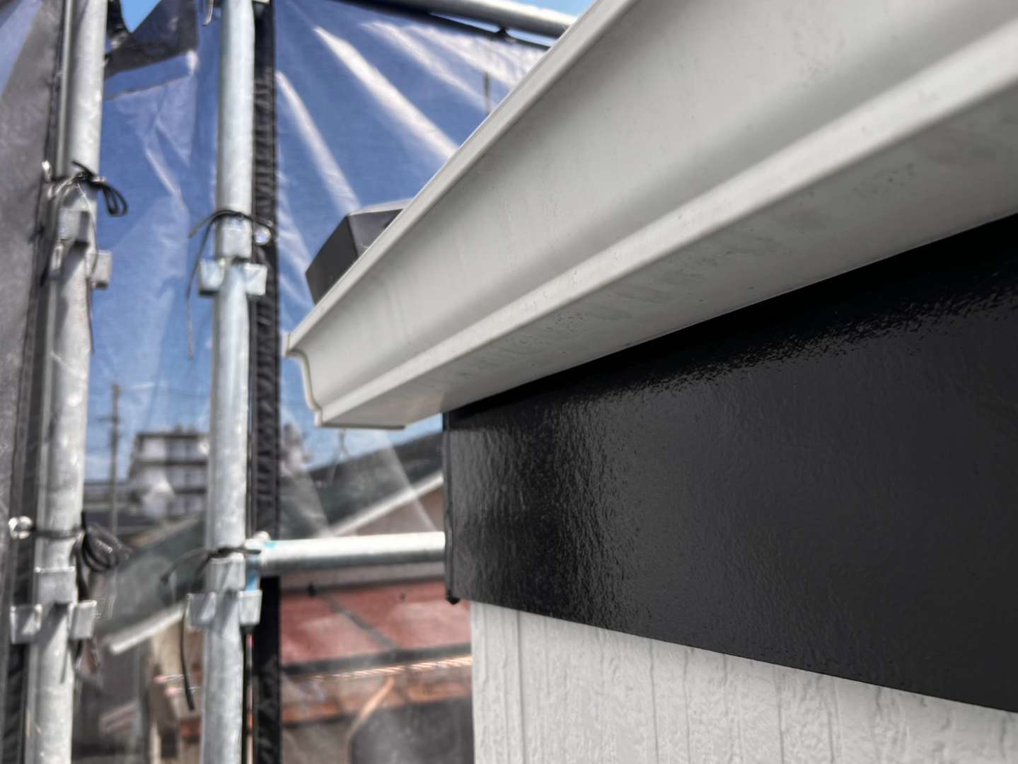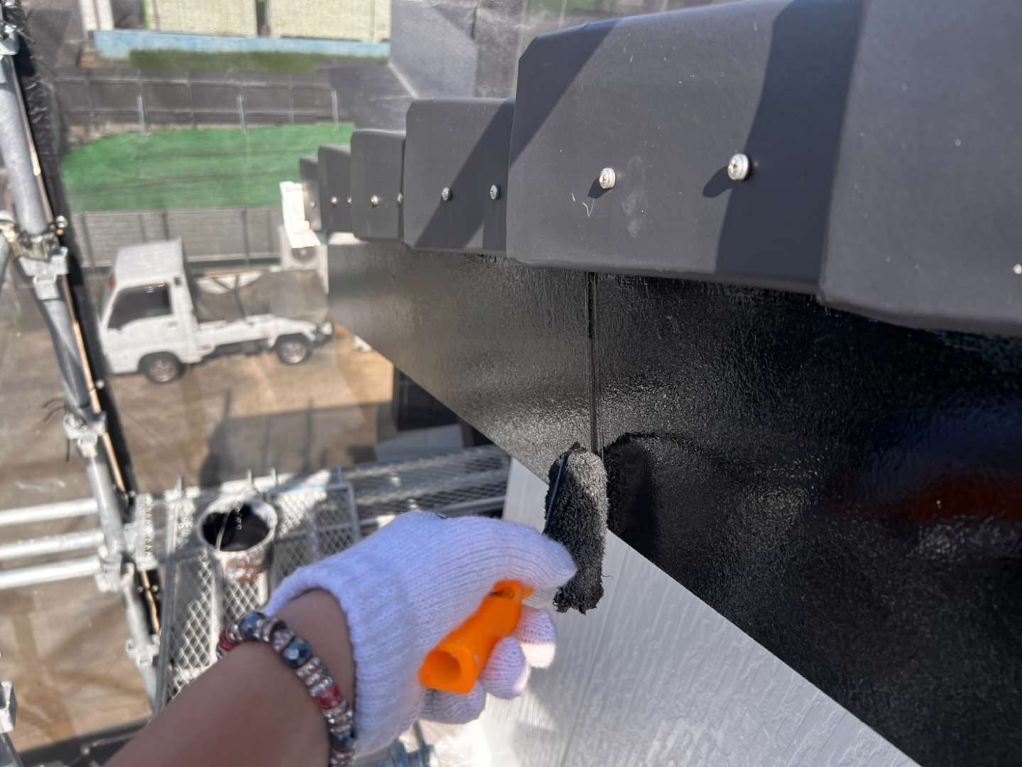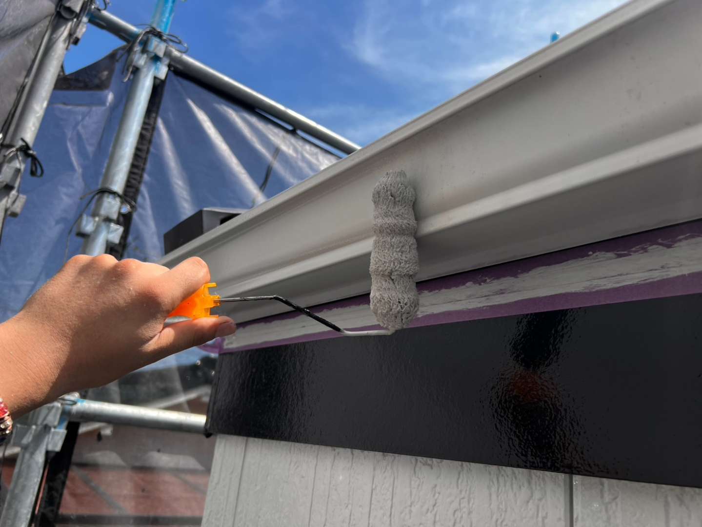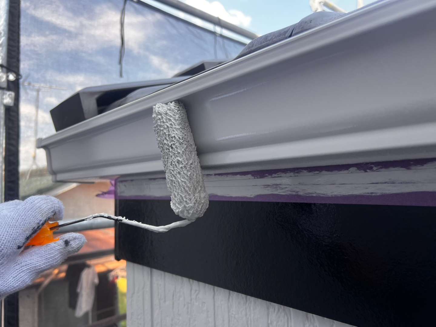 破風板・鼻隠し板・軒樋の上塗り2回目塗装、水切りの下塗り(錆止め)塗装、雨樋の上塗り1回目・2回目塗装です。