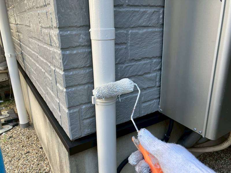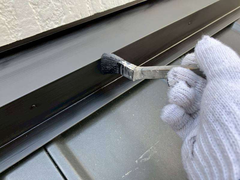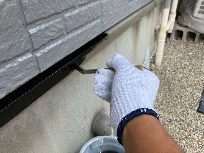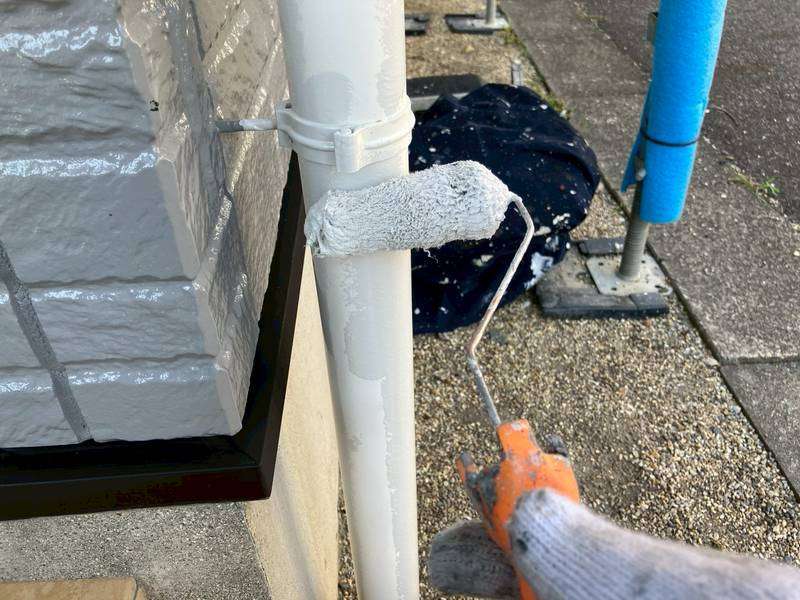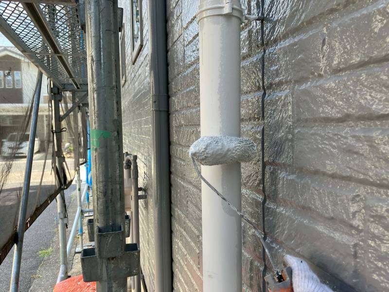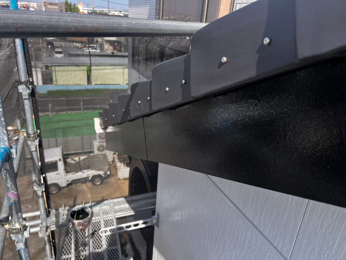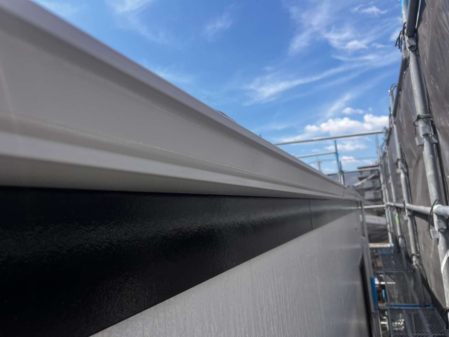 破風板・鼻隠し板・軒樋の上塗り2回目塗装、水切りの下塗り(錆止め)塗装、雨樋の上塗り1回目・2回目塗装です。