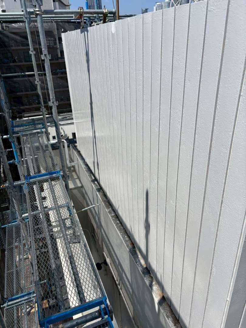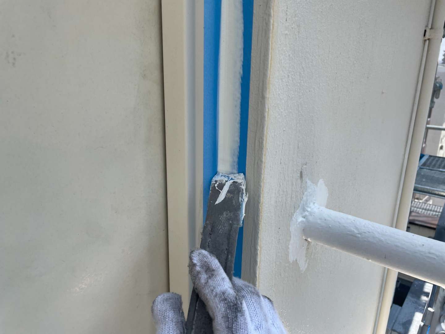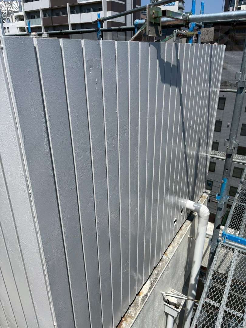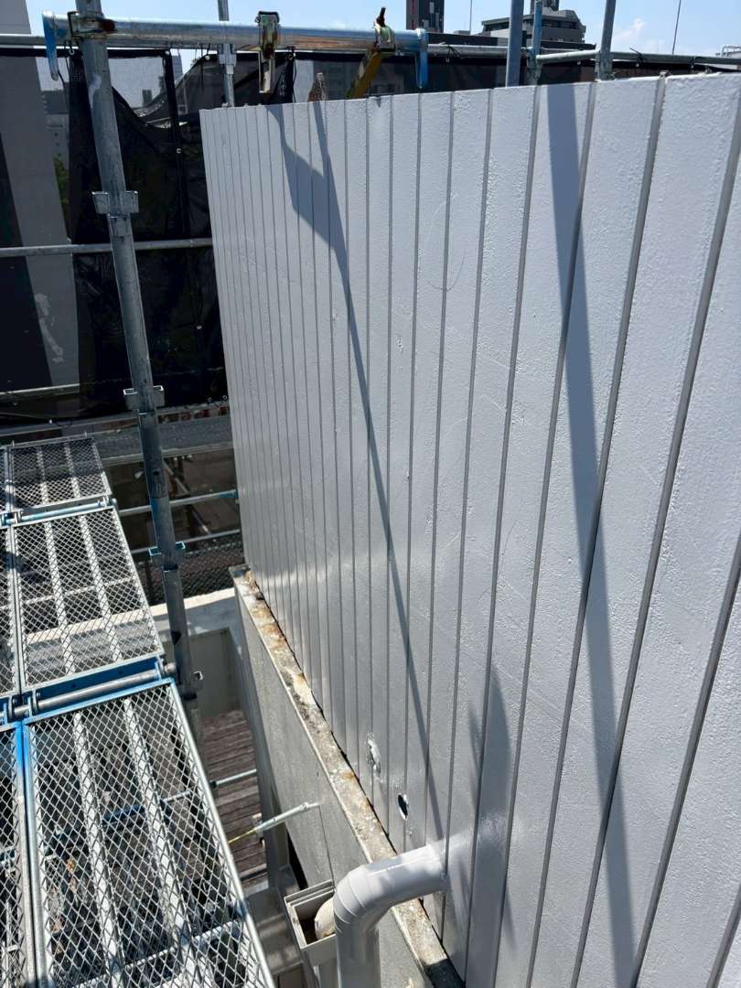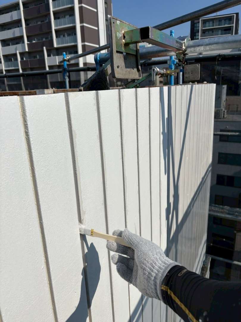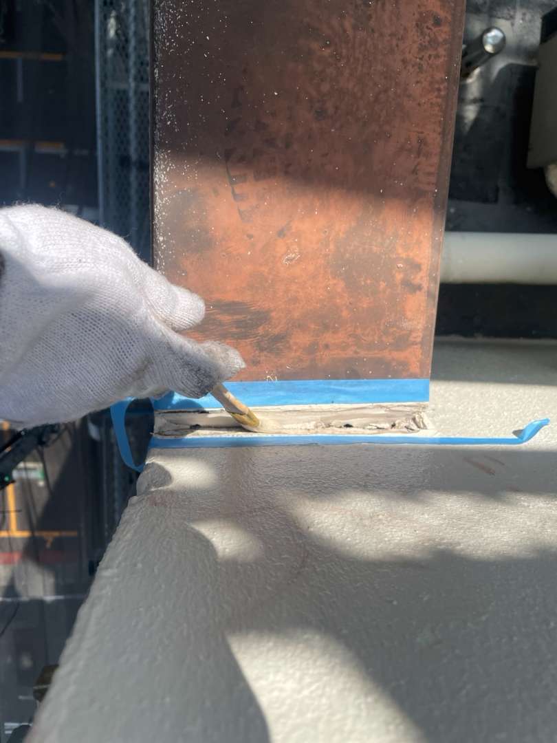 Jビル様の昨日の作業は、コーキング(シーリング)作業・屋上のトタン部の中塗り、上塗り塗装作業を行っていました。