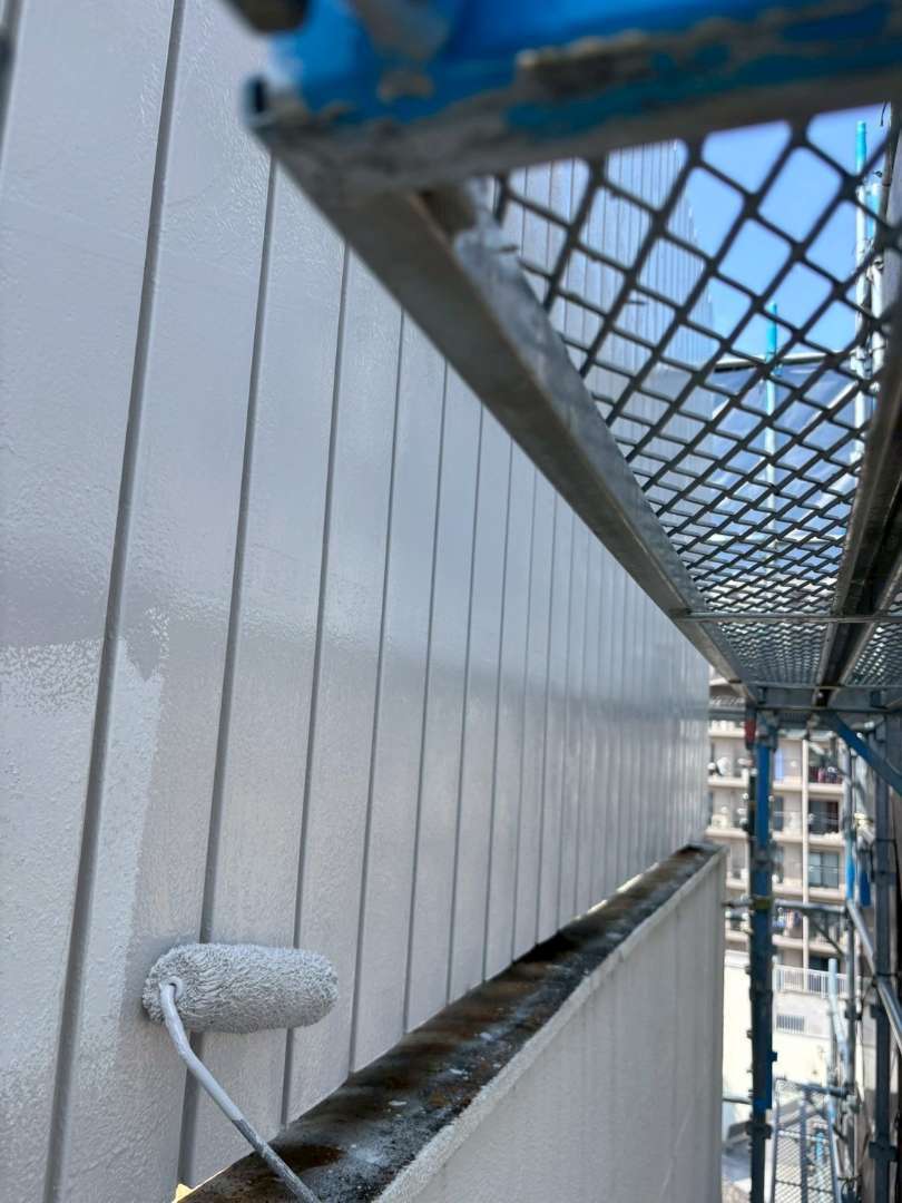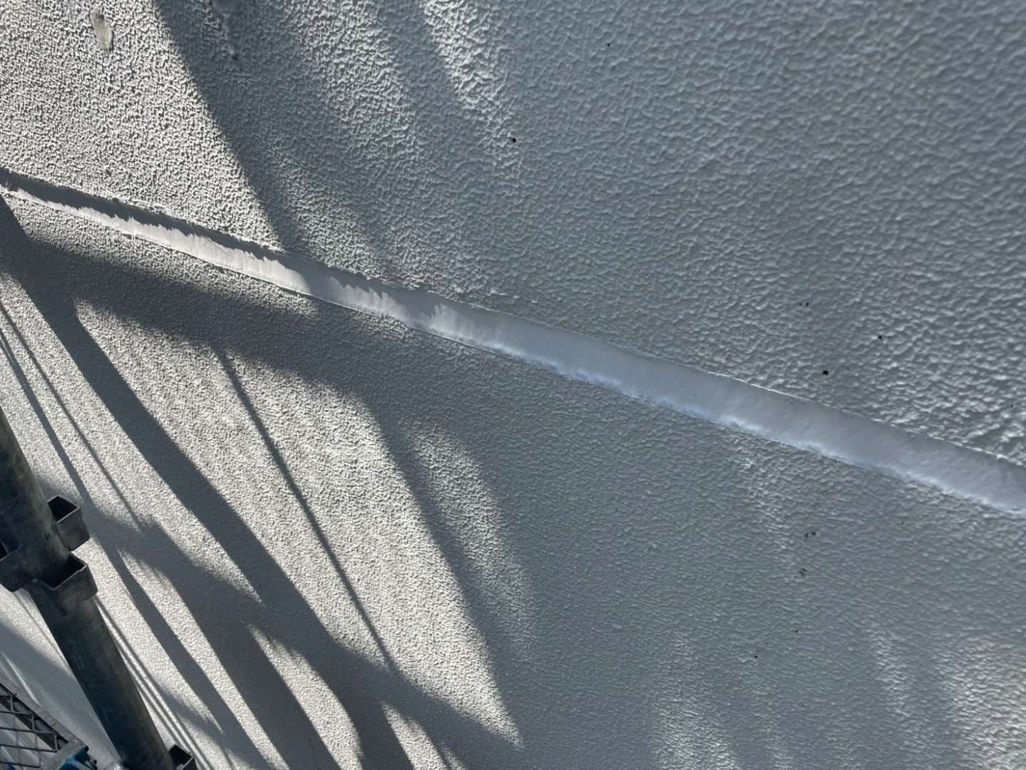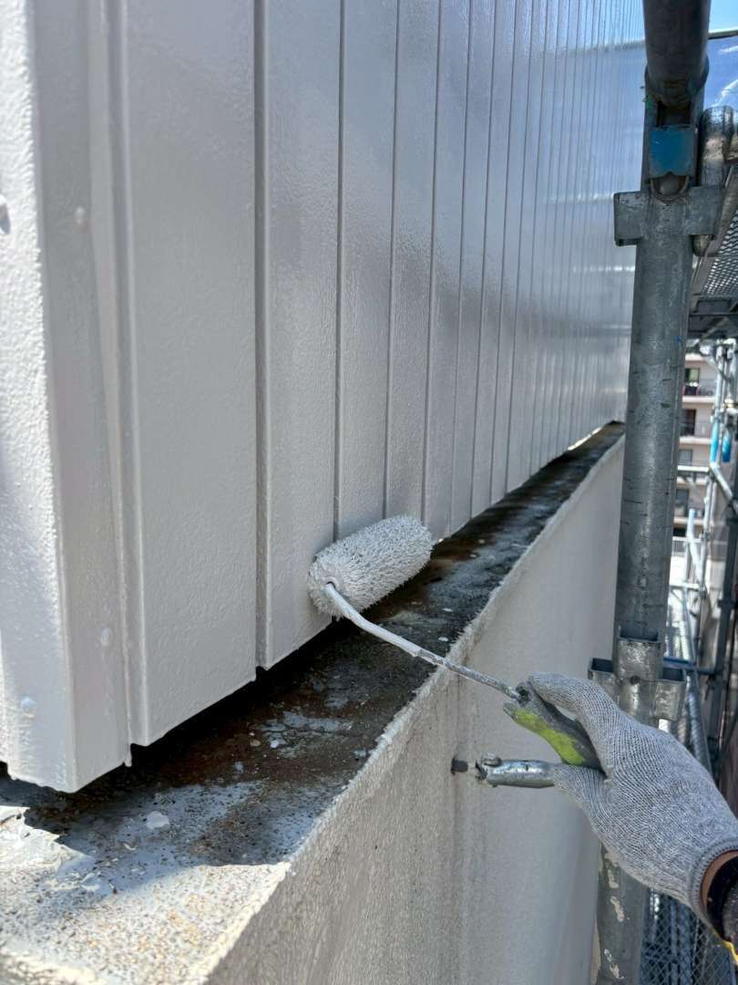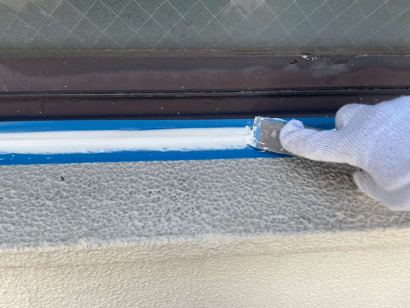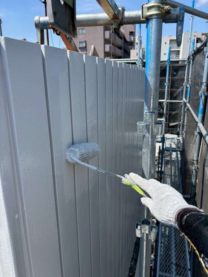Jビル様の昨日の作業は、コーキング(シーリング)作業・屋上のトタン部の中塗り、上塗り塗装作業を行っていました。