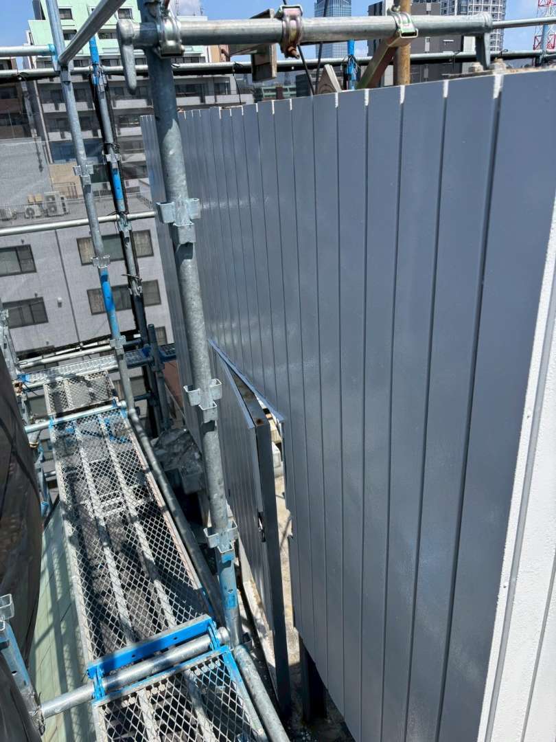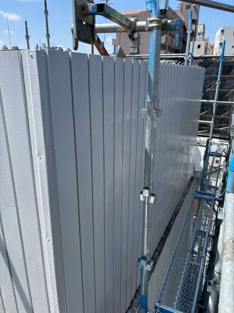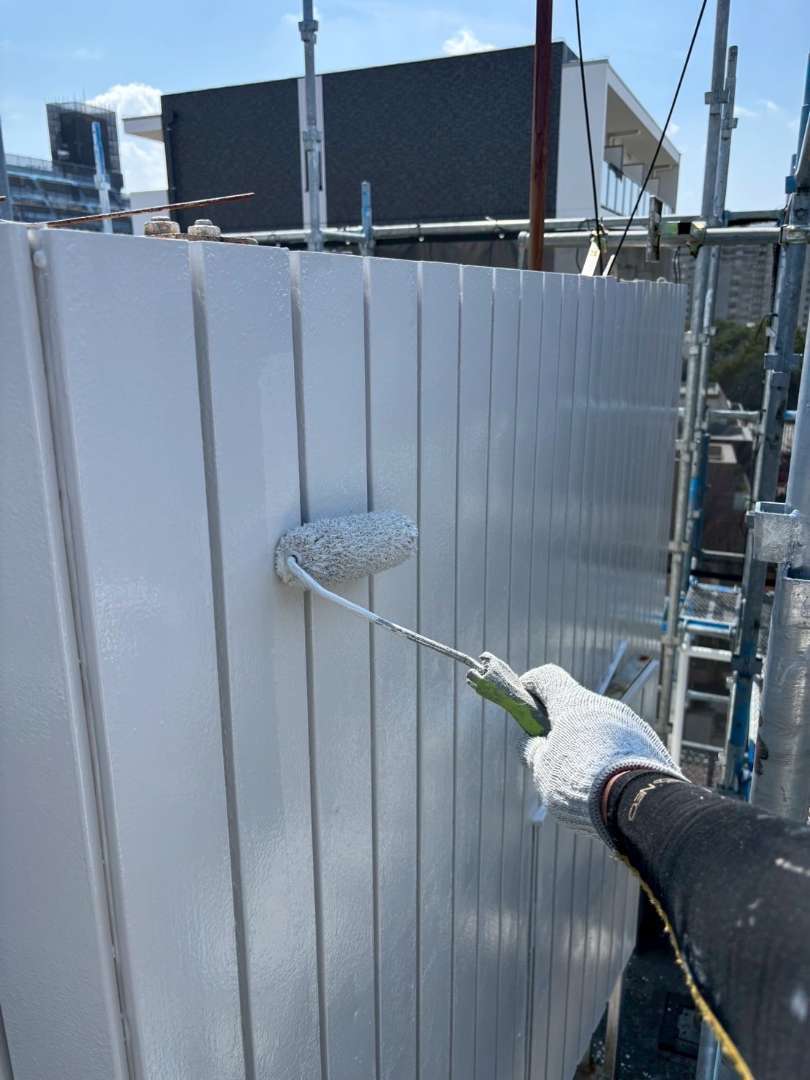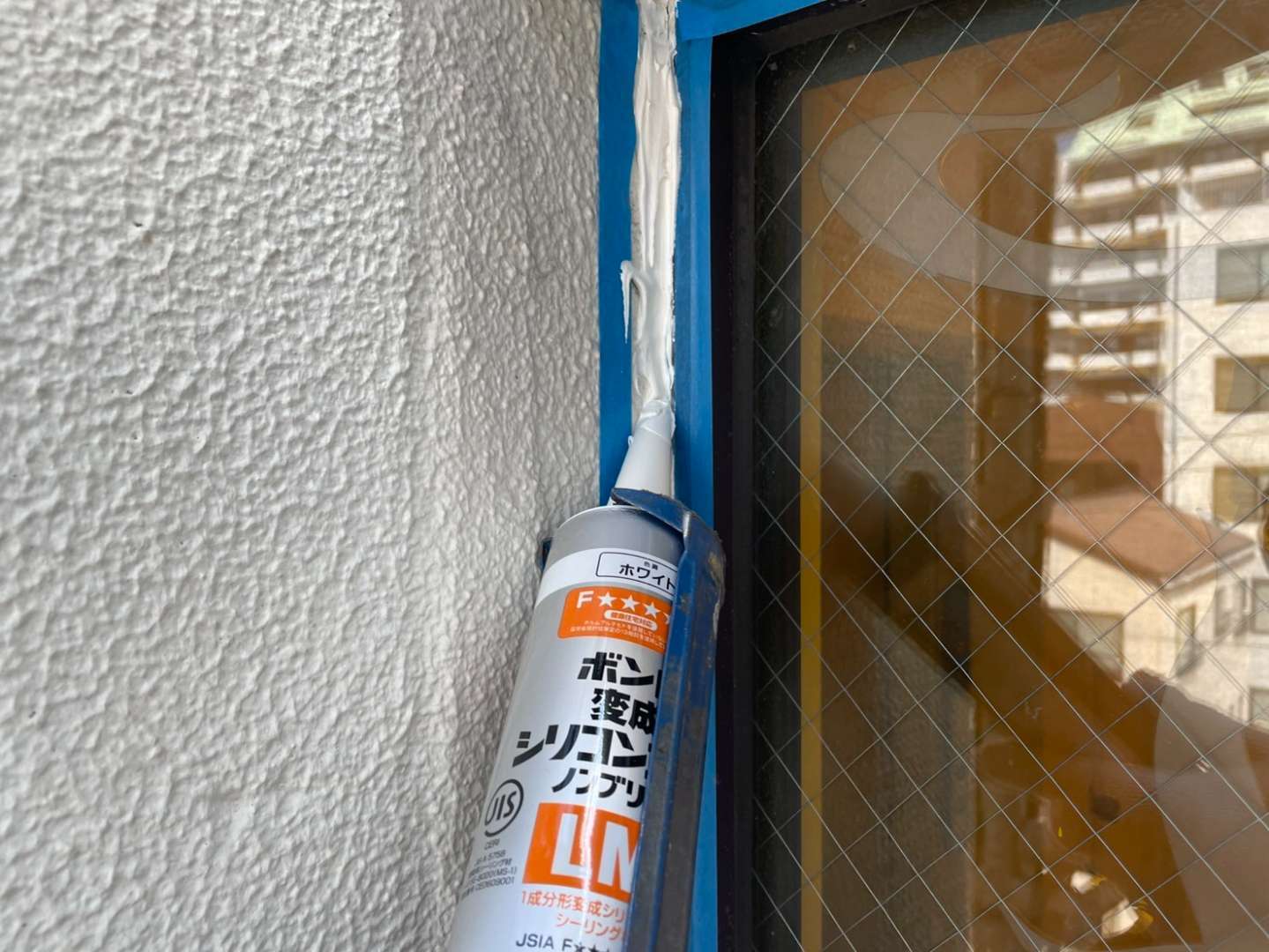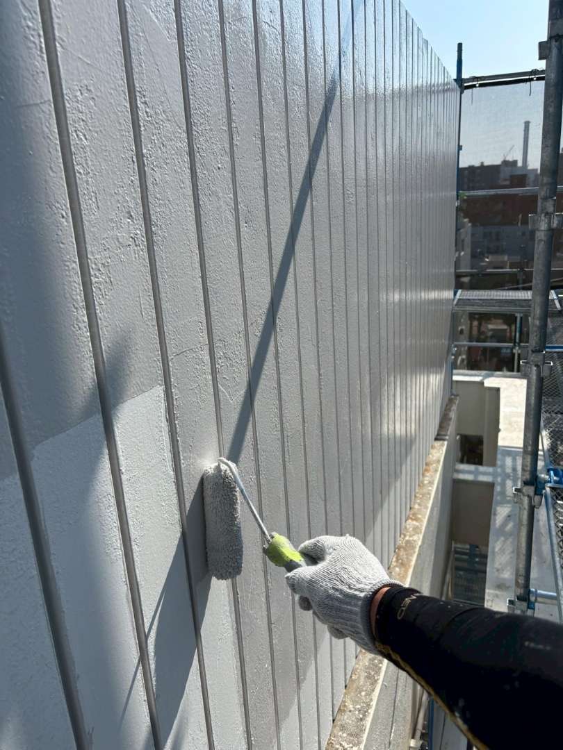 Jビル様の昨日の作業は、コーキング(シーリング)作業・屋上のトタン部の中塗り、上塗り塗装作業を行っていました。