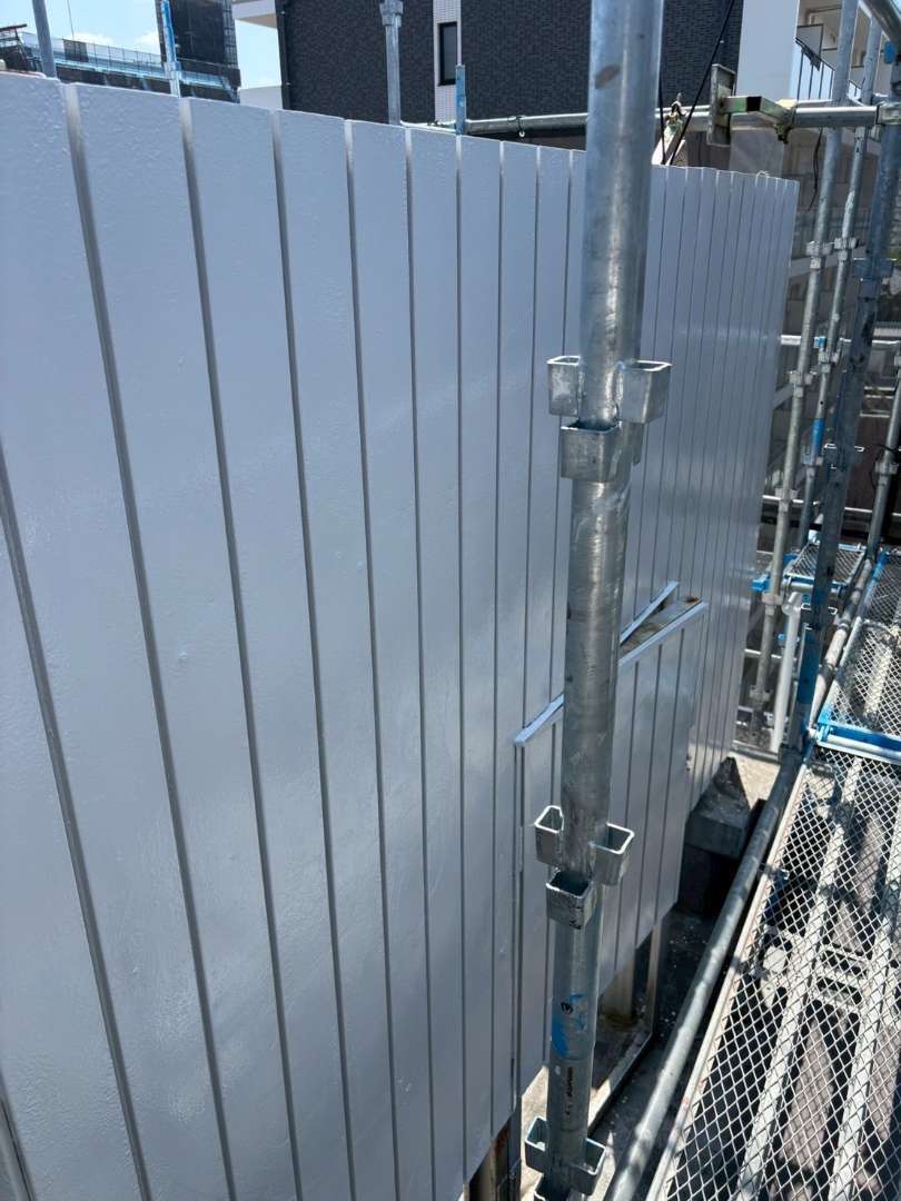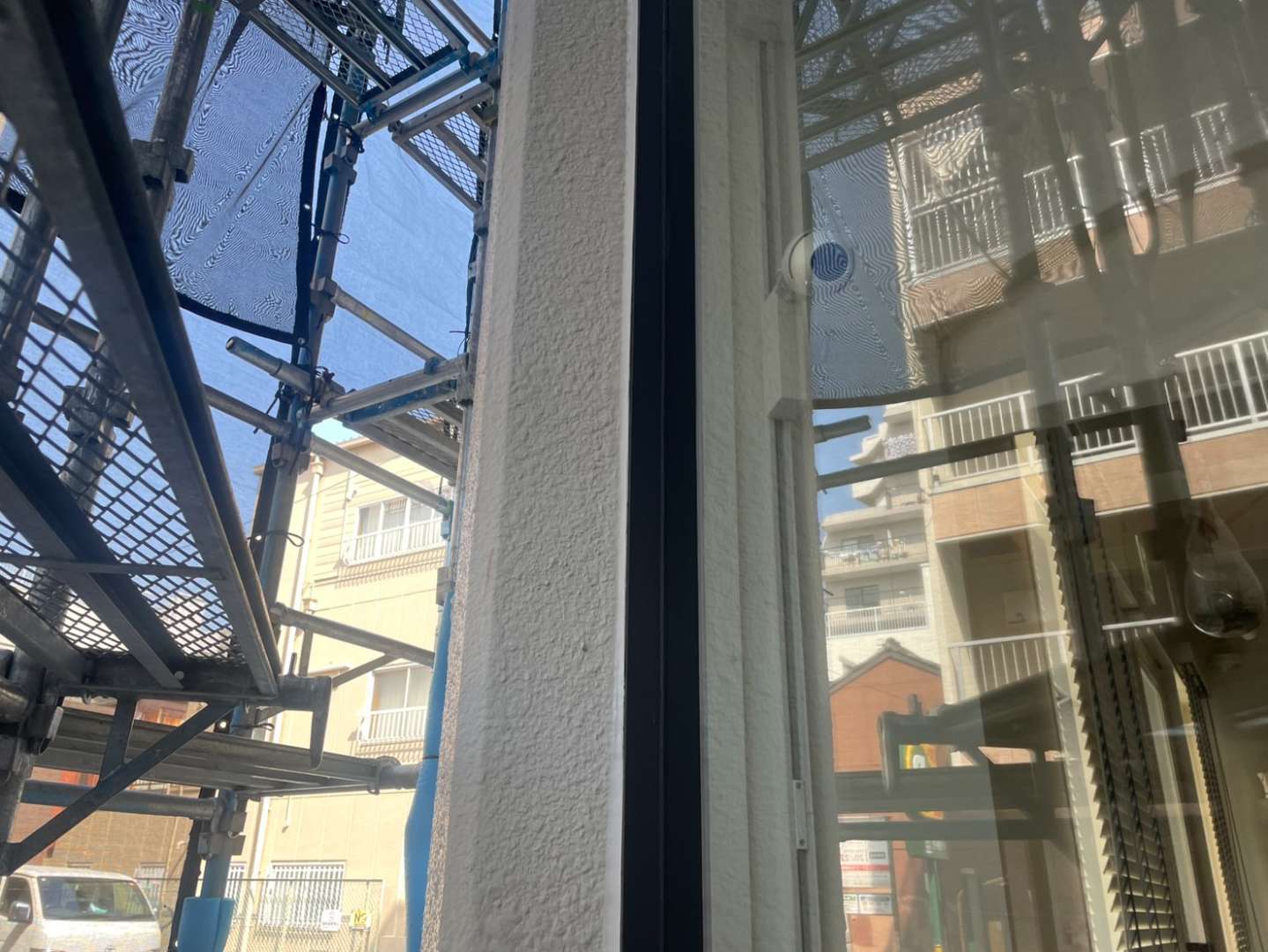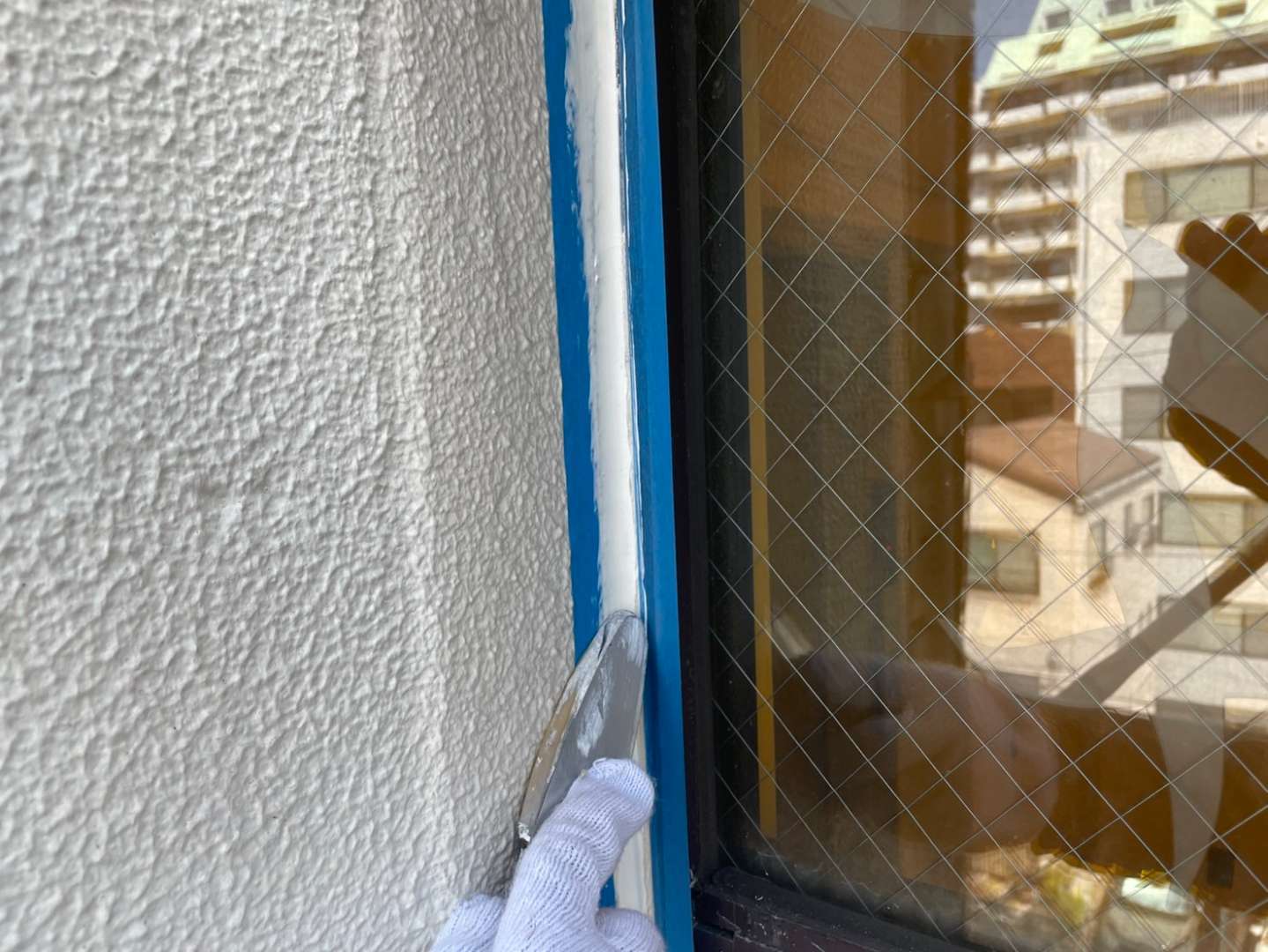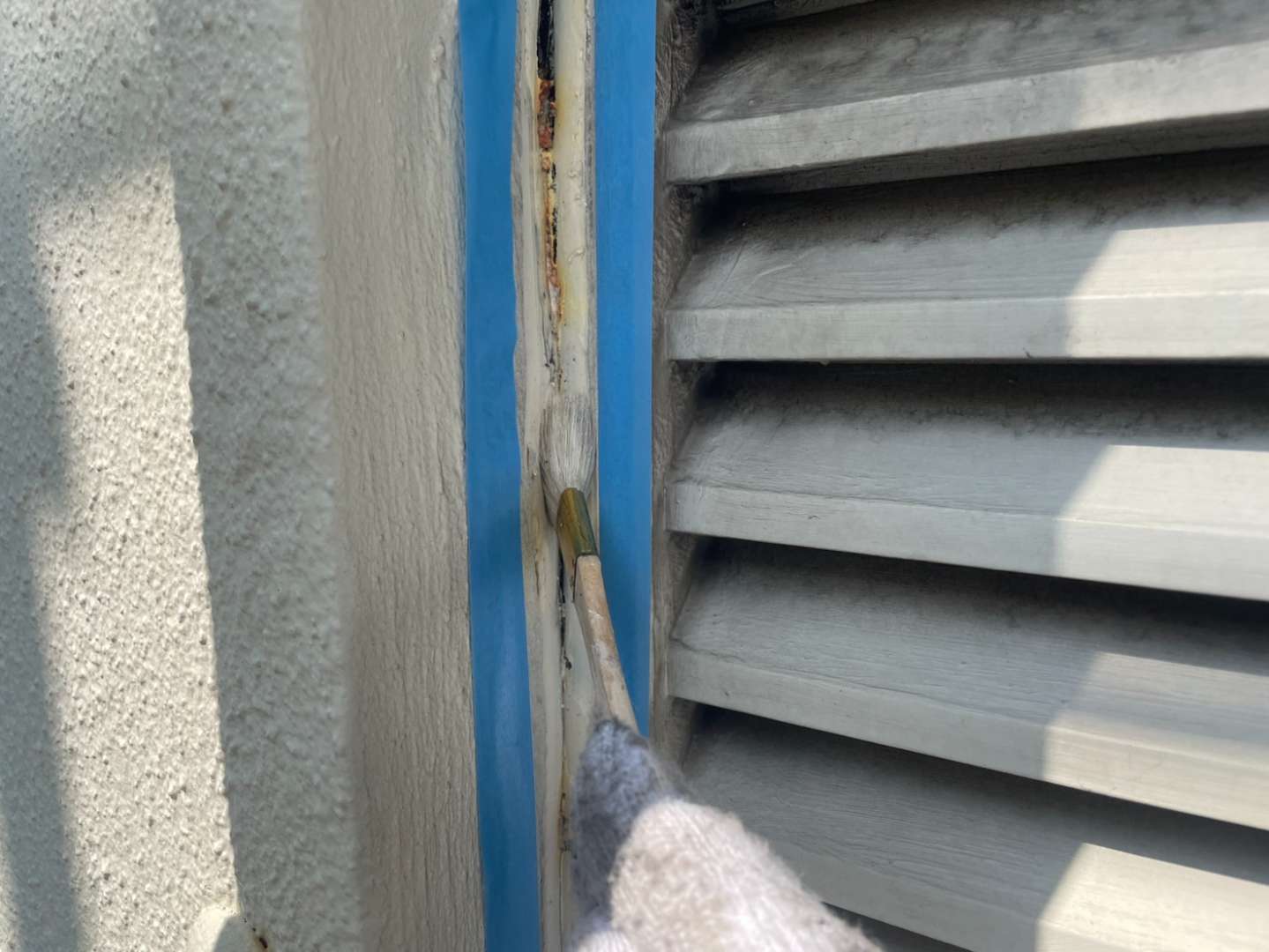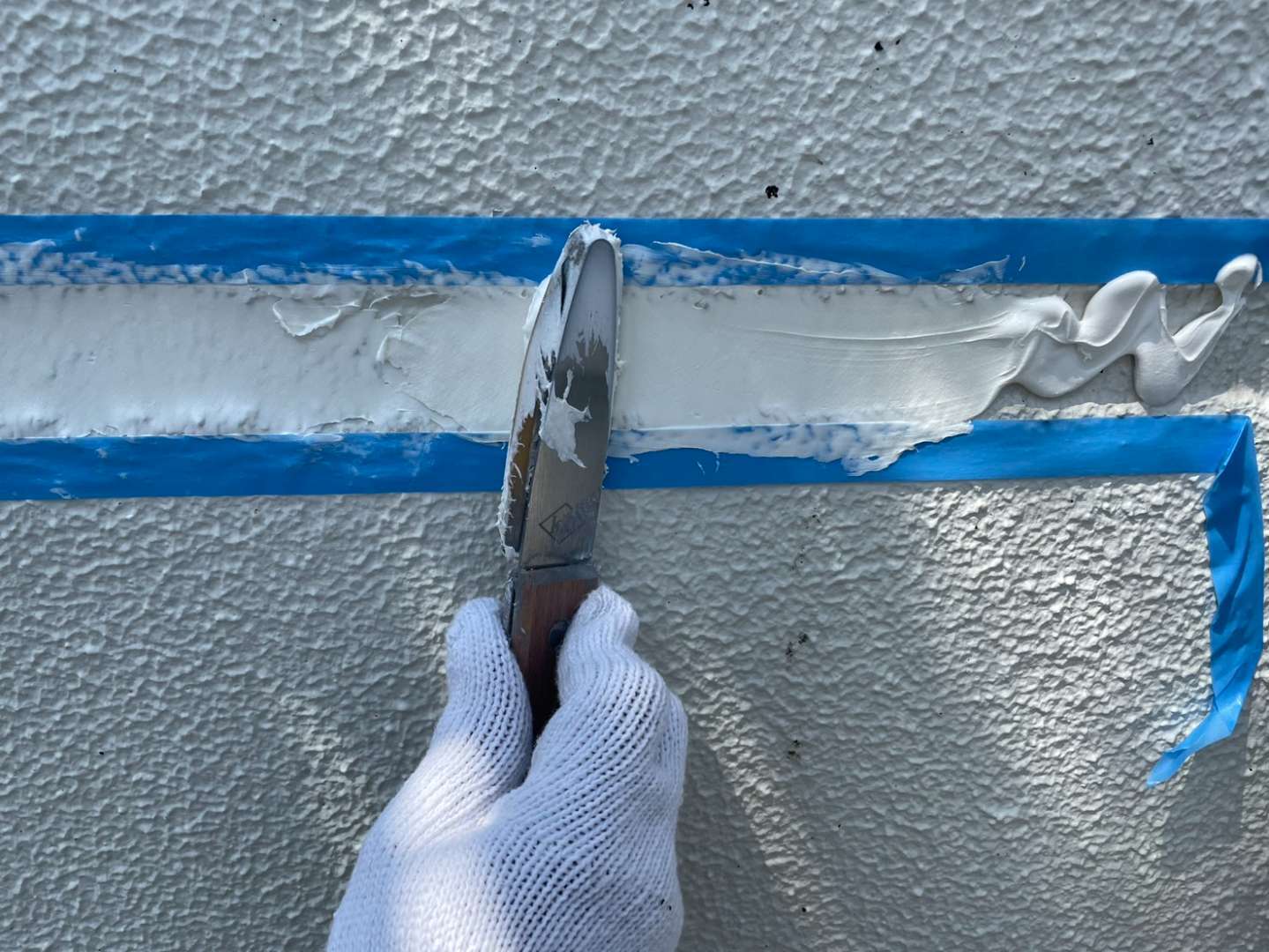 Jビル様の昨日の作業は、コーキング(シーリング)作業・屋上のトタン部の中塗り、上塗り塗装作業を行っていました。