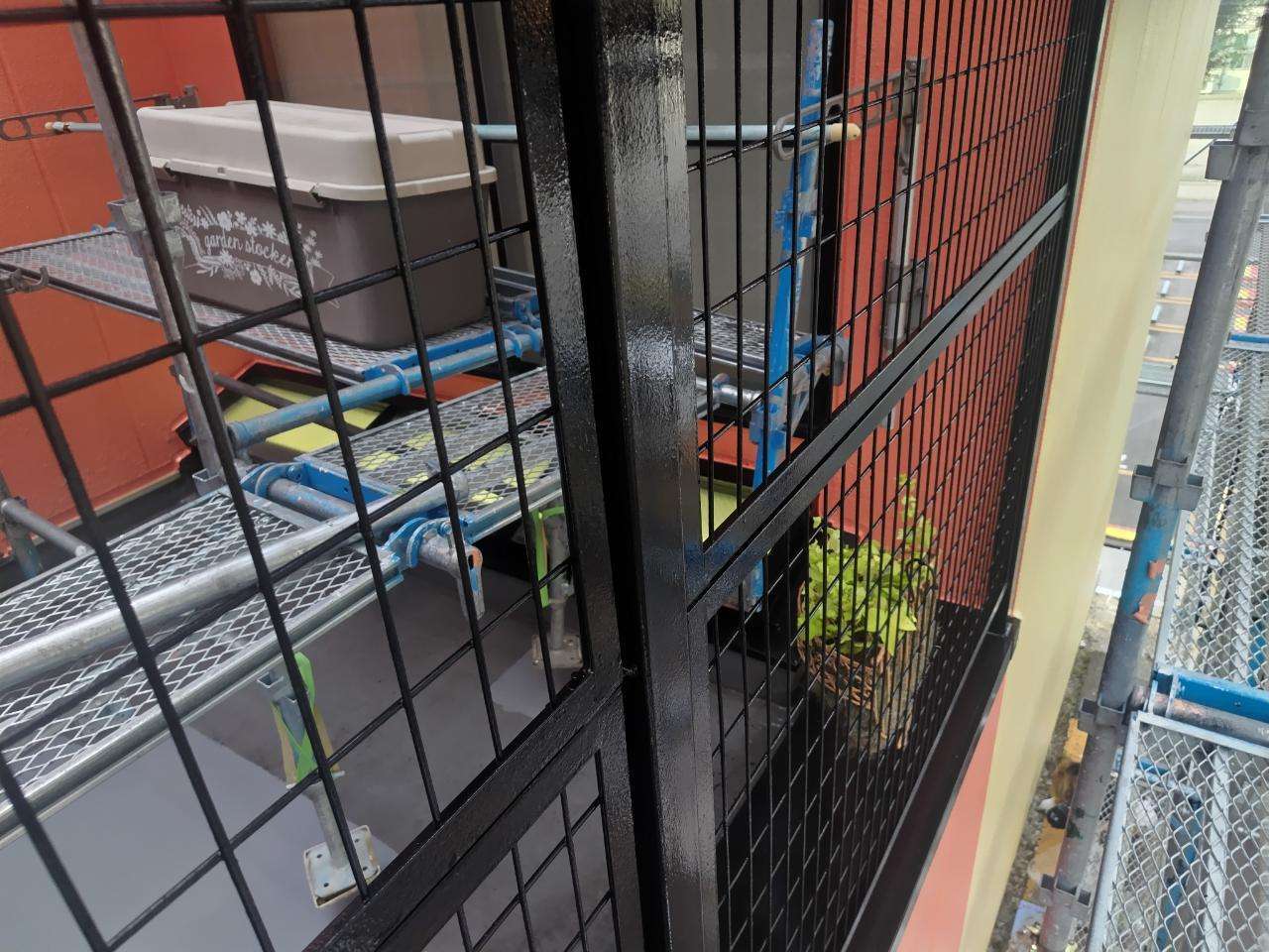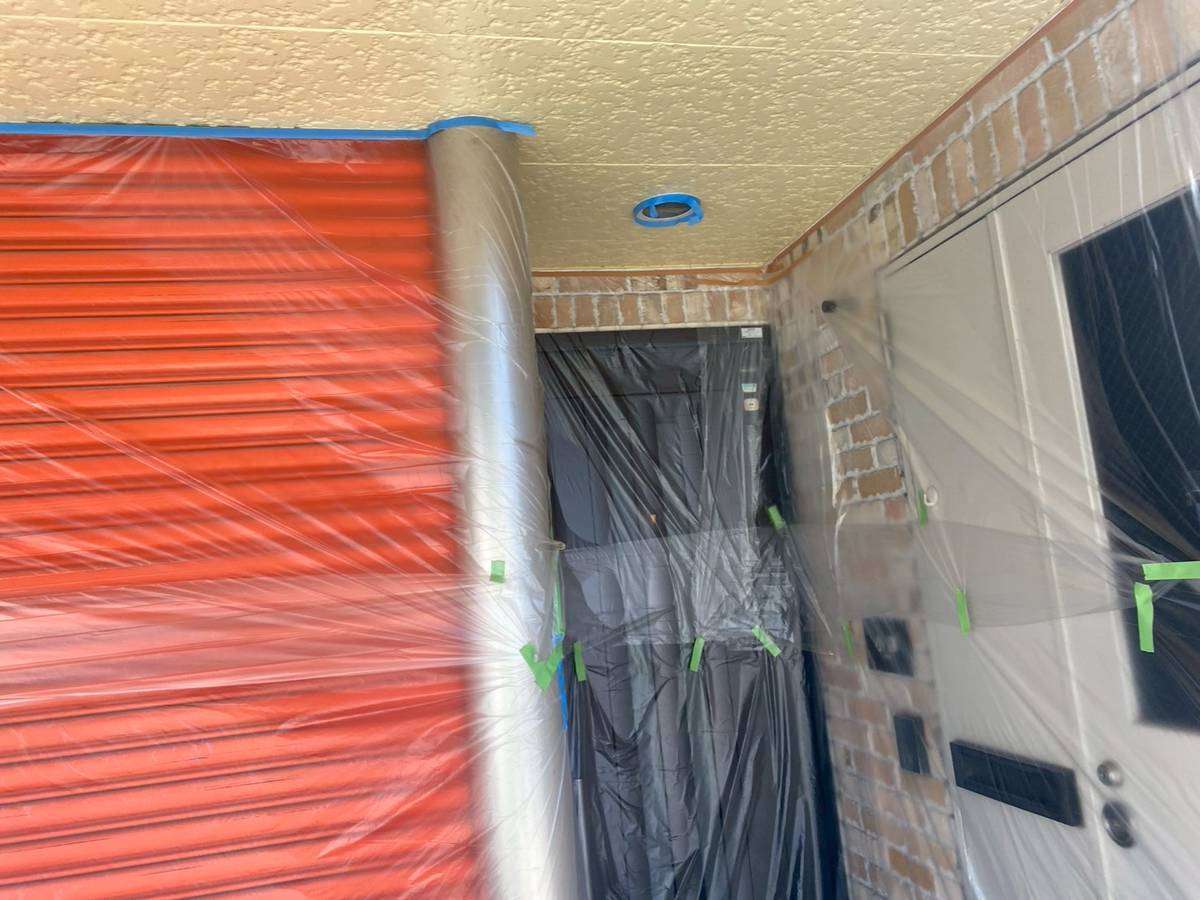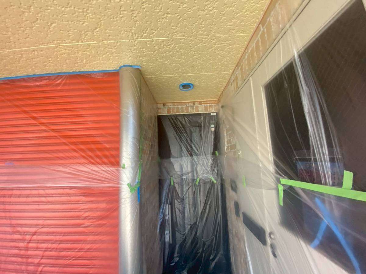 今日の作業は、1F店舗の軒天2回目塗装、バルコニーのトップコート塗装作業を予定しています。