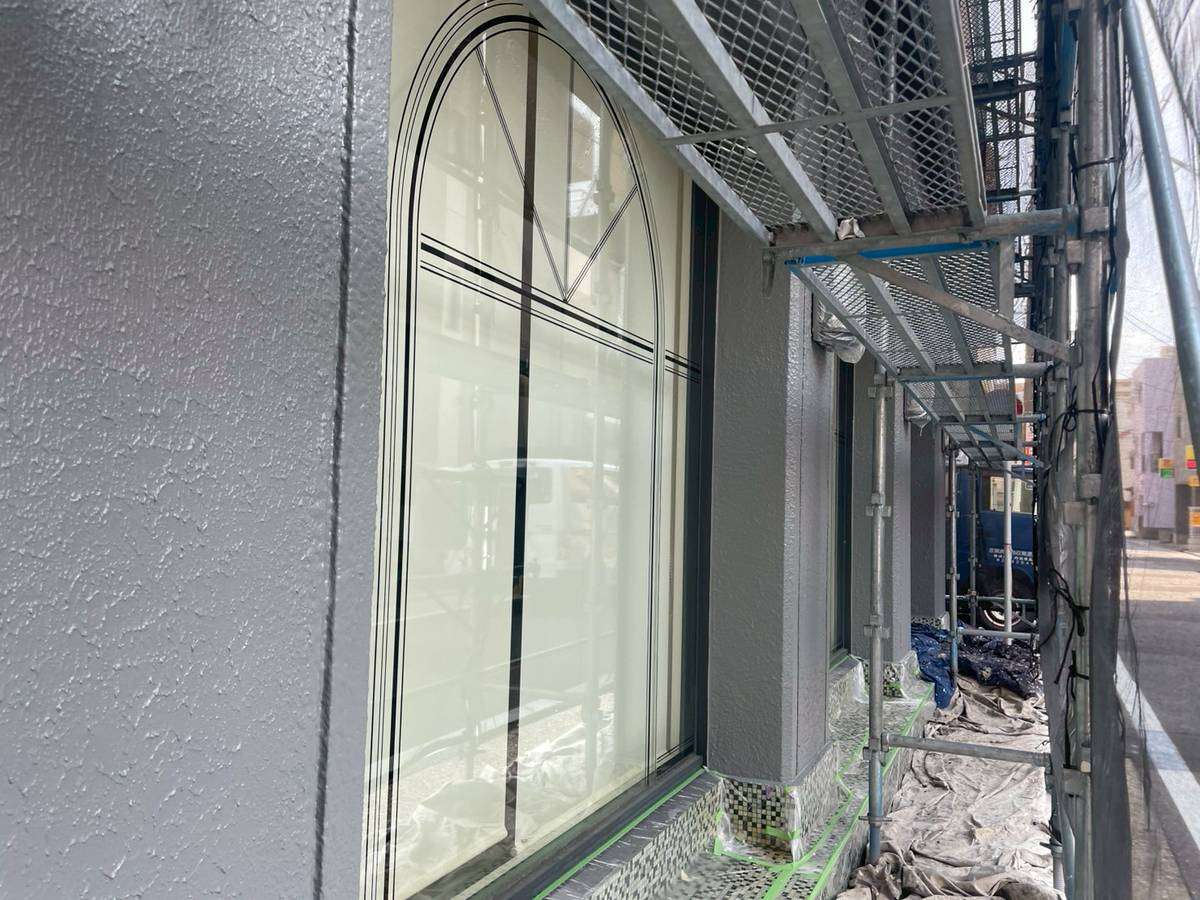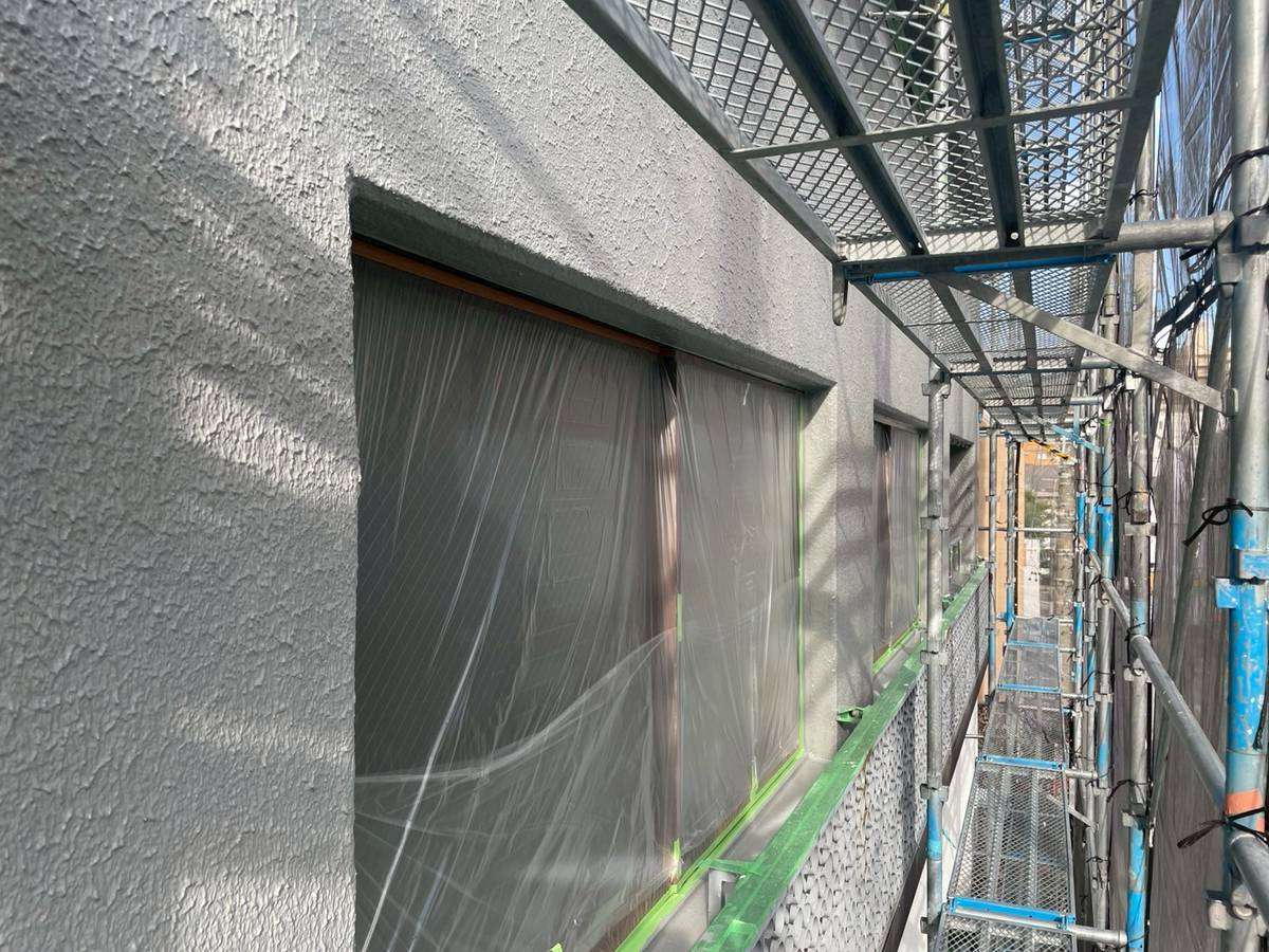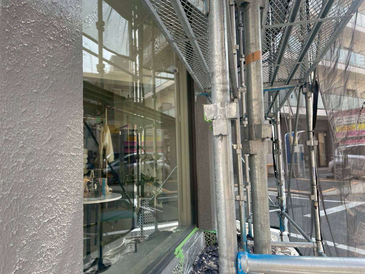 Jビル様邸の作業は、1階店舗部分・1階~3階(SR-428色)・4階~6階(LN-80色)の中塗り塗装作業まで進んでいます。