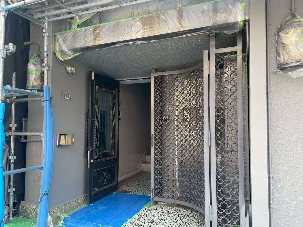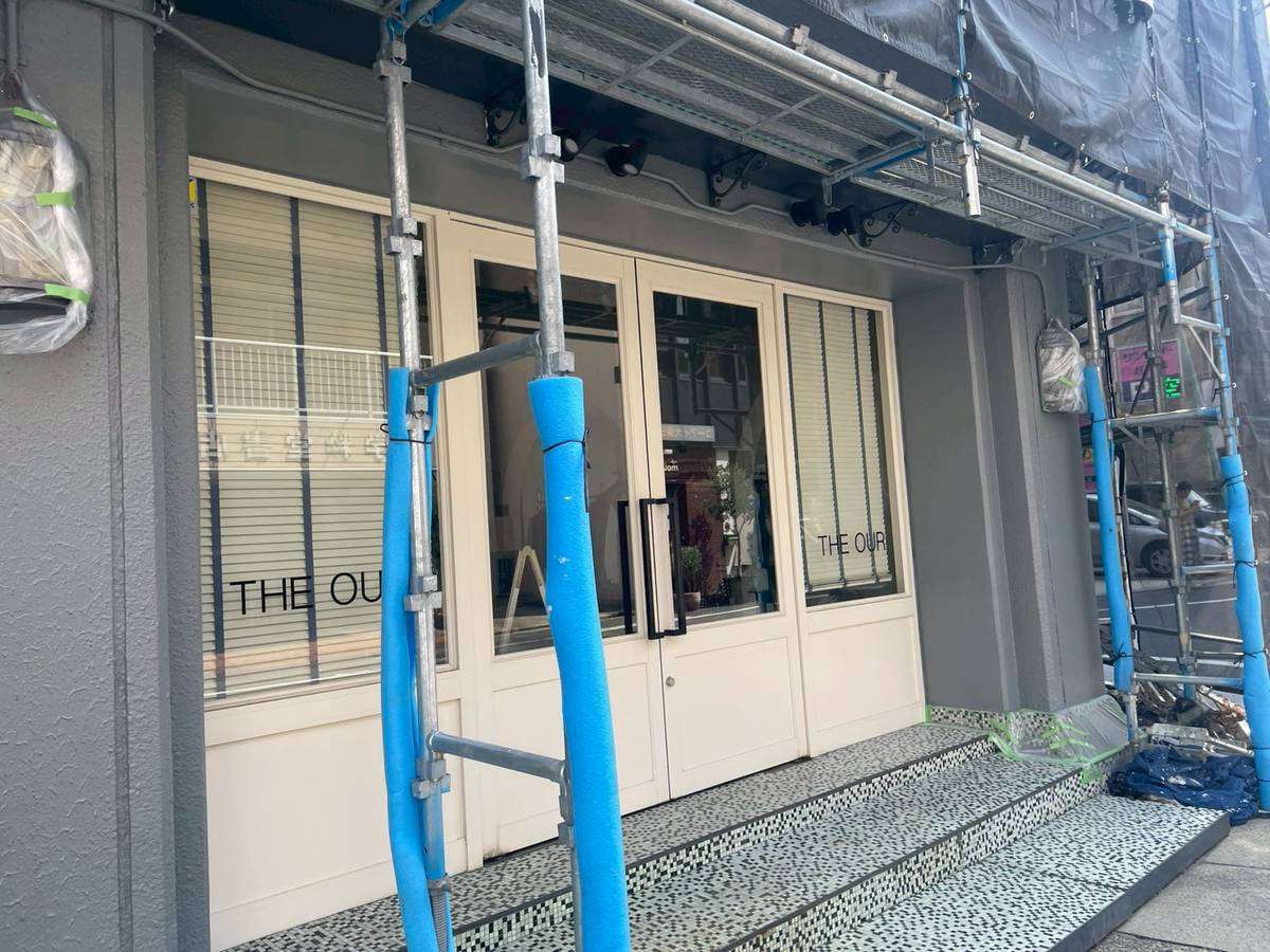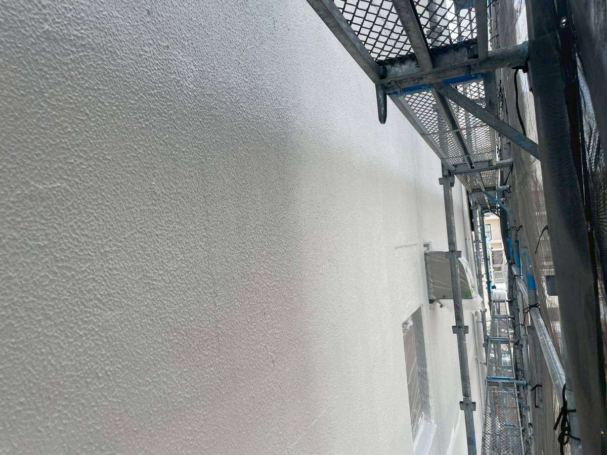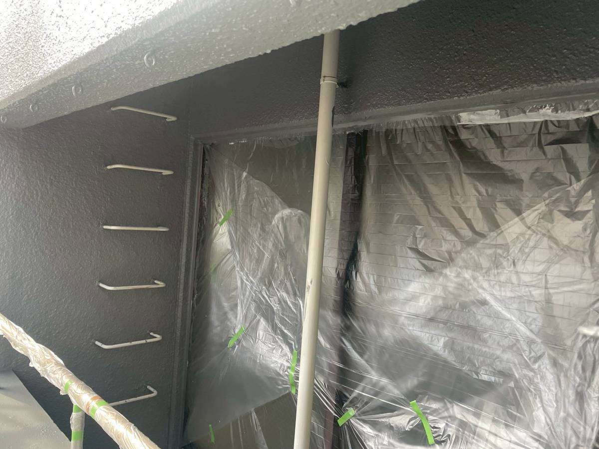 Jビル様邸の作業は、1階店舗部分・1階~3階(SR-428色)・4階~6階(LN-80色)の中塗り塗装作業まで進んでいます。