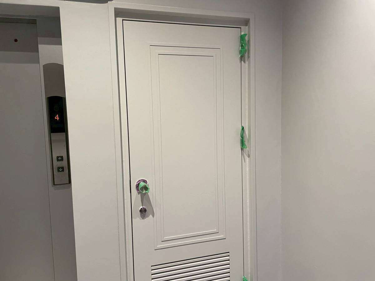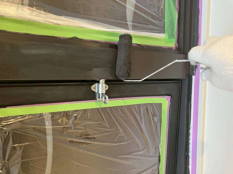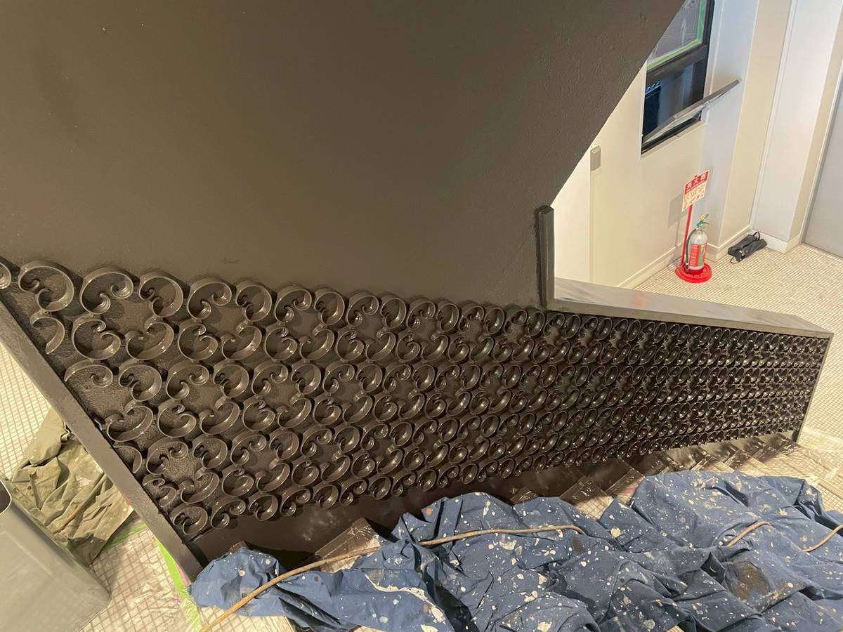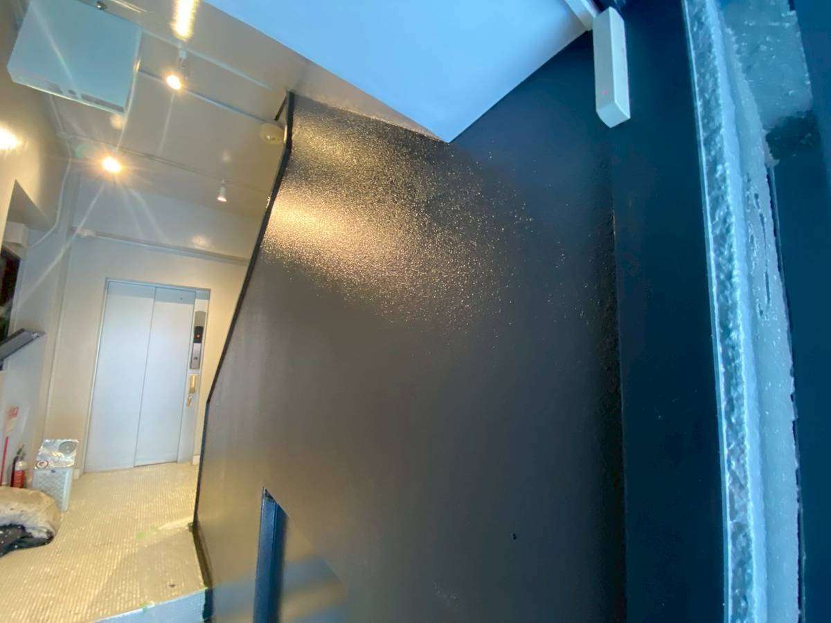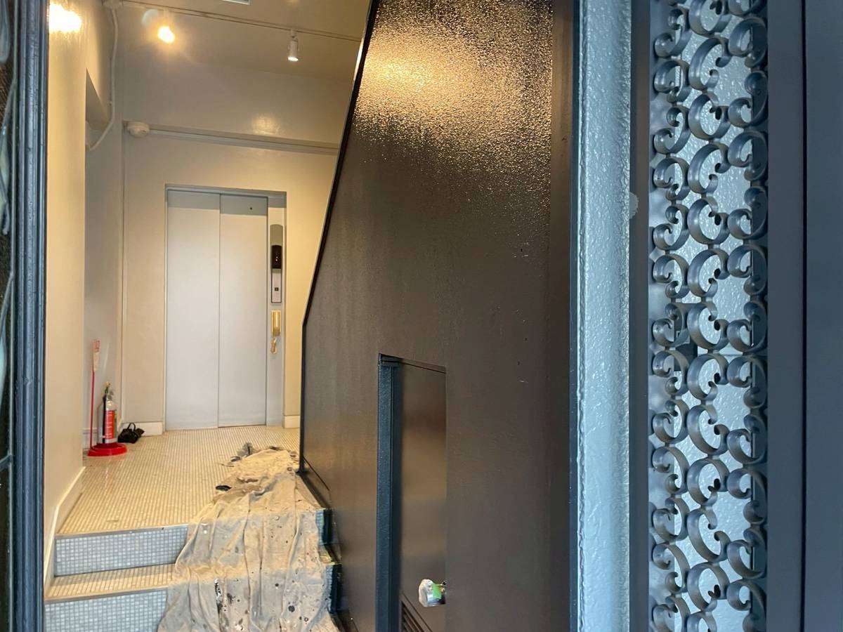 Jビル様の昨日までの作業内容は、階段室の窓枠のペーパー掛けと上塗り1回目塗装、階段室手すり、壁部の中塗り塗装、上塗り塗装、鉄扉のペーパー掛け、塗装作業を行っていました。