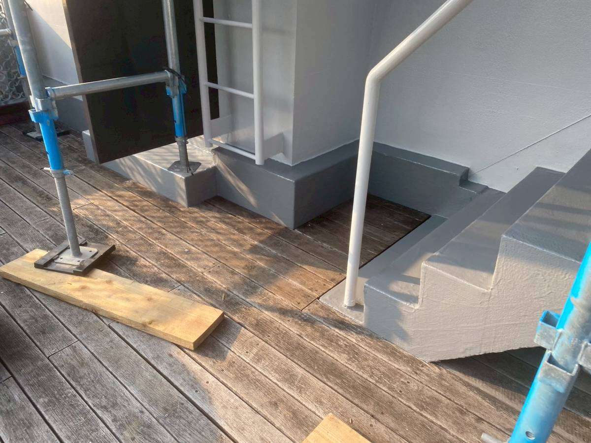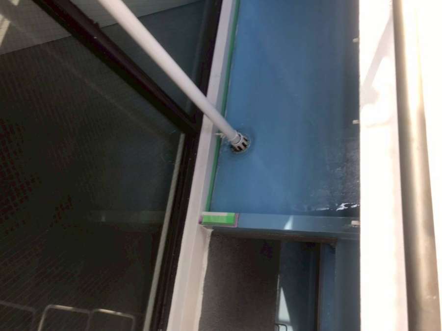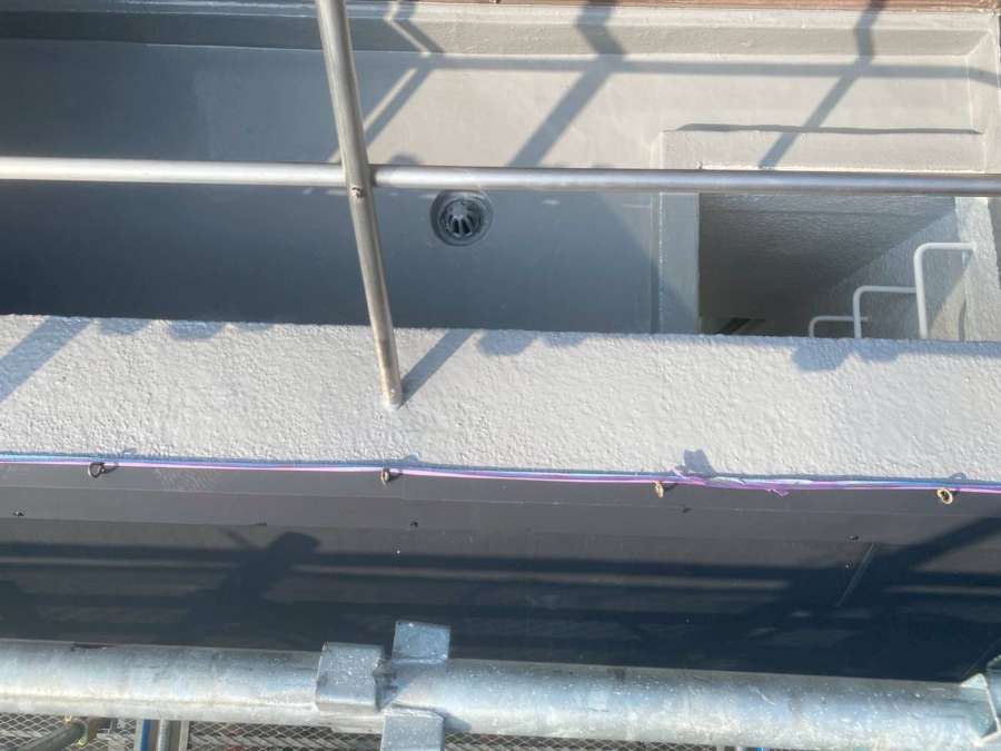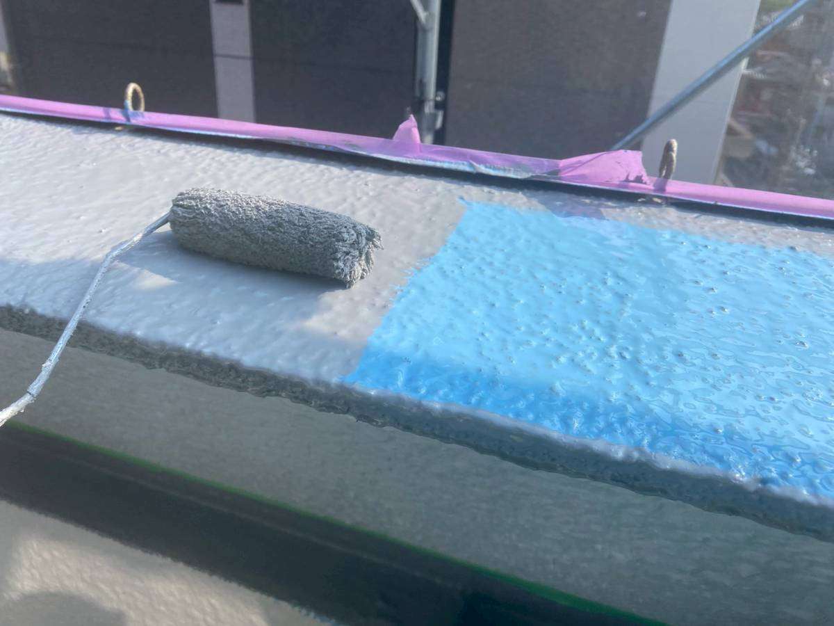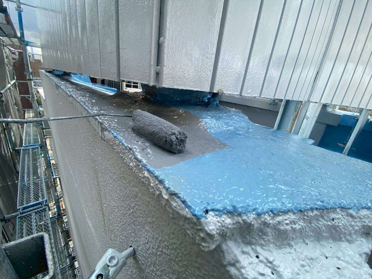 付帯部塗装のサッシ廻りのプライマー塗装・手すりの上塗り1回目・2回目塗装、2階~5階のベランダ防水のウレタン樹脂1層目塗装、屋上と塔屋のトップコート塗装作業を行っていました。
