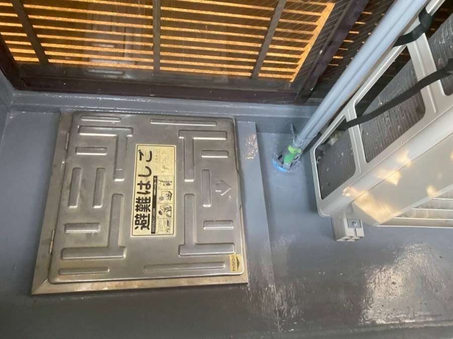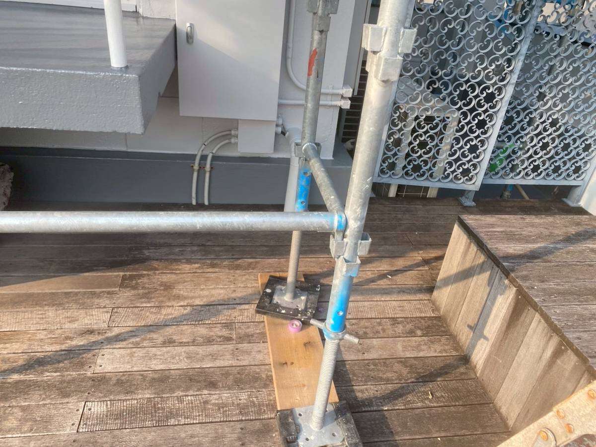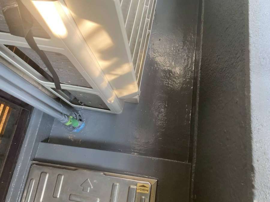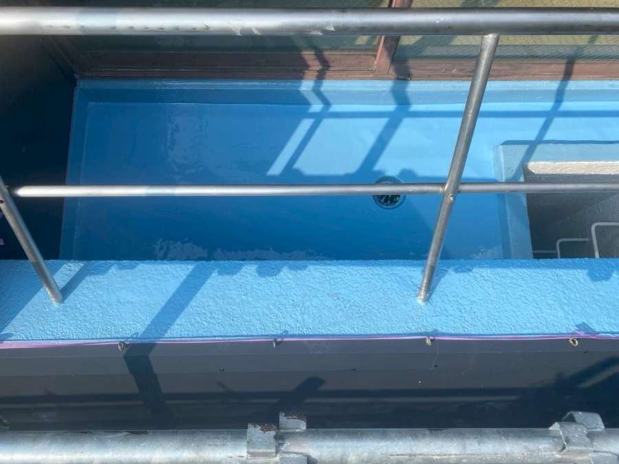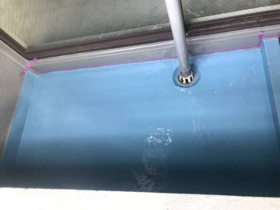 付帯部塗装のサッシ廻りのプライマー塗装・手すりの上塗り1回目・2回目塗装、2階~5階のベランダ防水のウレタン樹脂1層目塗装、屋上と塔屋のトップコート塗装作業を行っていました。
