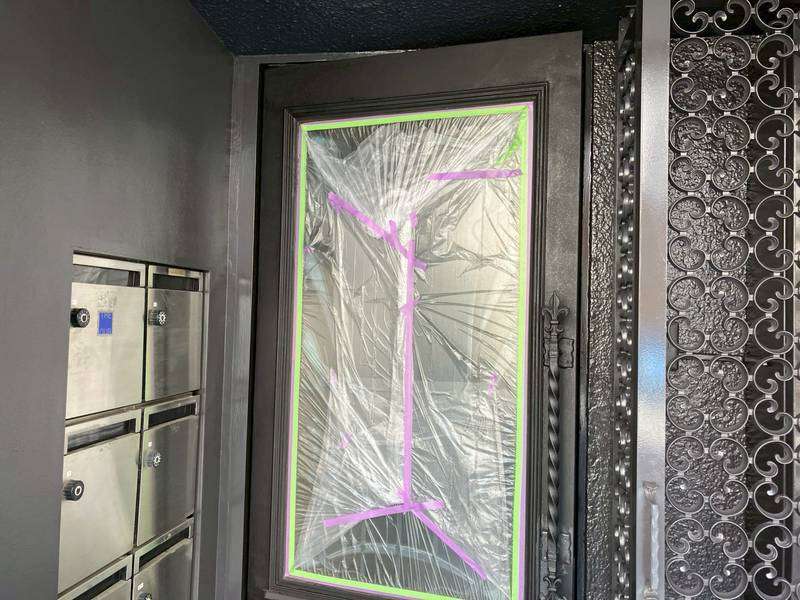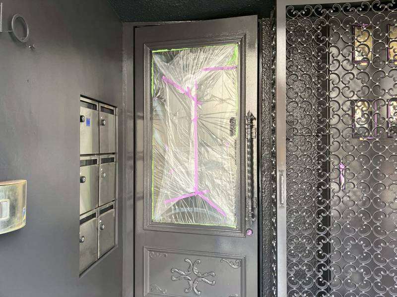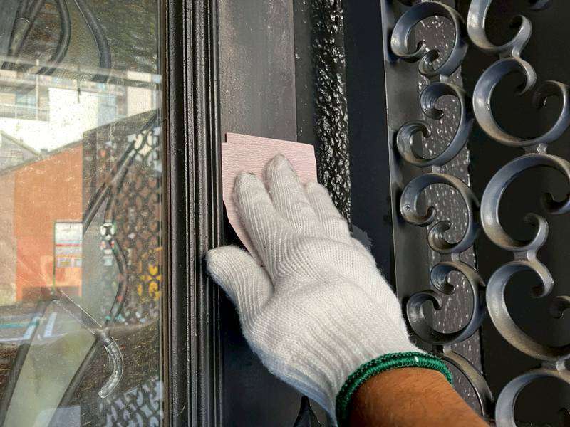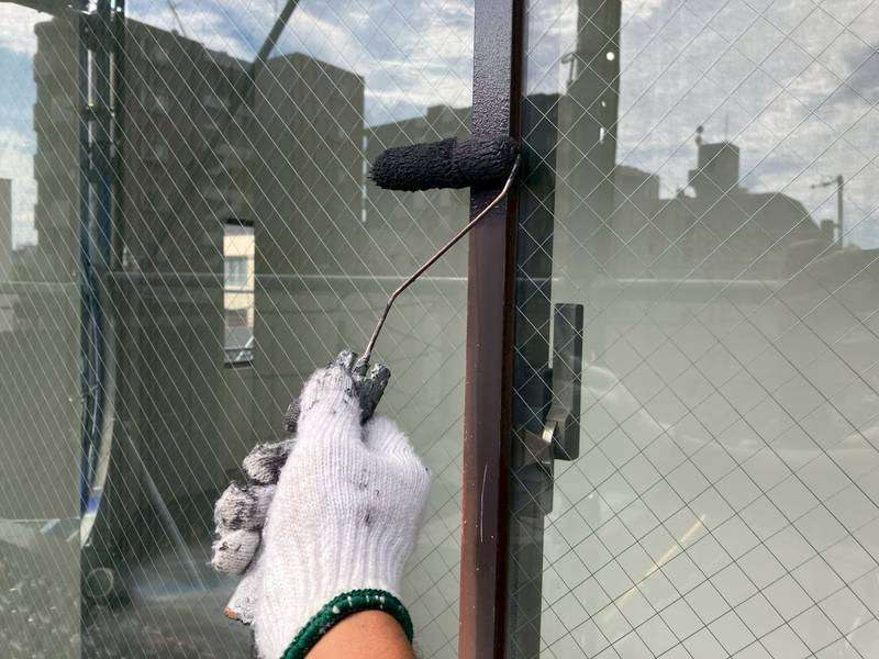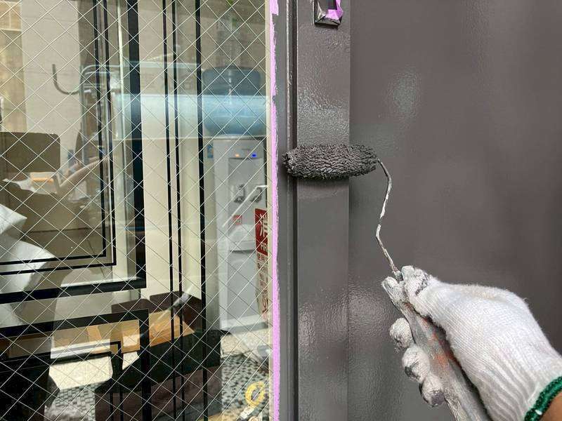 Jビル様の昨日の作業は、付帯部塗装の1階店舗部ドアの下塗り・ペーパー掛け・上塗り1回目・2回目塗装と窓サッシ廻りの上塗り1回目塗装、鉄扉・配電盤の上塗り2回目塗装作業を行っていました。