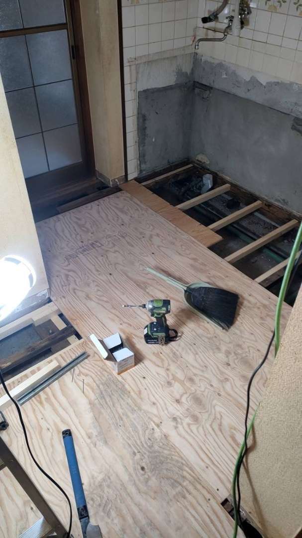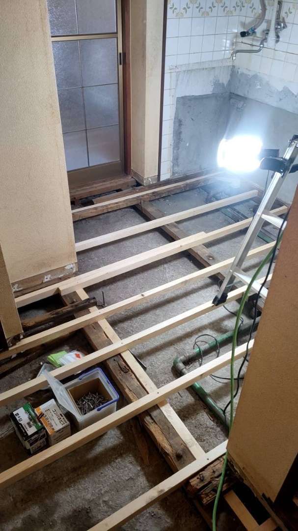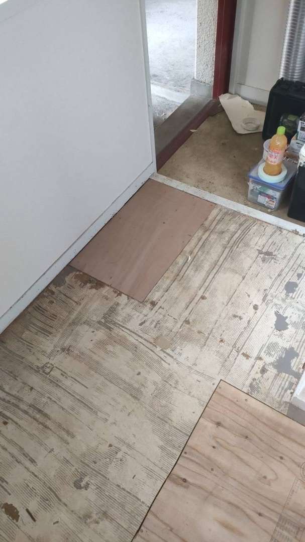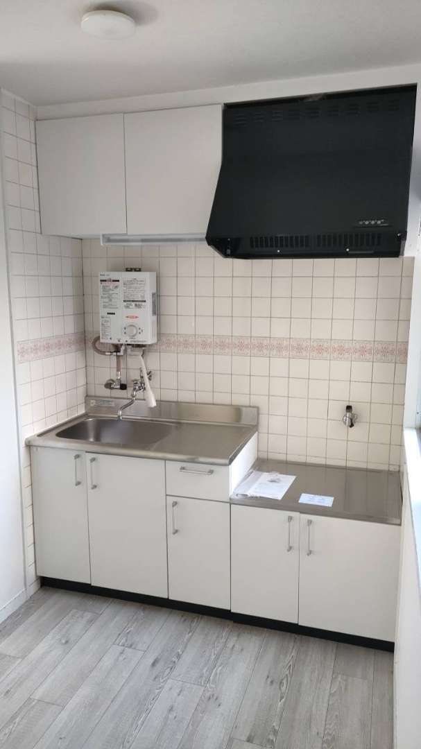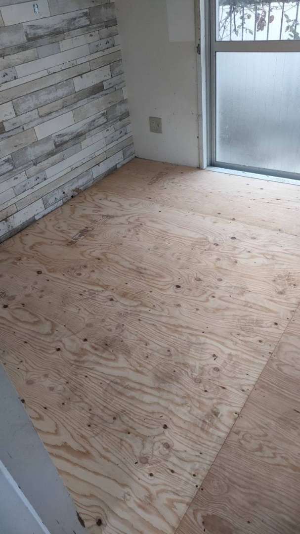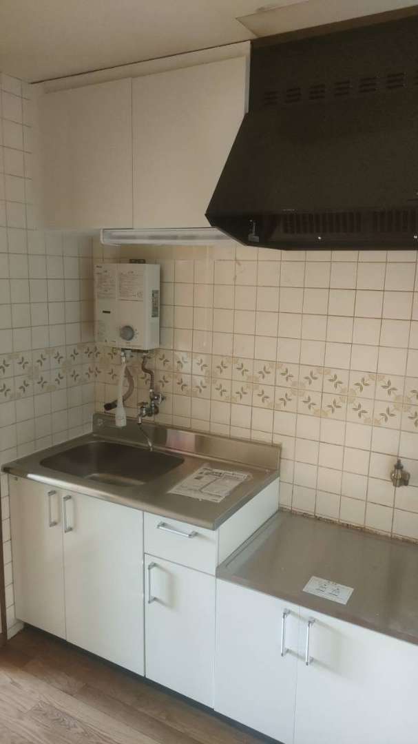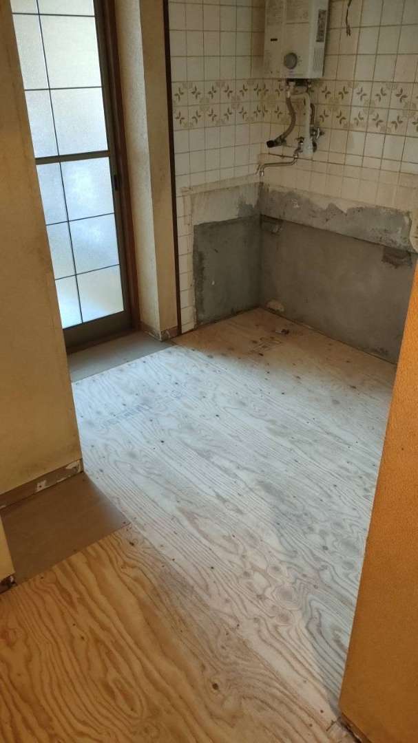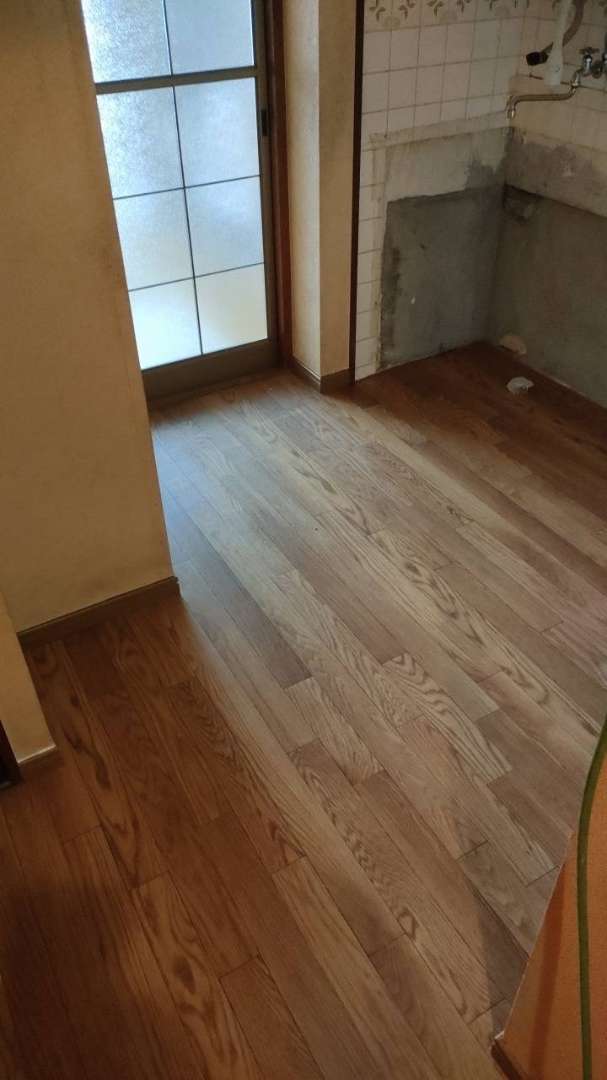 2室のキッチンの取替え、床の造作・張替え、クッションフロア・タイルフロア貼り、クロス貼替えを施工しました。作業は、完了です。